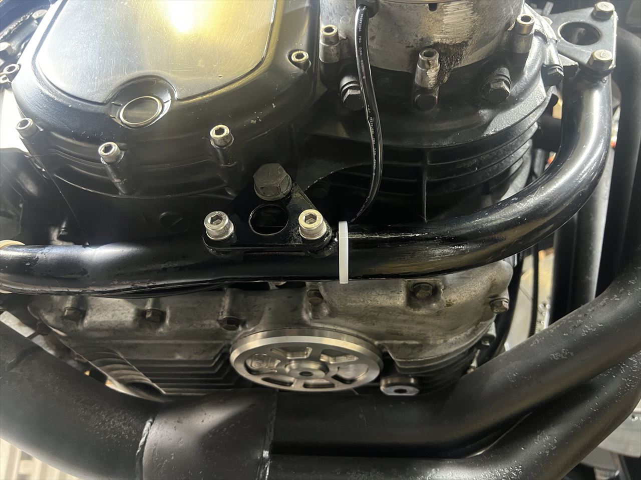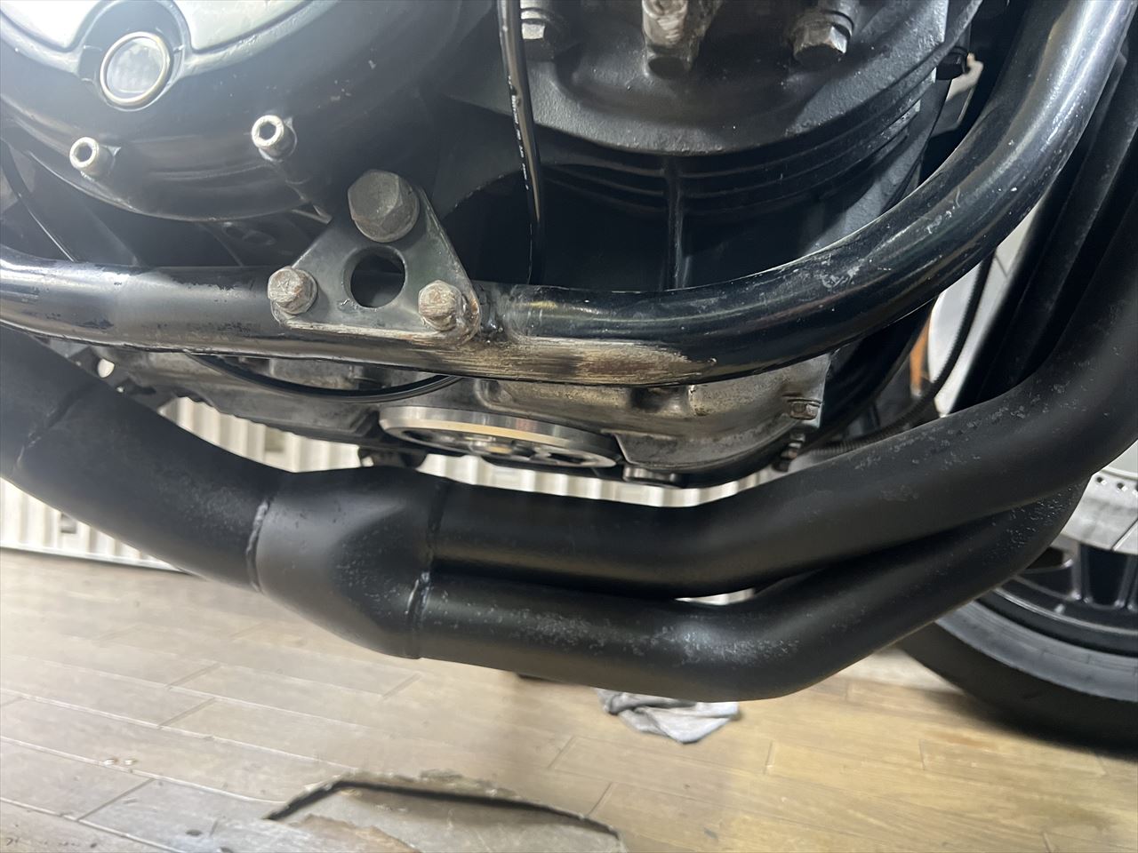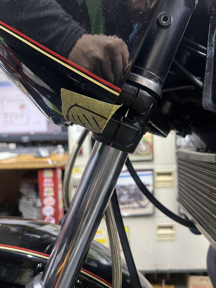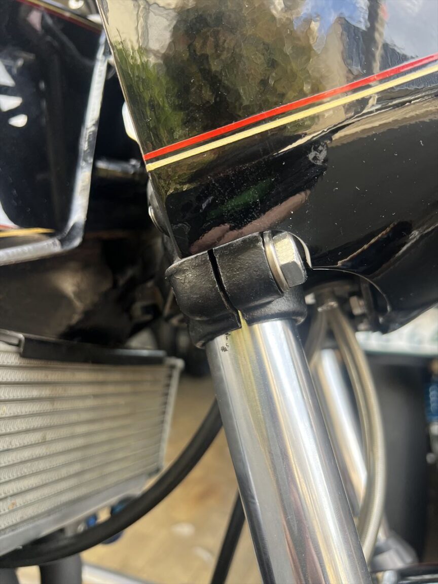最後に転倒時に付いた右フレーム下側の傷を点検します。