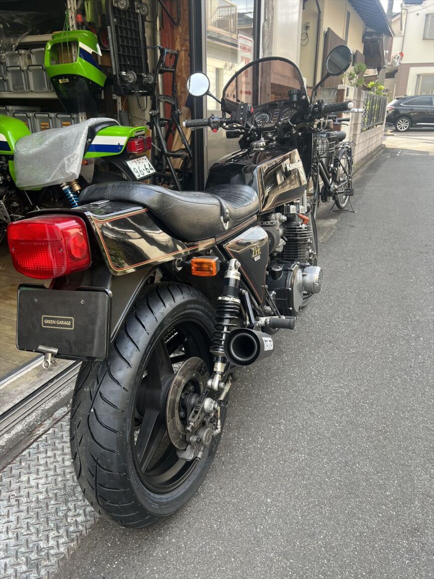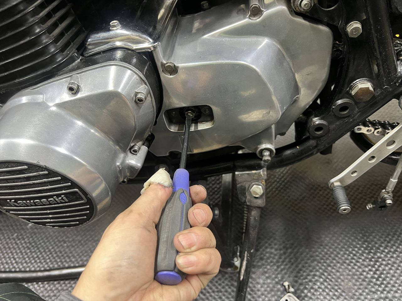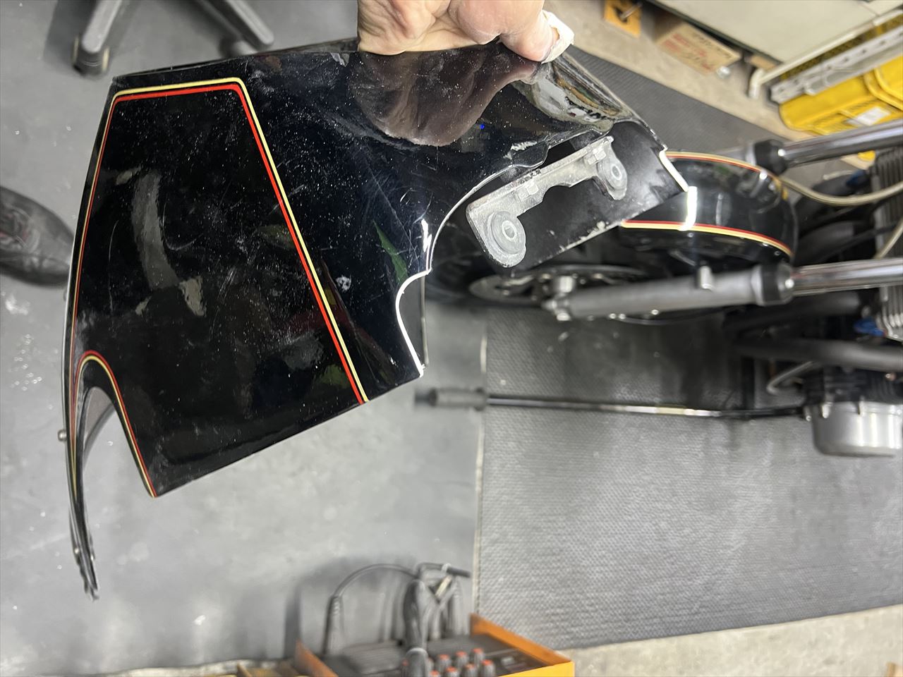 最後に転倒時に付いた右フレーム下側の傷を点検します。