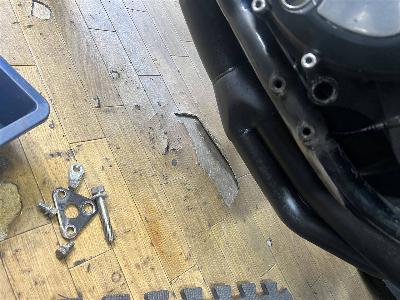 傷ついたマウントプレートも外し、フレームパイプを点検します。幸いに表面が少し擦れただけでした。