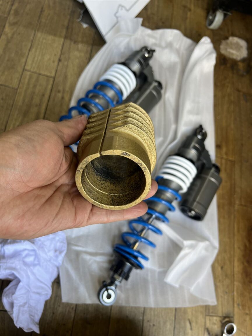 このワークスパフォーマンスは使用歴の少ない長期保管品だったのですが、取り付けてまもなくオイル漏れしてきていました。今では左右両方とも漏れています。