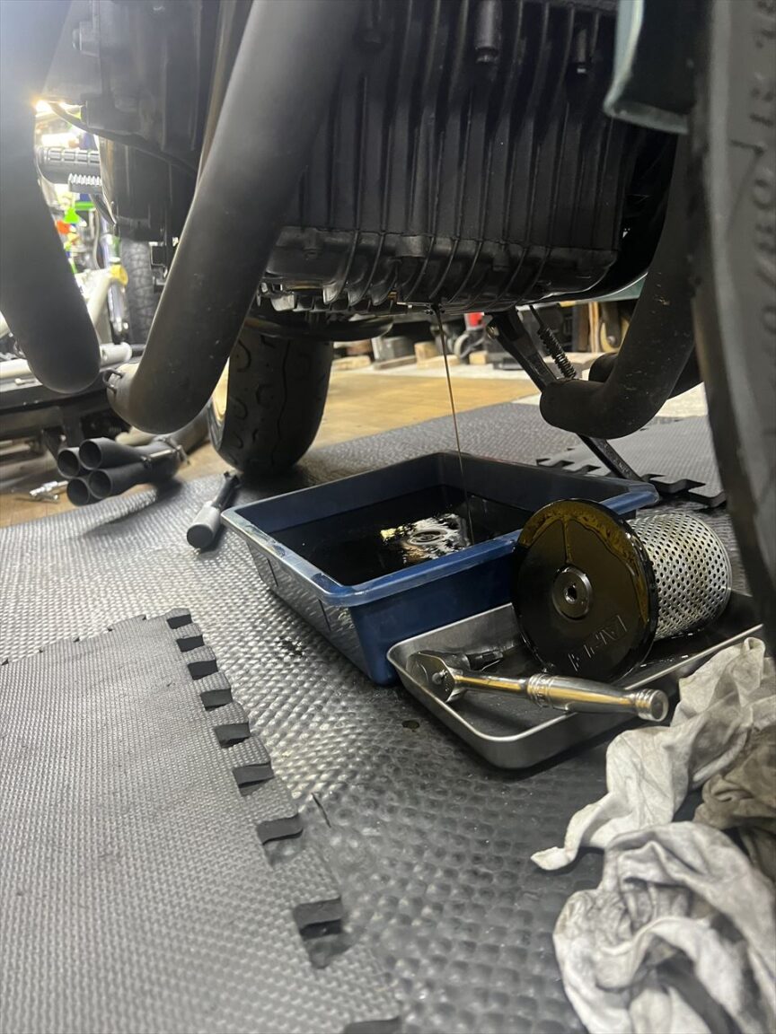 エンジンオイルを交換します。マフラーは集合部から後ろだけ外します。