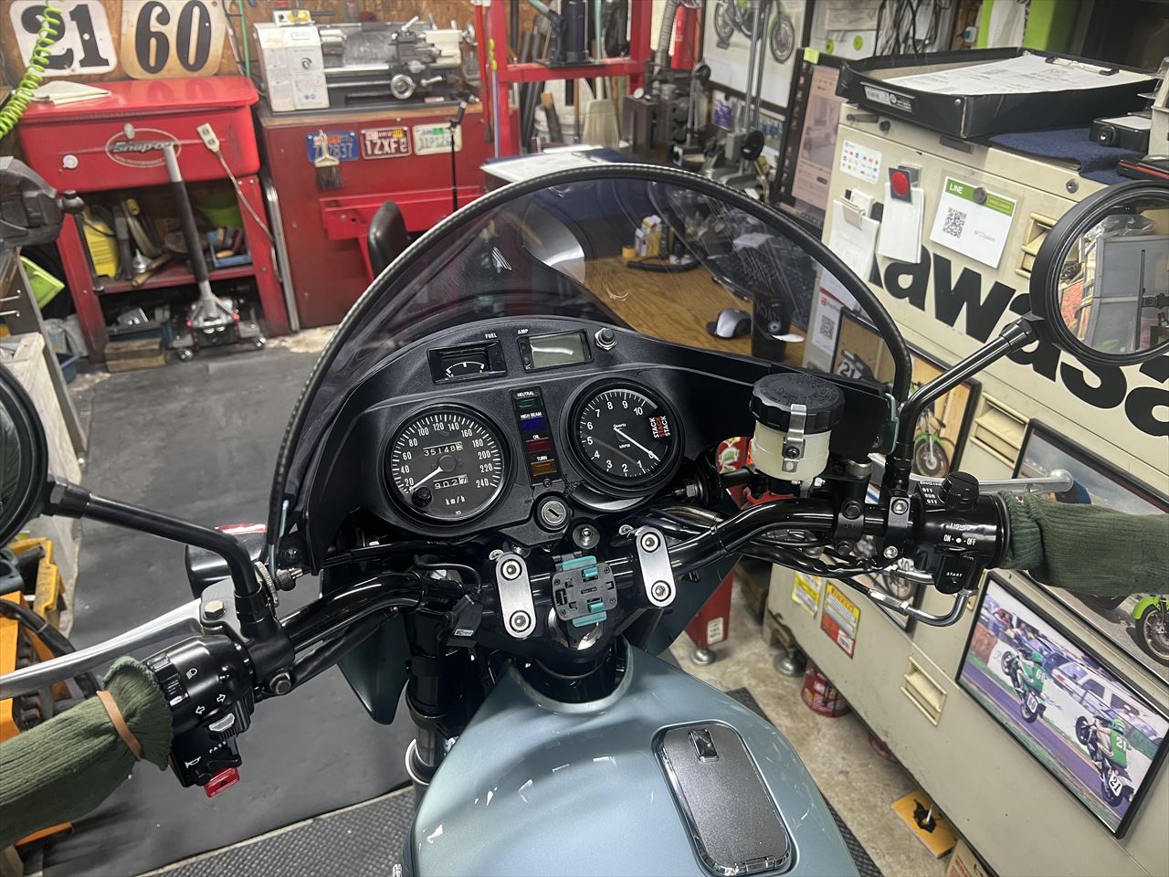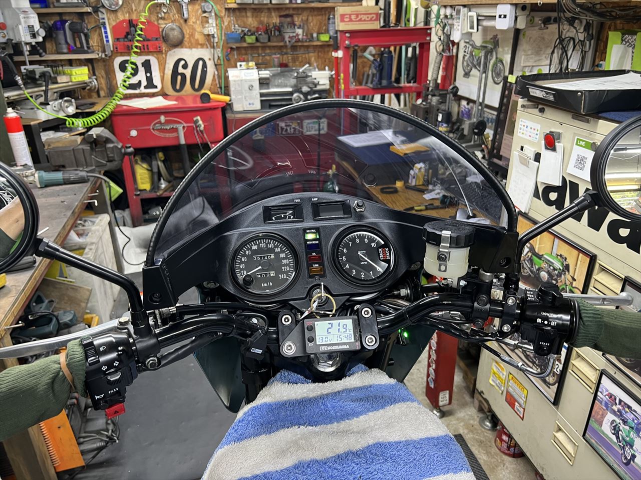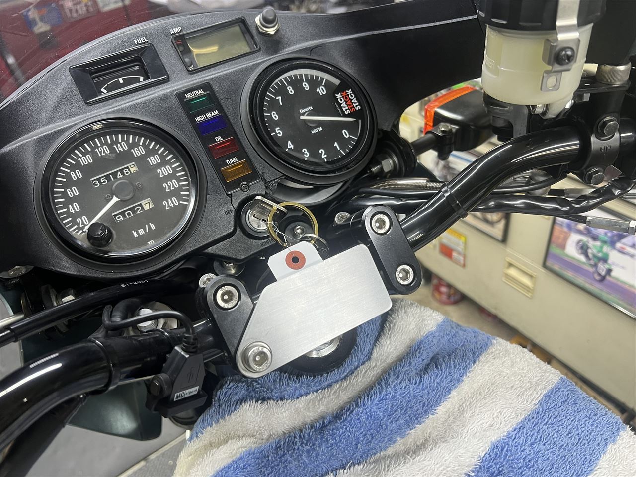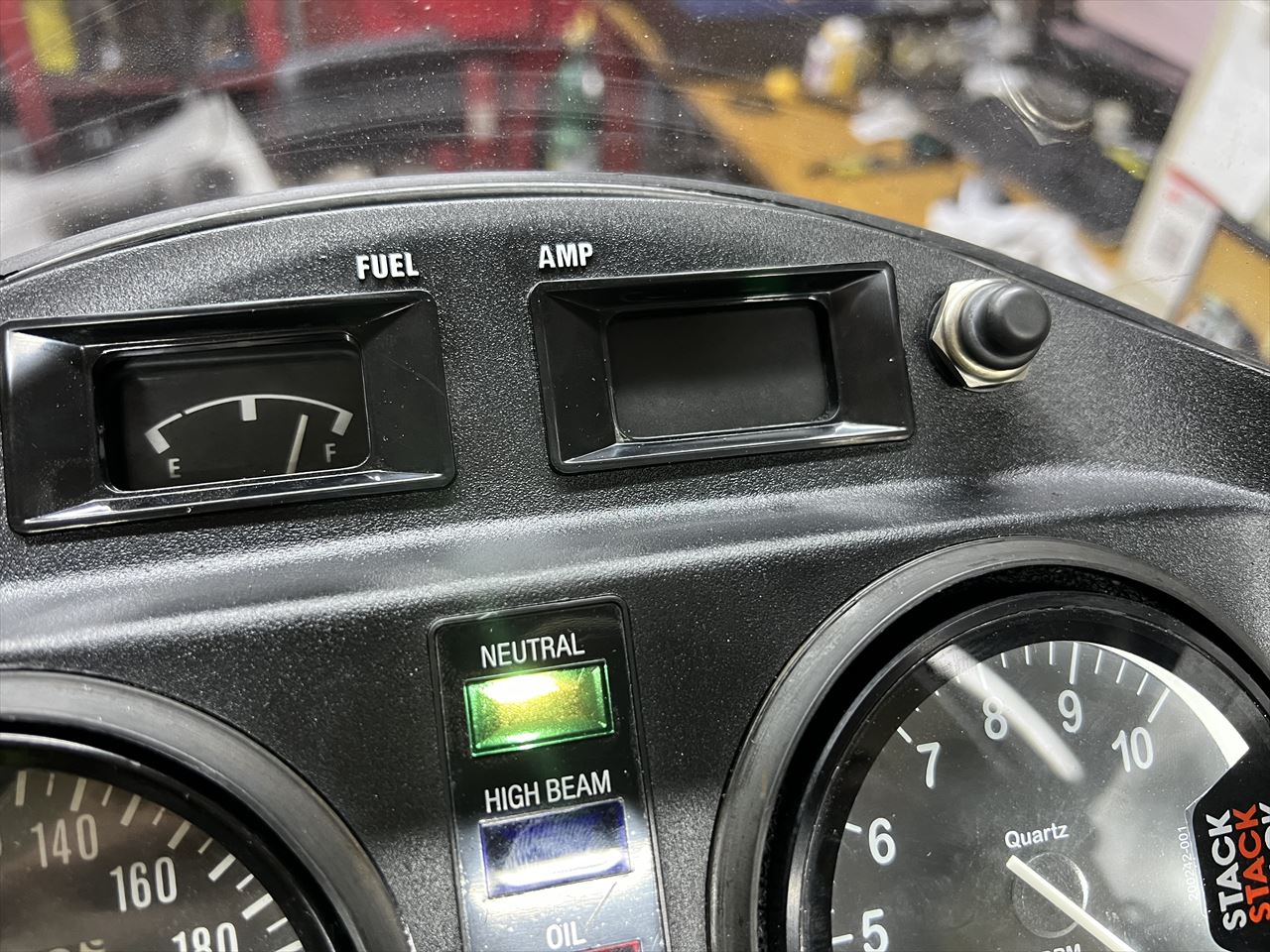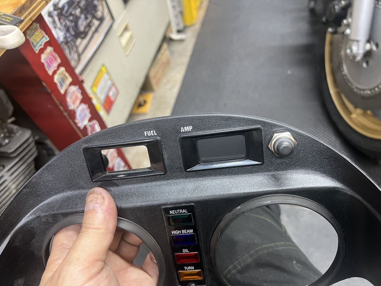新しいインナーカウルの取り付けには小加工が必要です。タコメーターのオプションボタンを取り付け、アンメーターの窓はパネルで塞ぎます。