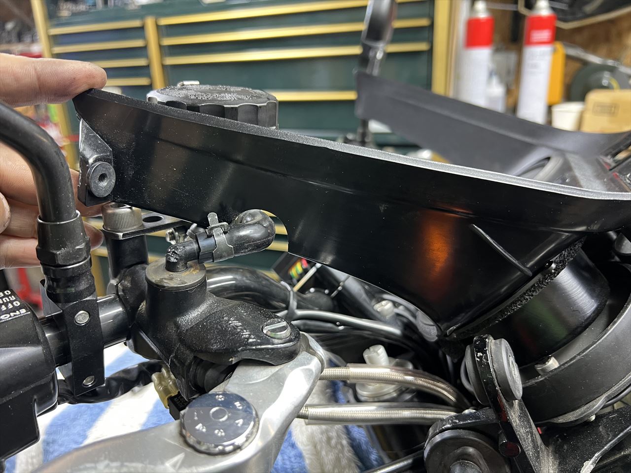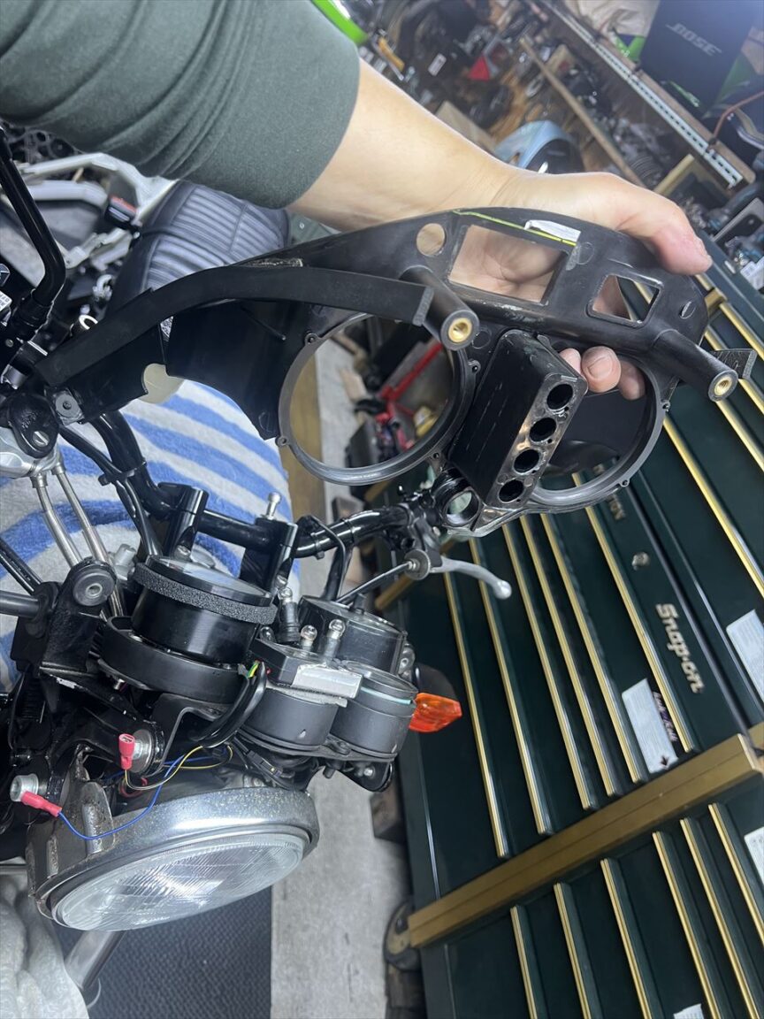 ヨシムラのテンプメーターをインナーカウル内に内蔵していましたが、メンテナンス性を良くするために今回は外付けにします。そこでハンドルバークランプのところにステーを新設します。