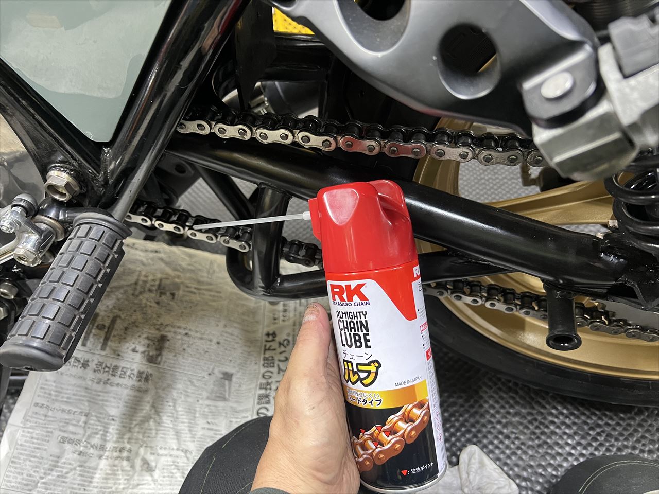 チェーンにはチェーンルブを塗布します。今回車検と同時にホイールまで交換したので、明日チェック走行して最終確認です。