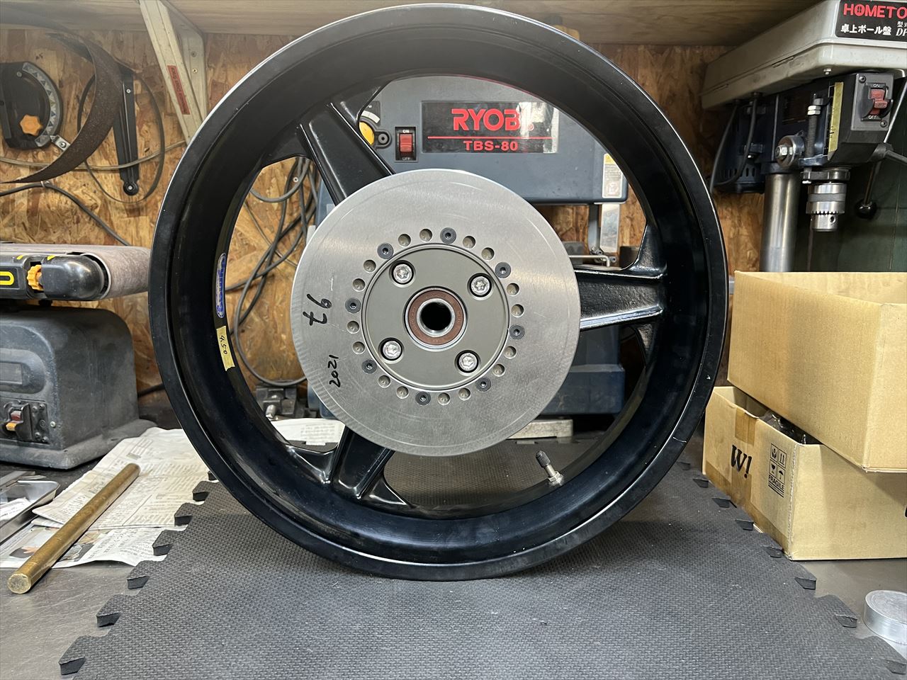 ダイマグ用スプロケットキャリアのアルマイトが完成しました。右の6個がスプロケキャリアです。上段はスプロケットが外側に付くタイプでアウタータイプと称しています。キャリアの厚み分だけスプロケットは外側にオフセットされ、今回製作したものは厚さが10ミリです。下段はダイマグ標準と同じくスプロケットが内側に付くタイプでインナータイプと称しています。左端はリヤS1ローター用のインナーローター兼ハブです。