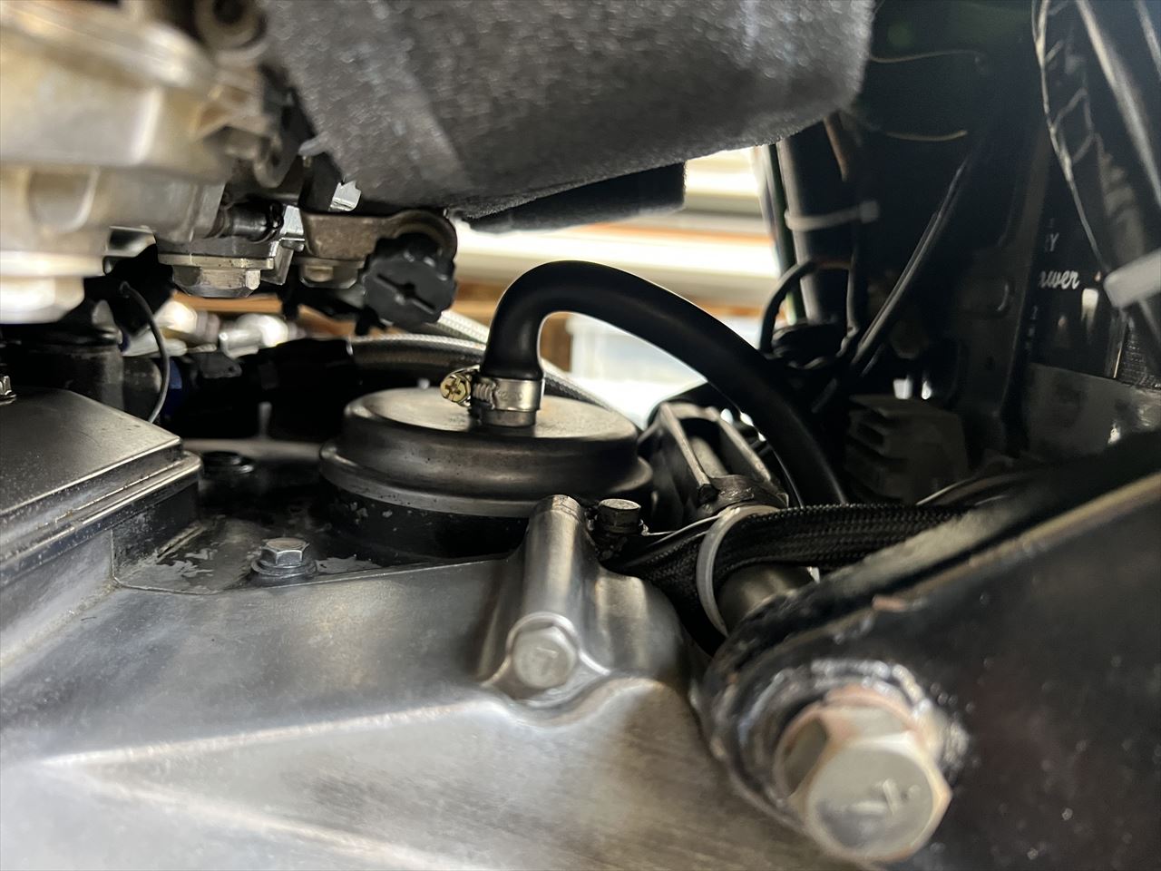 ブローバイホースは90°に曲がったホースを使ってシンプルレイアウトにします。
