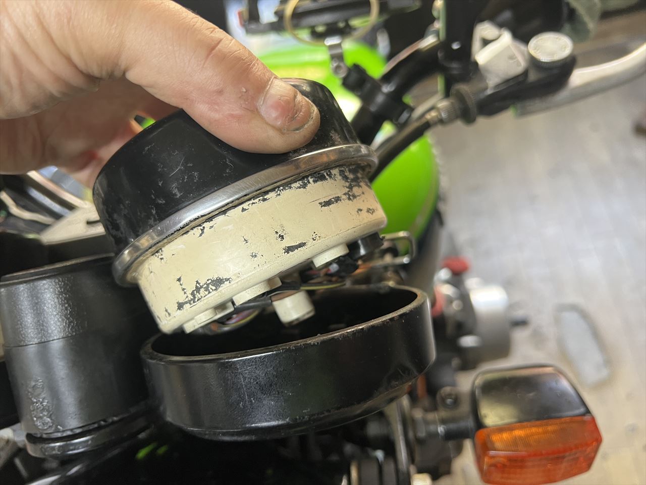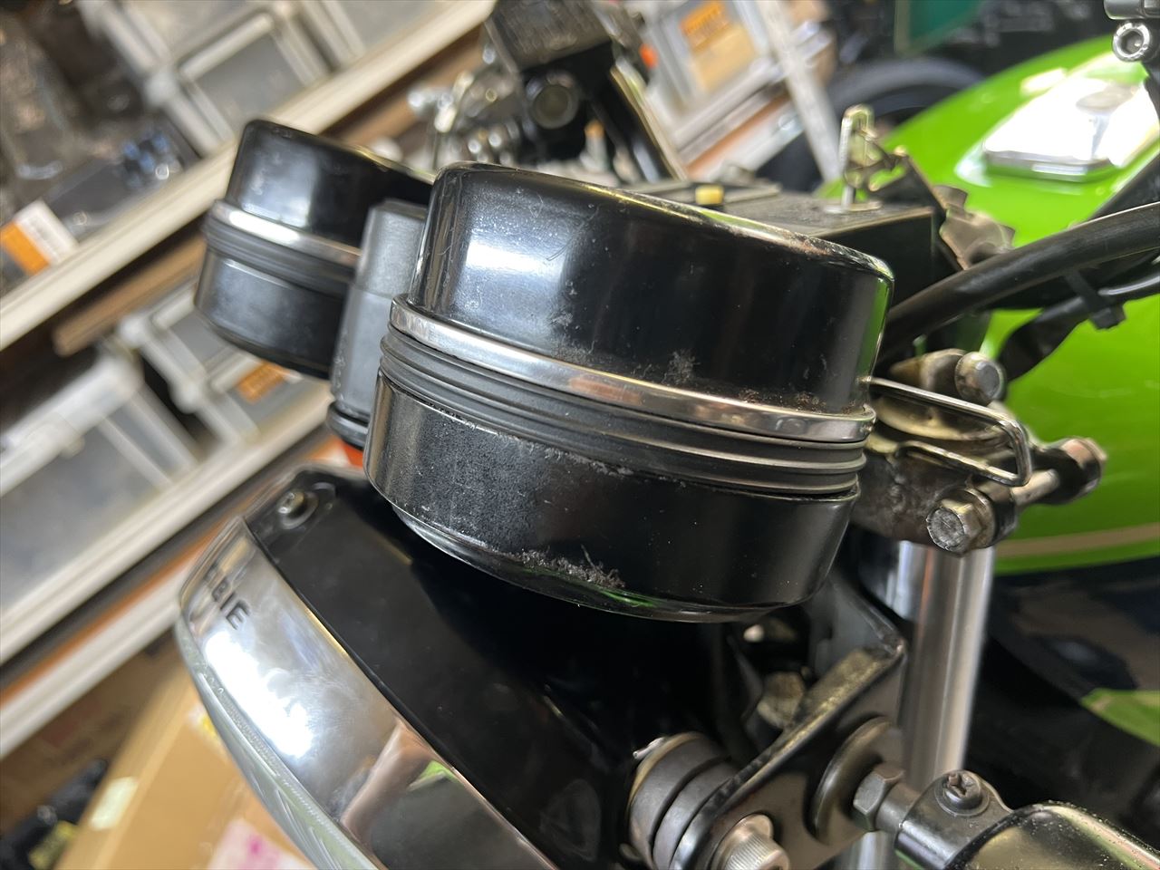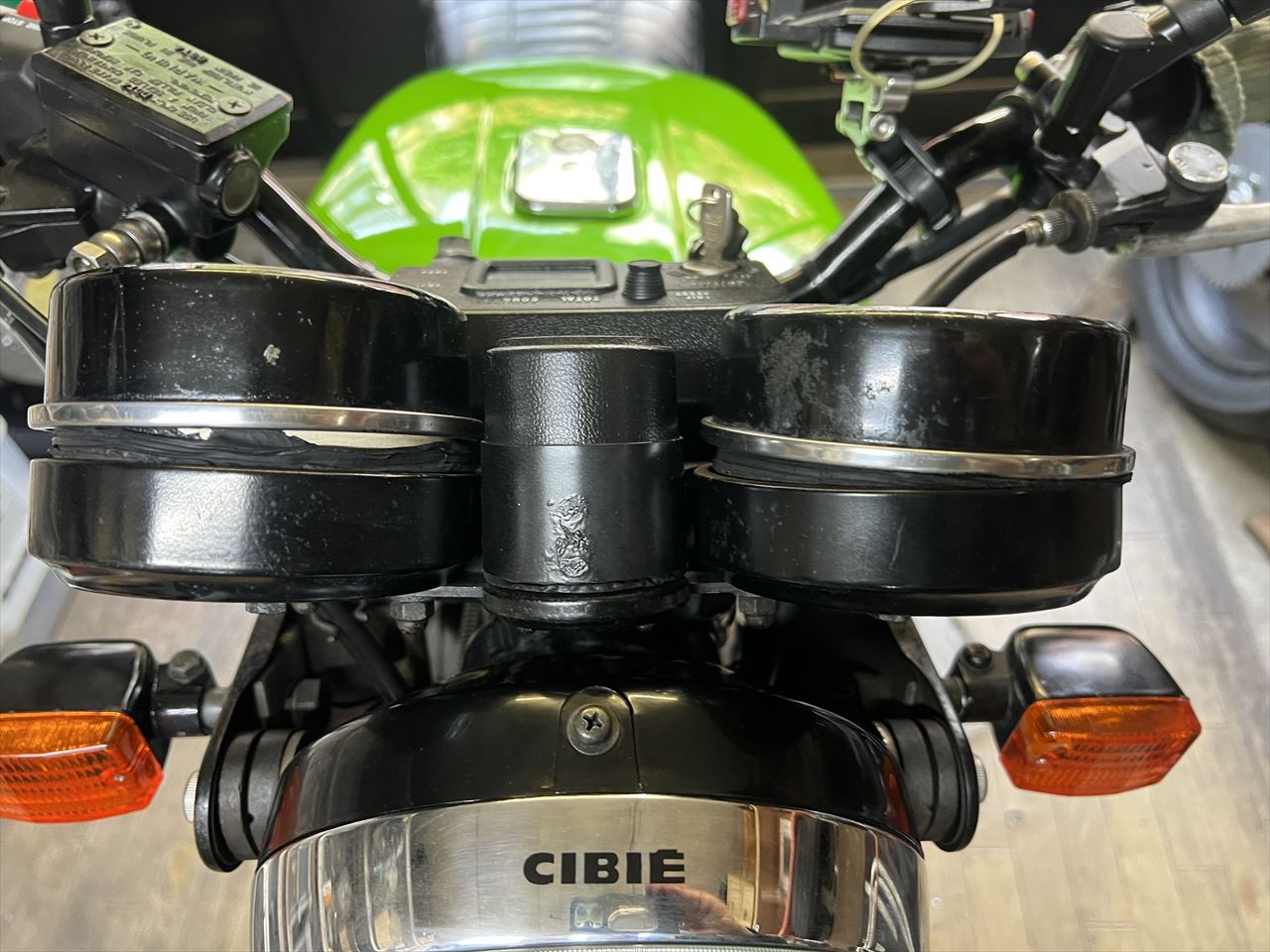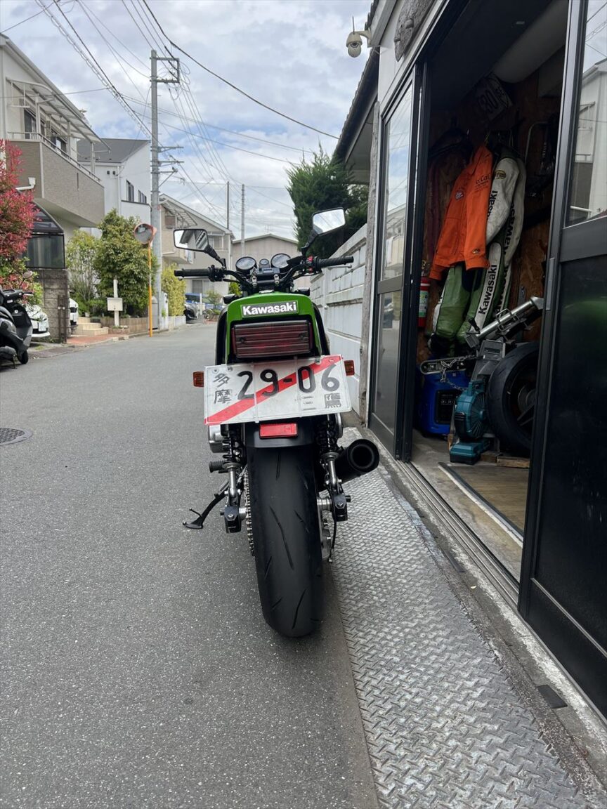 ガレージ周辺でチェック。走りだしてしまえばいたって調子いいのですが、出だしのところはキャブのツキが悪くストール気味です。
