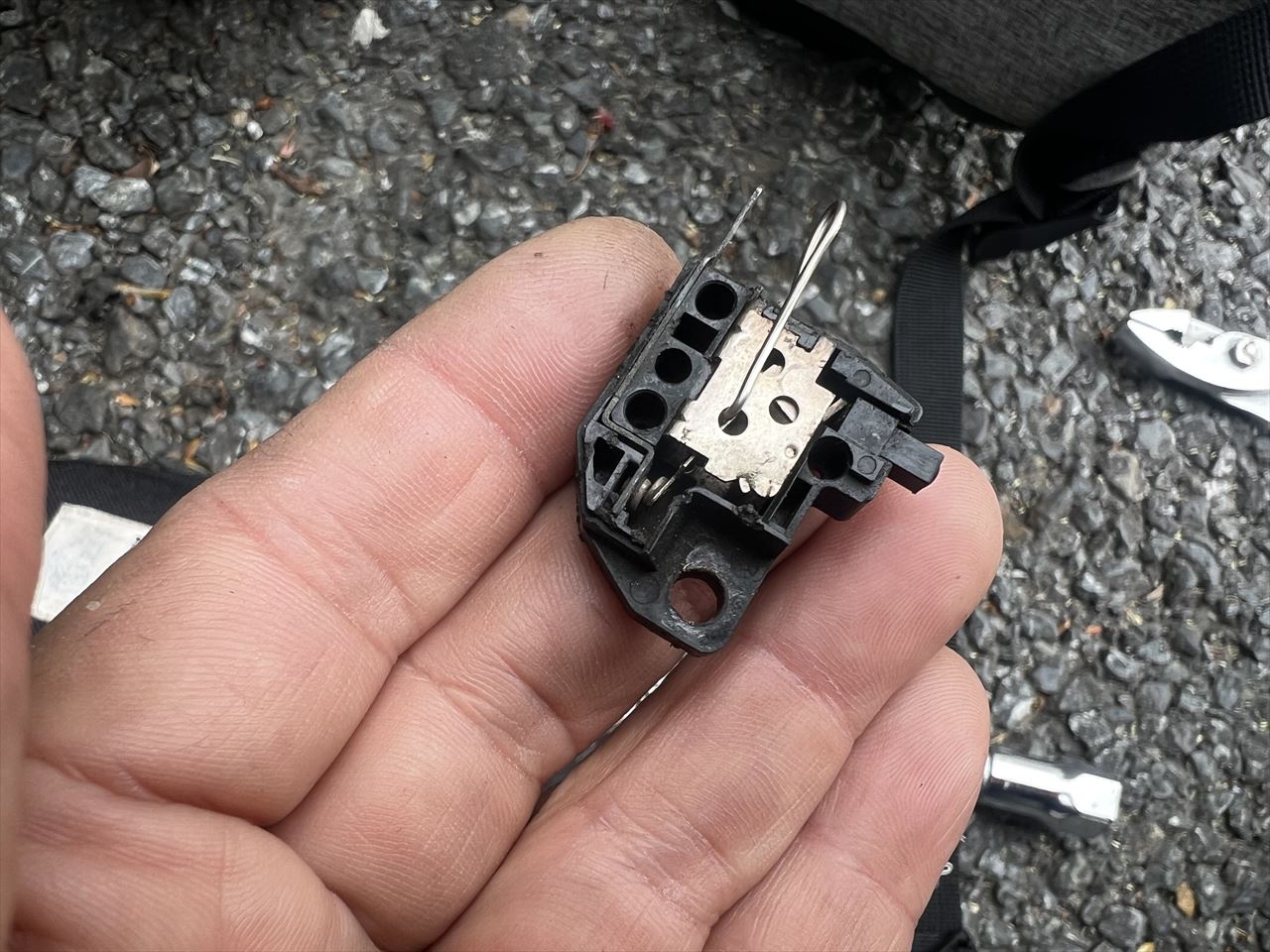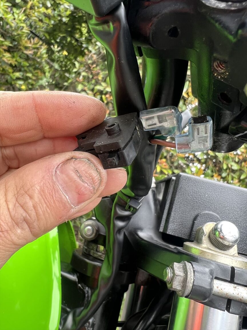 テスター屋さんでヘッドライトの光軸を合わせ、登録管轄の陸事に到着。ところが途中でフロントブレーキスイッチの端子が折れていることに気が付きました。