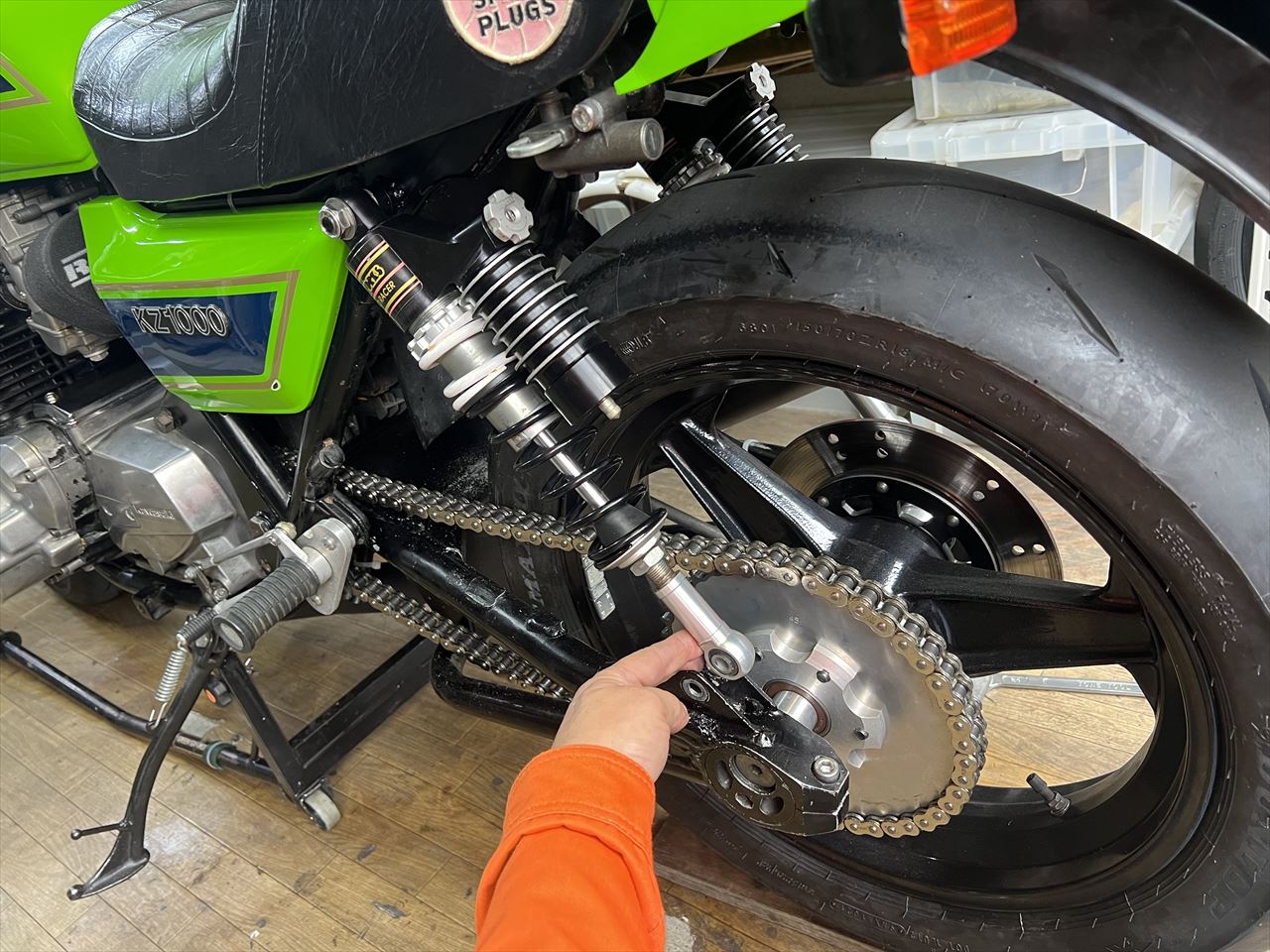 足付きを良くするために最低まで車高を下げていましたが、サイドスタンドでの傾きが少なく不安定でした。そこでリヤは15ミリだけショックを伸ばして車高を上げておきます。