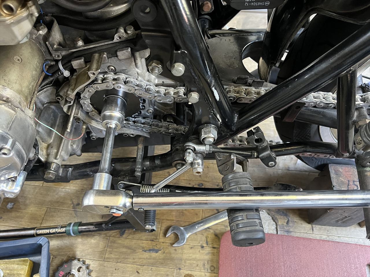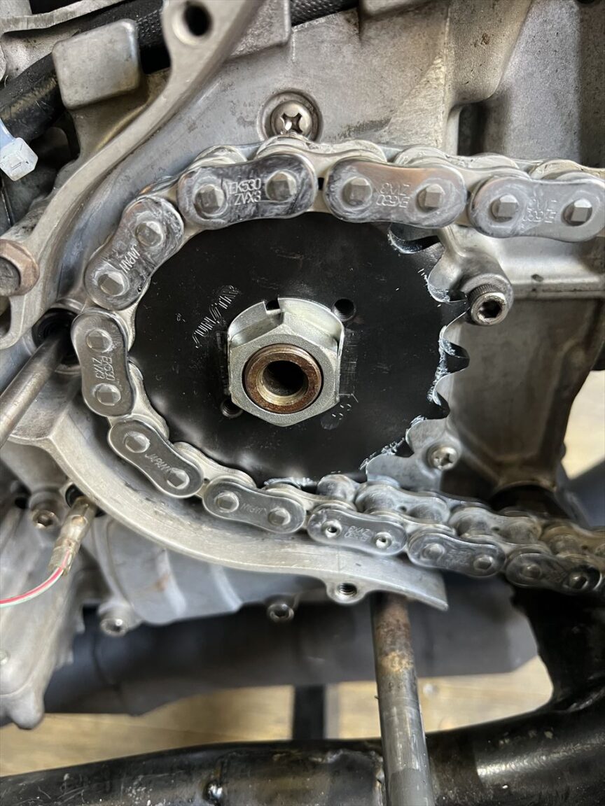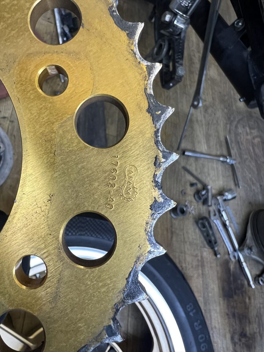 リヤスプロケットの摩耗状況はこんな感じ。前回の入庫後、かなり摩耗が進んだようですね。今回の車検はいい点検のタイミングでした。