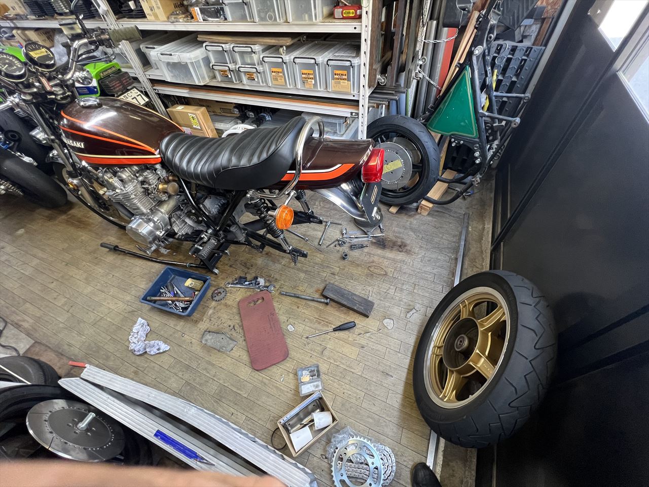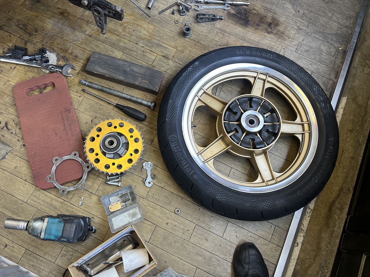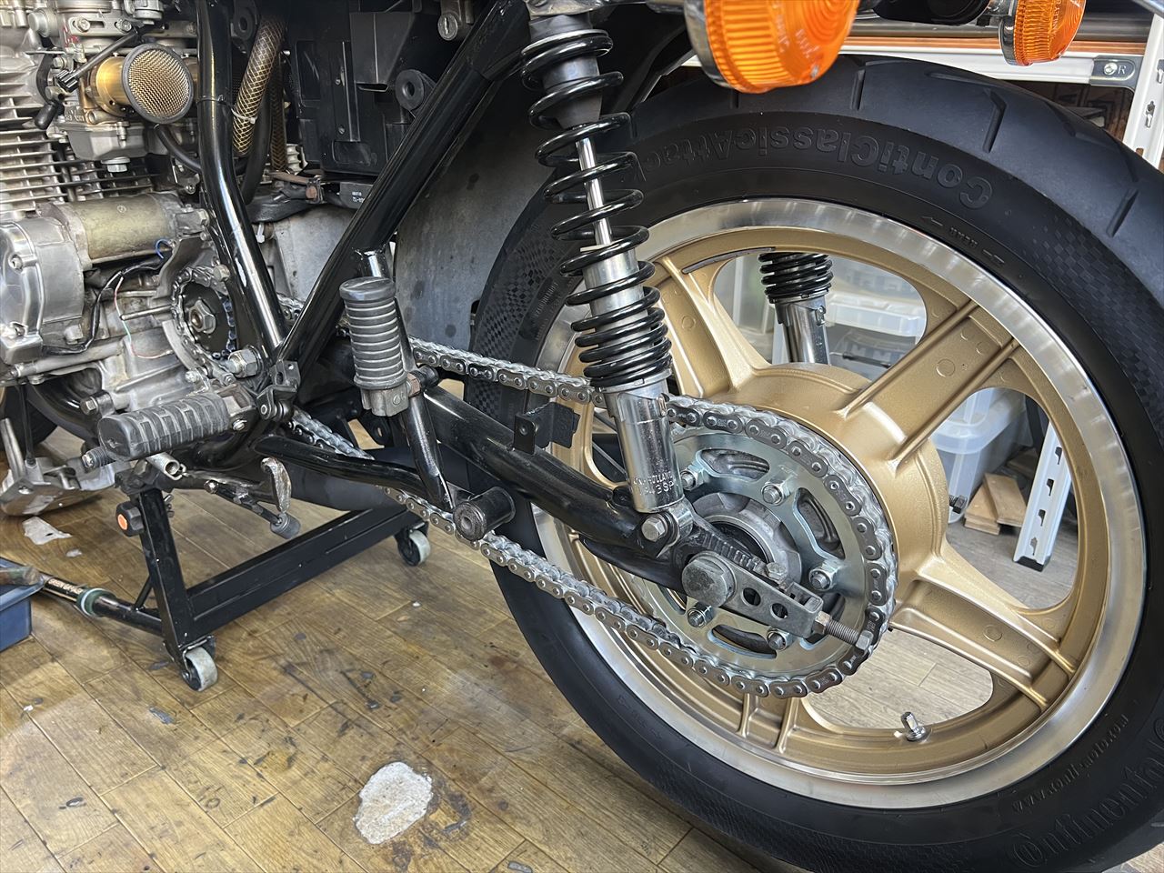 リヤスプロケットの摩耗状況はこんな感じ。前回の入庫後、かなり摩耗が進んだようですね。今回の車検はいい点検のタイミングでした。