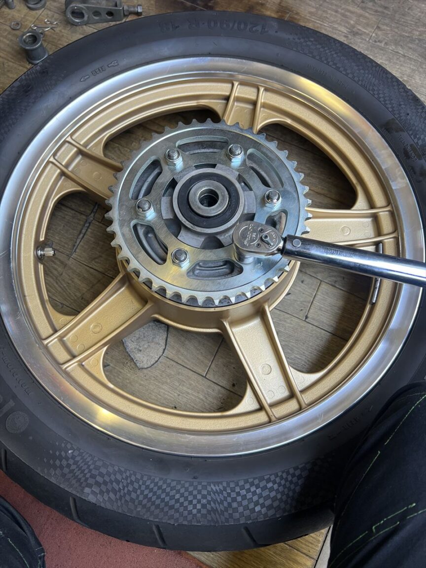 新しいリヤスプロケットを取り付けます。今回はメーカー在庫のあったスチール製をチョイス。