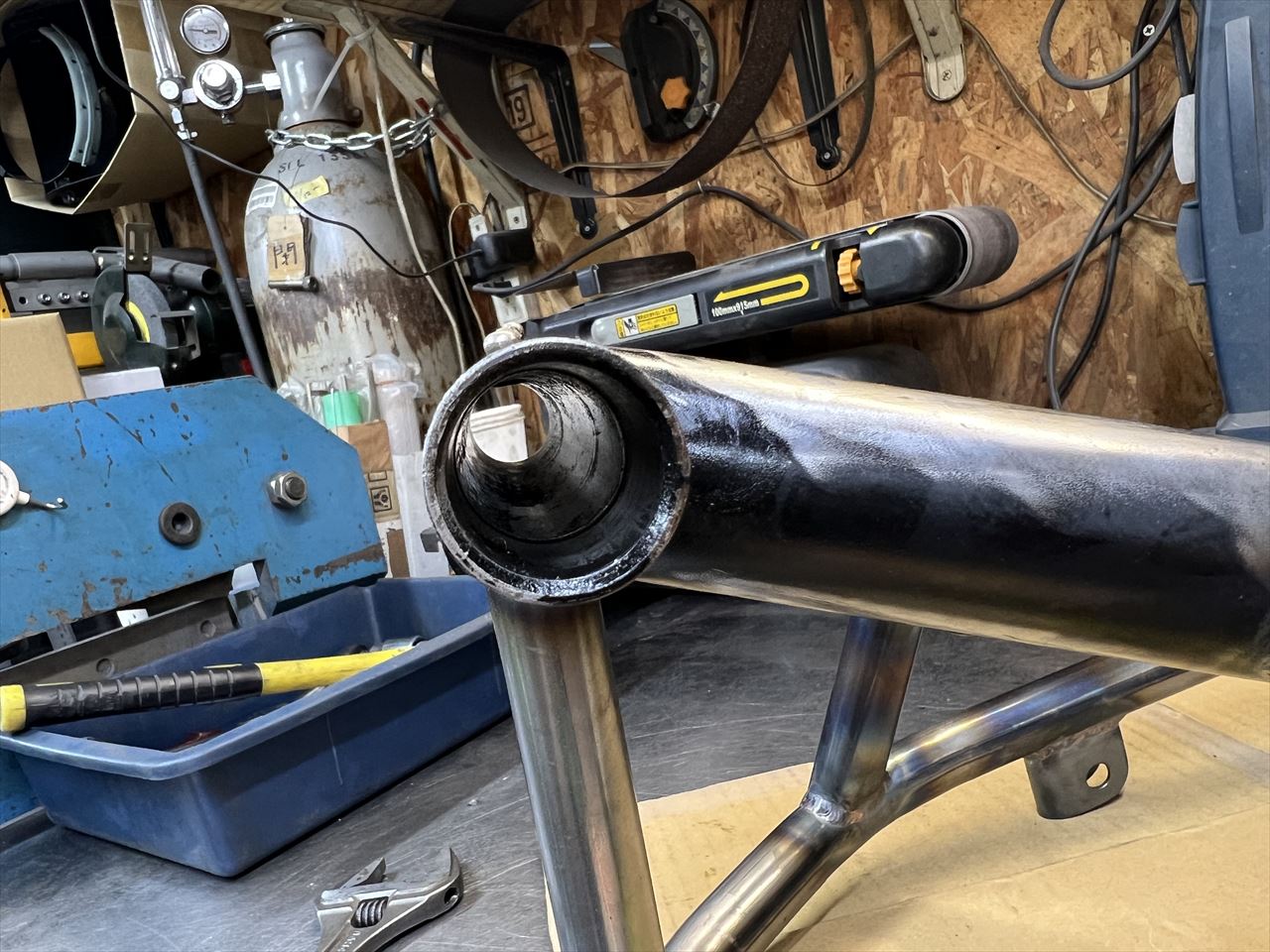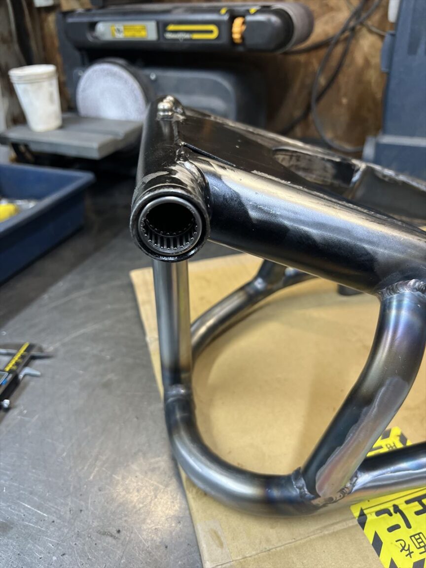 最後にトルクロッド受けを付けます。ワイドタイヤの逃げを作って大きくくびれたため、メインパイプの剛性は低下していると思いますが、トラス補強によって全体ではノーマルより高剛性になります。