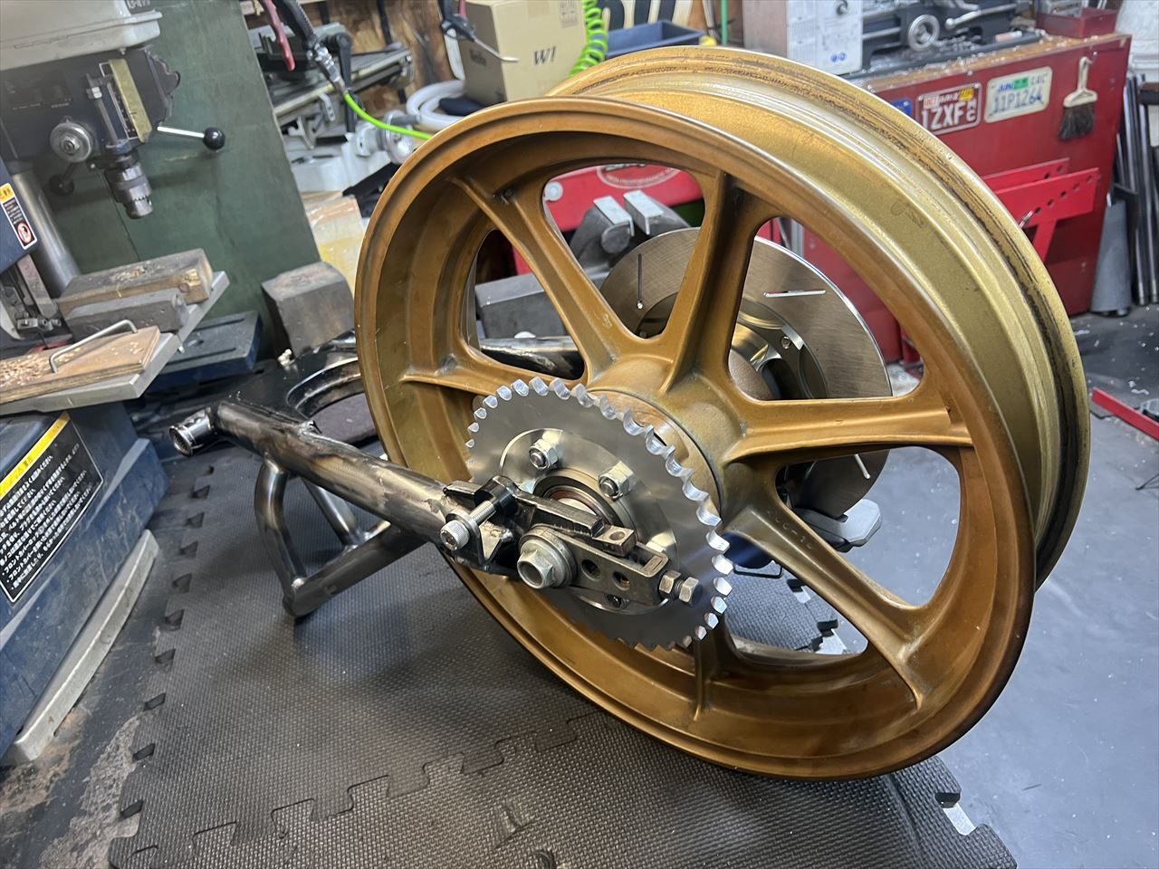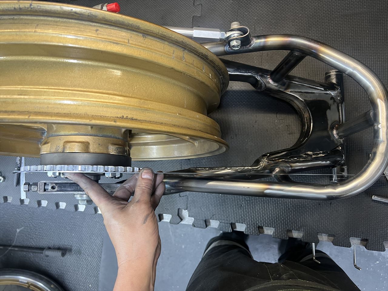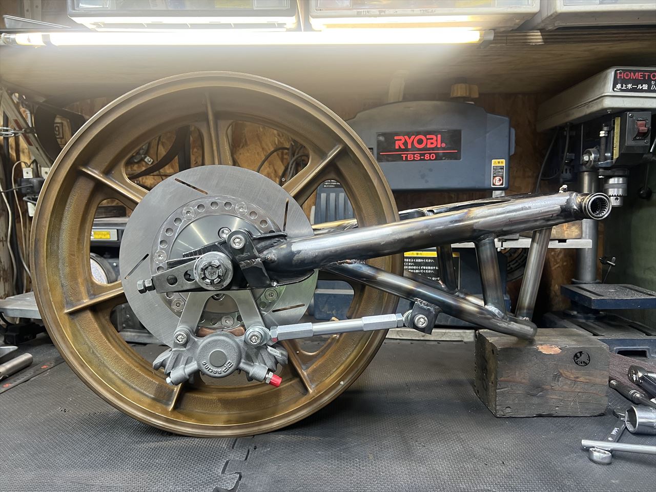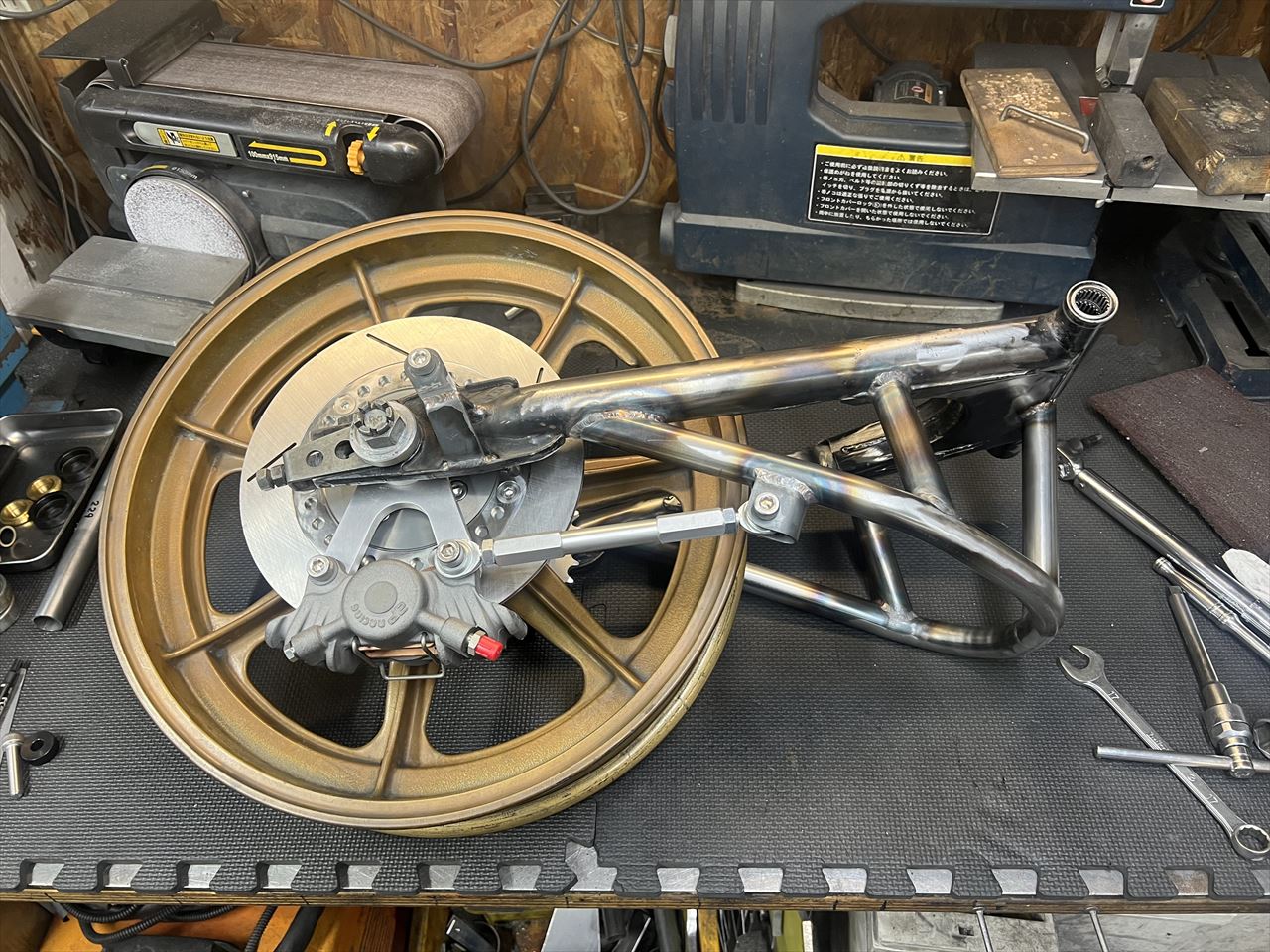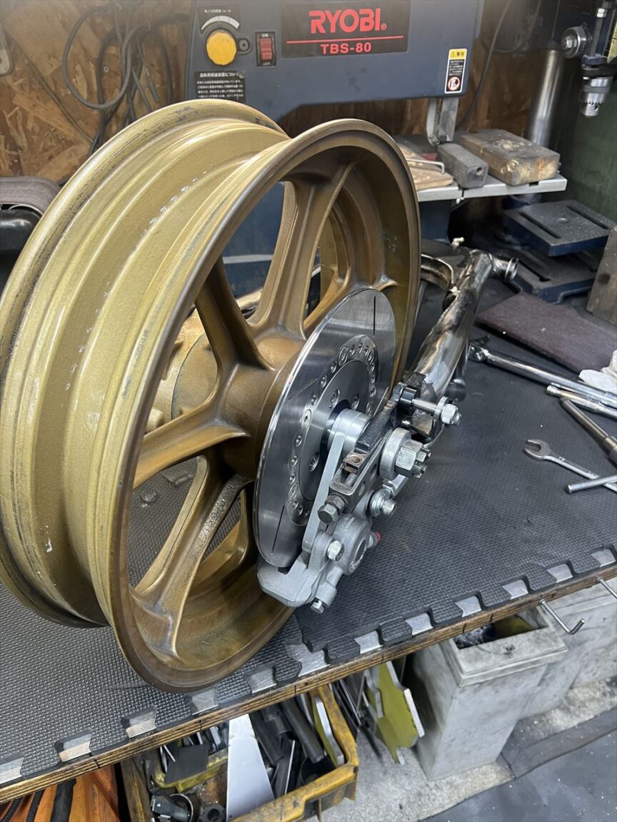 製作したワークススイングアームと、使用予定のハイポイントモーリスホイールのフィッティングをします。