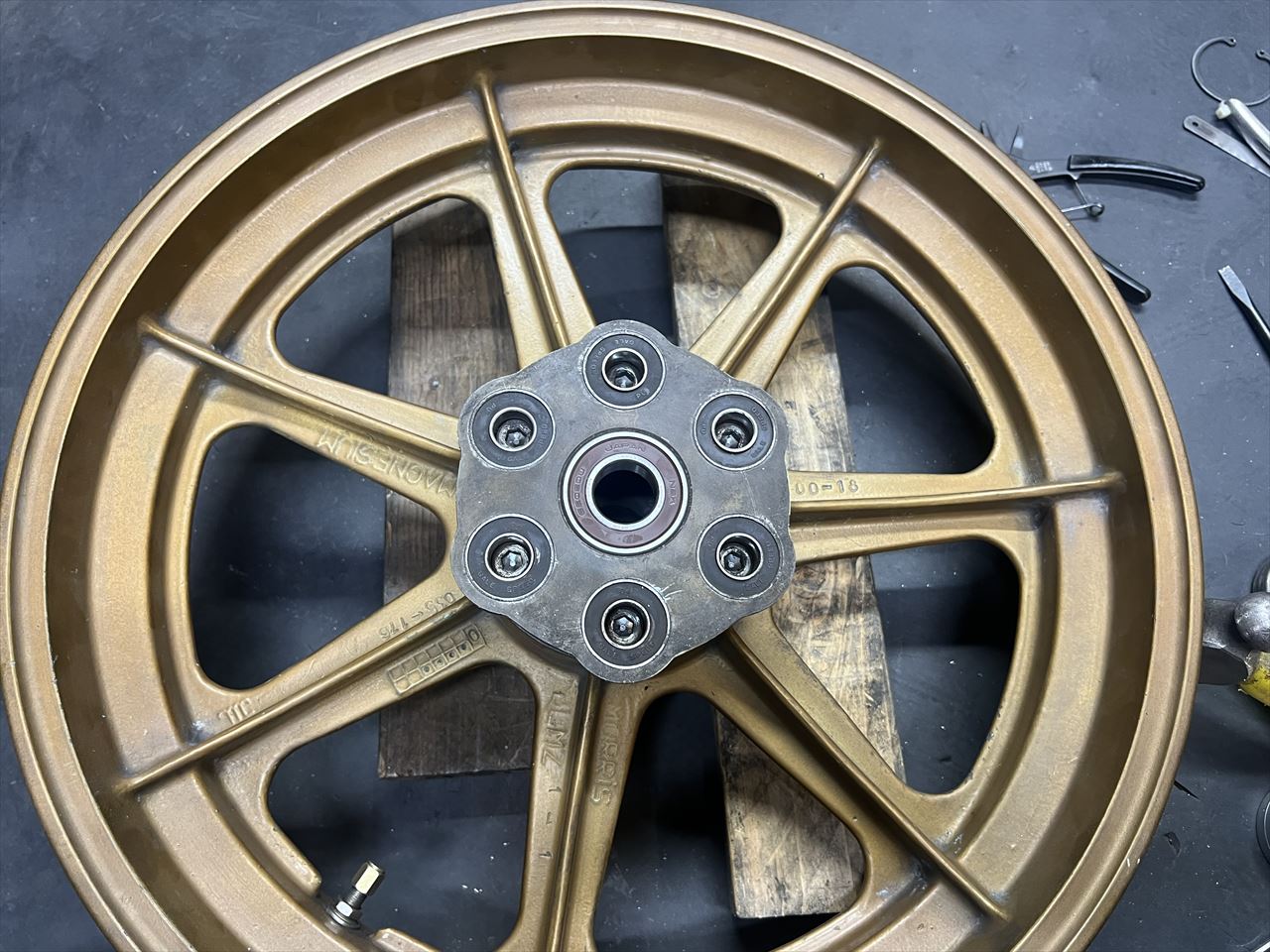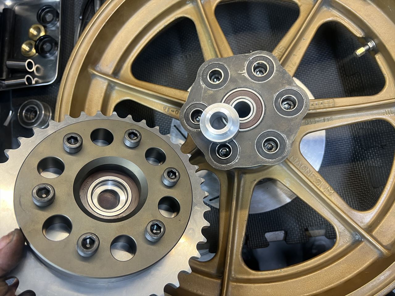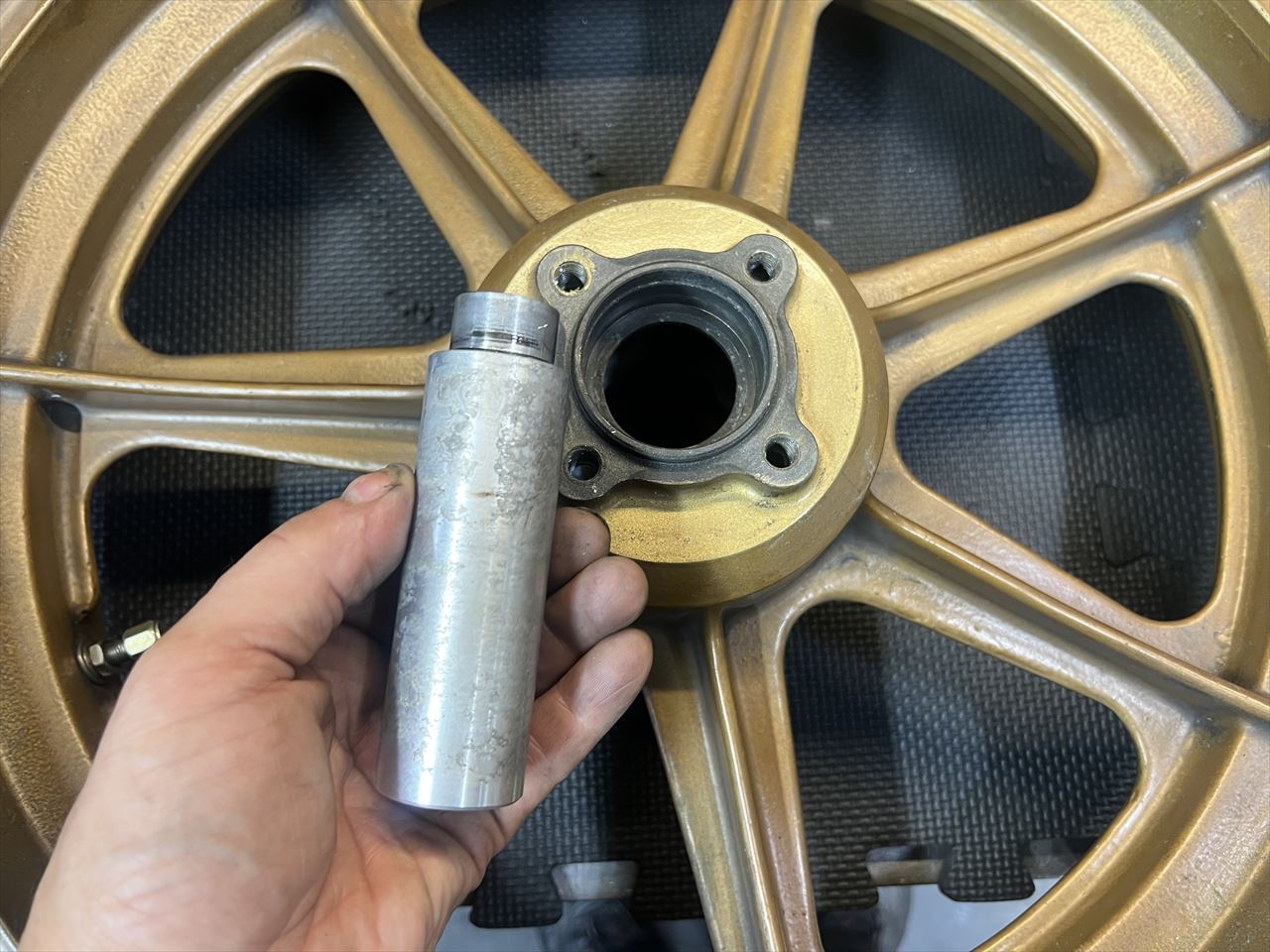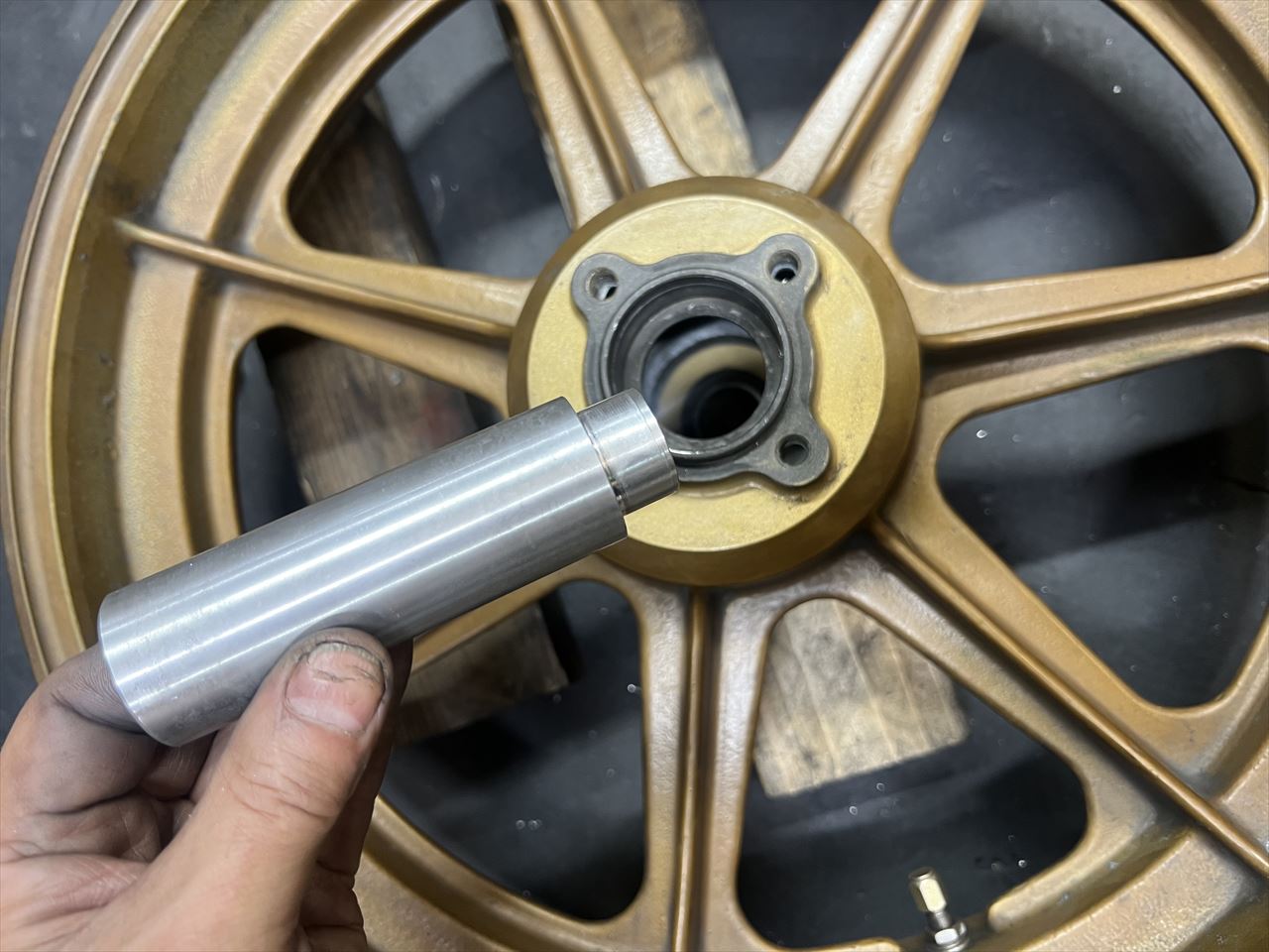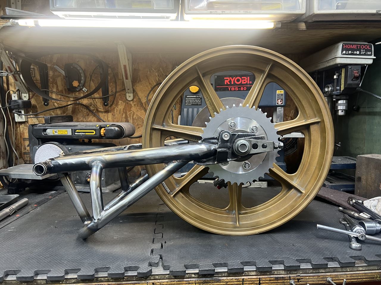 製作したワークススイングアームと、使用予定のハイポイントモーリスホイールのフィッティングをします。