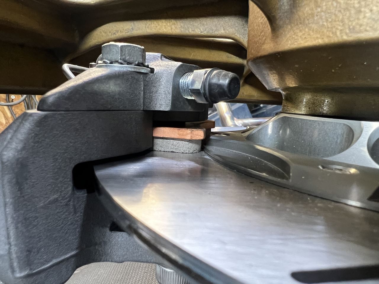 これでパッドが減っても1ミリほどのクリアランスが確保できるようになりました。今後パッド交換する際は、パッドの銘柄によって裏板の形状や上下寸法が異なる場合があるので、交換の際はここのクリアランスを必ず確認してください。