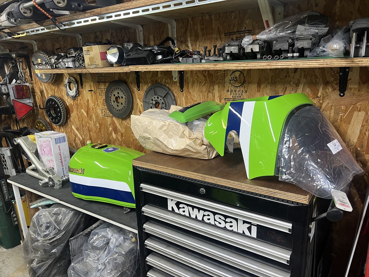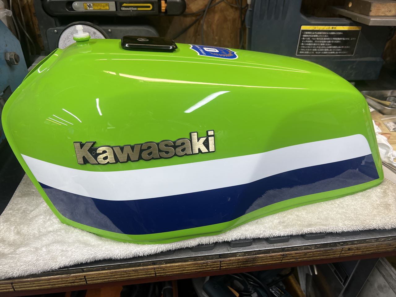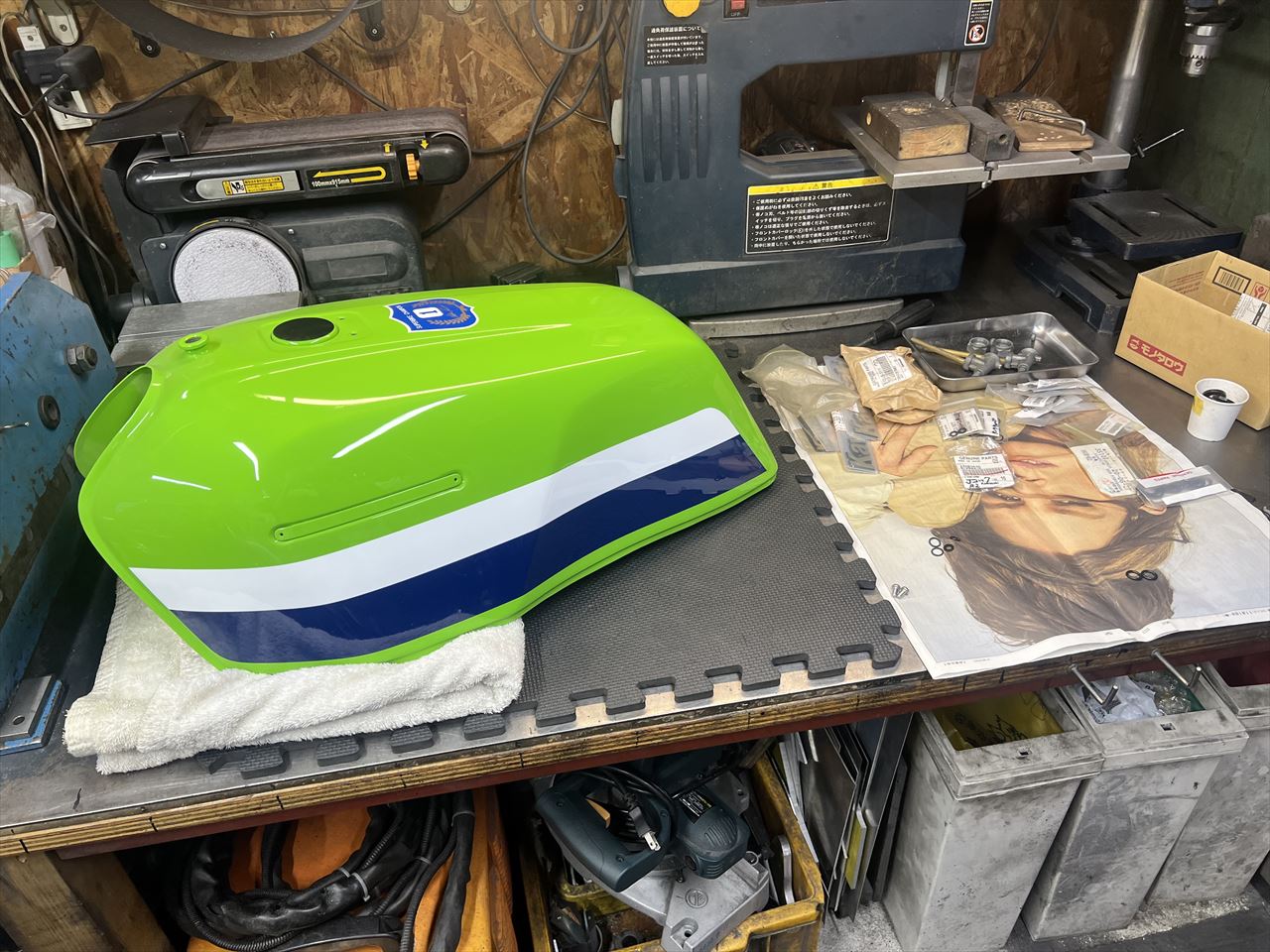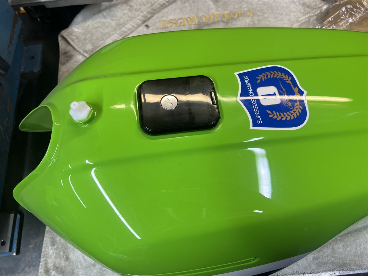R1カラー外装セットの塗装は半年以上前に終わっていましたが、それからなかなか進められなかった仕上げの作業をします。タンクはワークス仕様に改造してあります。コックは後ろ側左右にダブルで装備。S1ブリーザーも付けました。