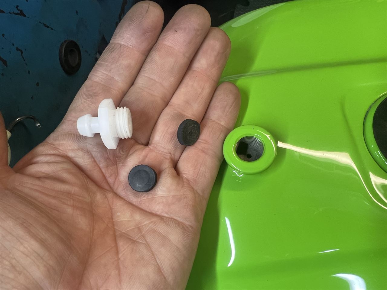 ブリーザーは実際にタンクに穴が開いていて機能するのですが、実用上は満タンフルブレーキで逆流する様子がブリーザーホースで見えたり、ガソリンキャッチタンクを付けるなど煩わしいので、ゴム板を仕込んで塞いでおきます。これならホースはダミーでよく、キャッチタンクもいりません。必要な呼吸は通常通りキャップで事足ります。