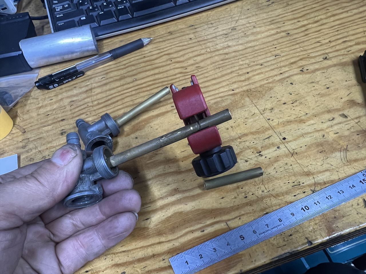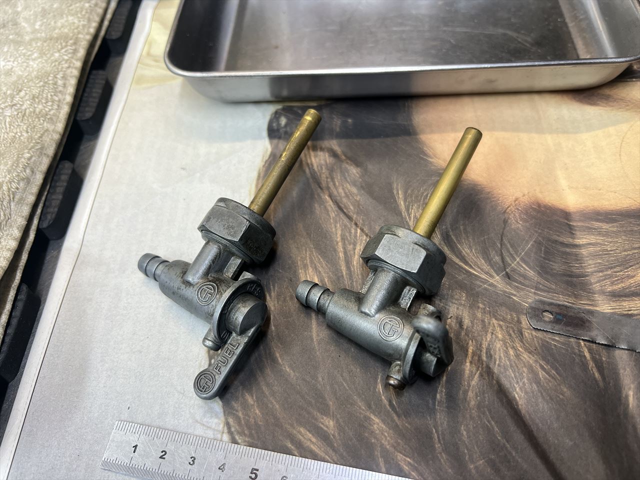 ワークス仕様タンクはコックが一番後ろにあり、最後の1リットルまで効率よくガソリンを落とすことができます。リザーブのパイプは少し短くカットしておいた方が良さそうです。