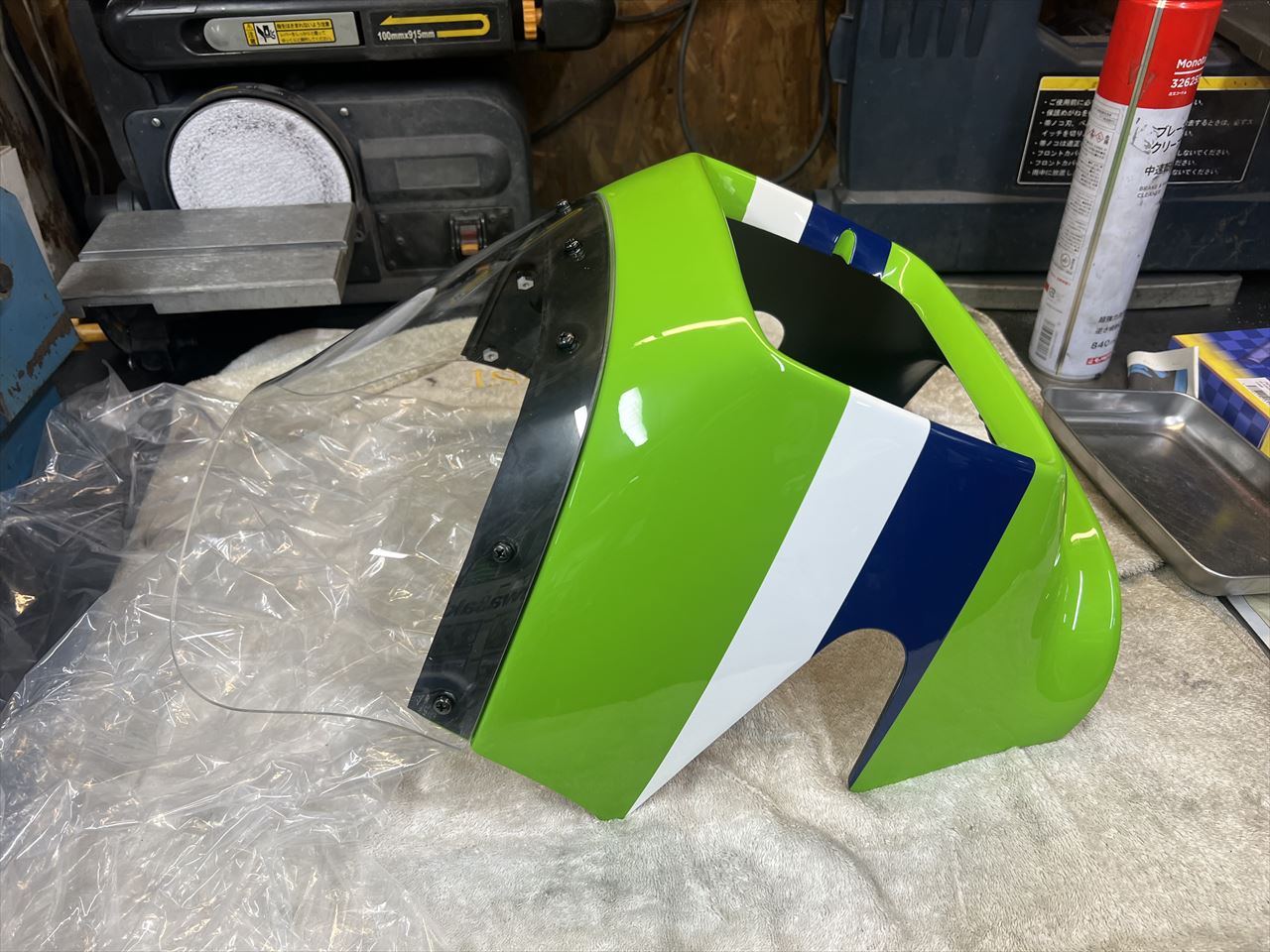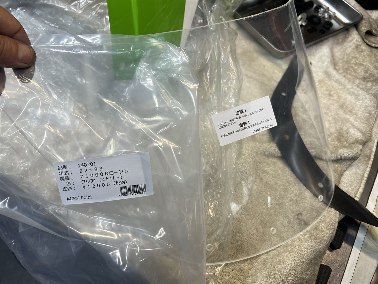 スクリーンはレーシーなイメージでクリアを使います。強度のあるポリカーボネート製の純正形状で、アクリポイント製です。