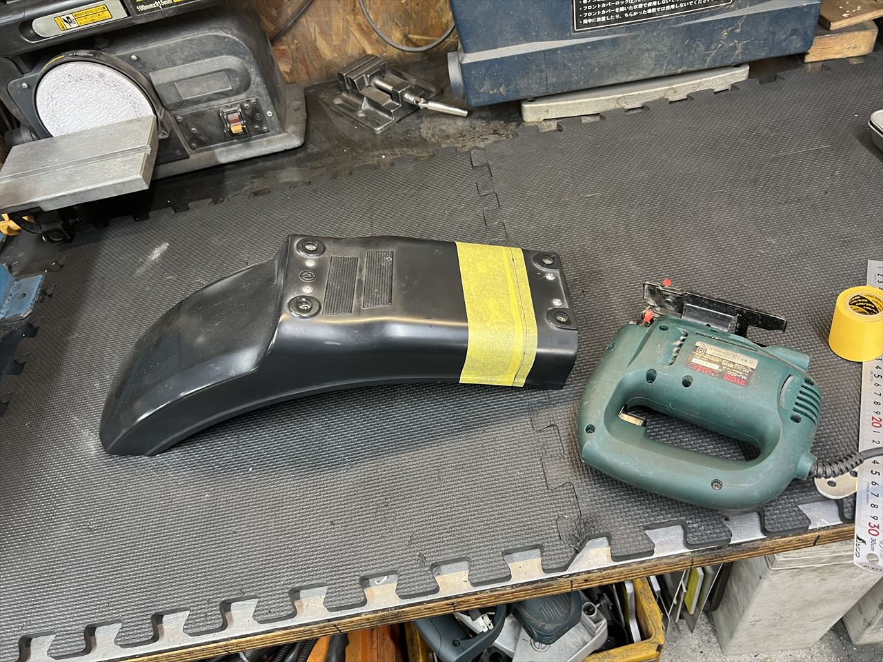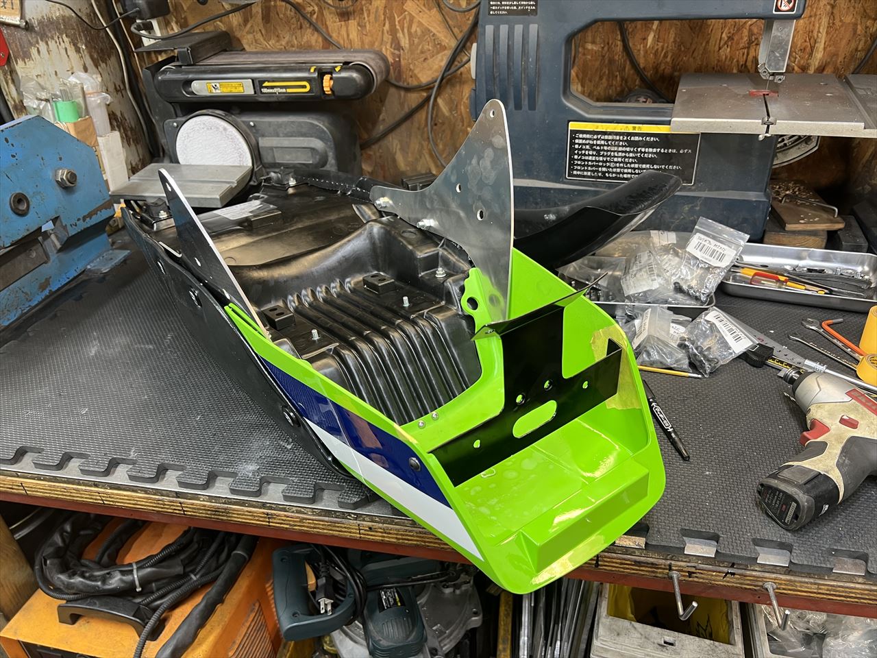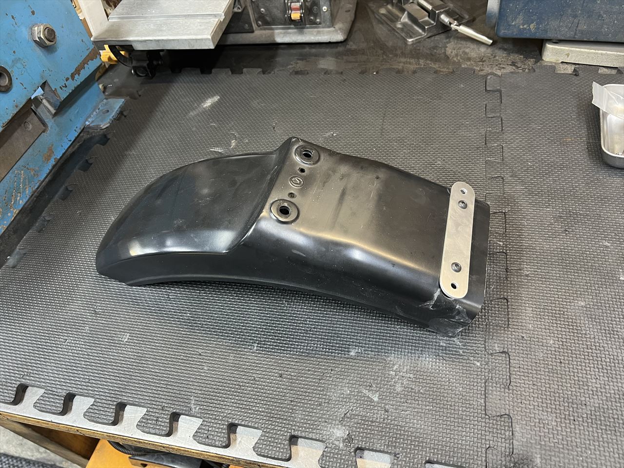 AMAではお約束のリヤフェンダーを取り付けます。こちらは以前購入いただいた弊社製のノーマル形状FRPリヤフェンダーです。テールと一体化する際は、前側を少しカットします。