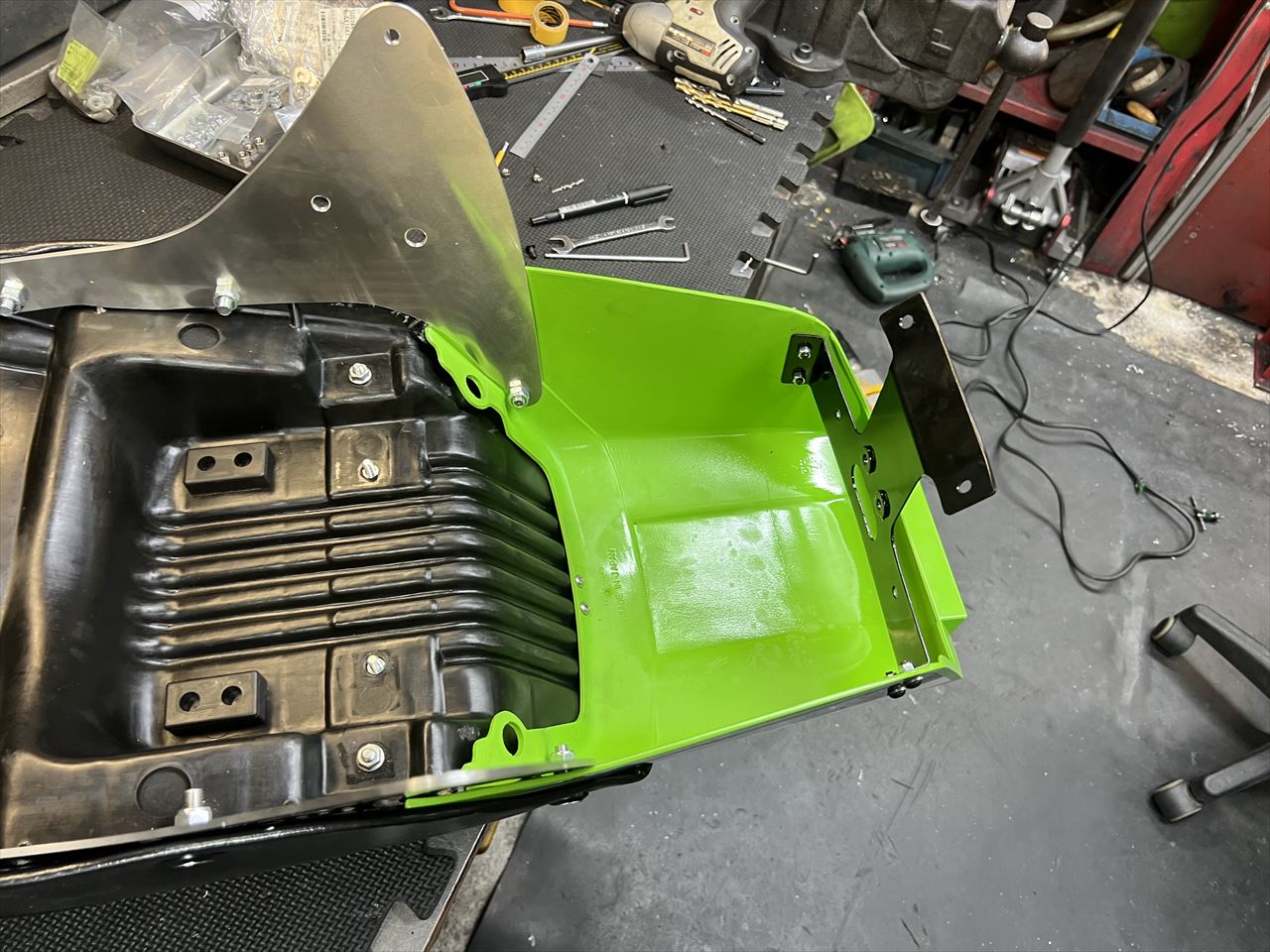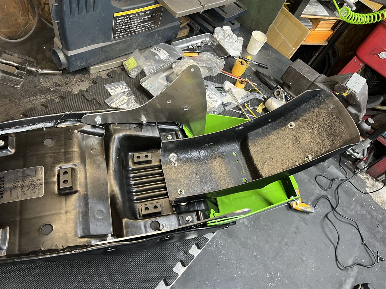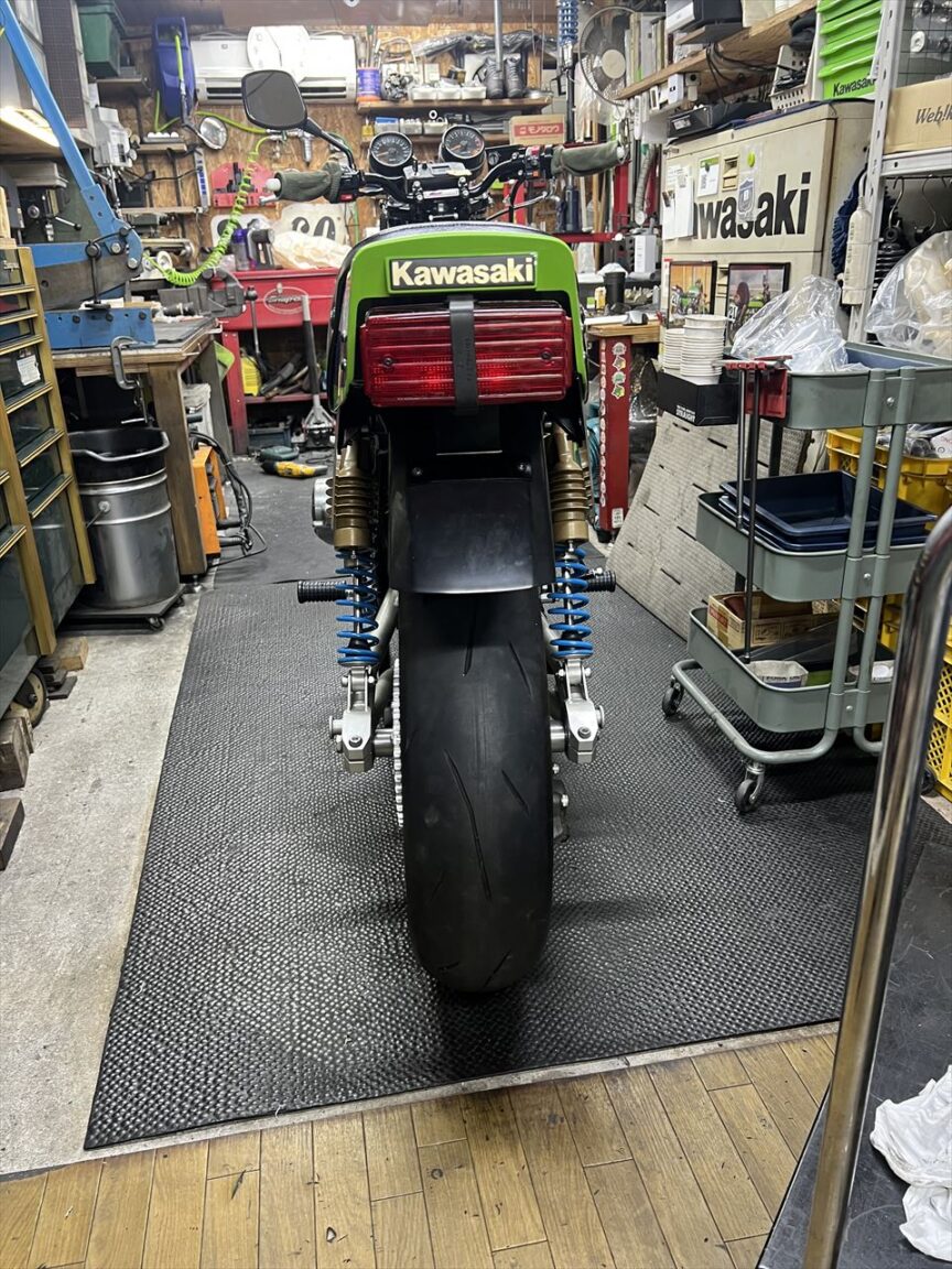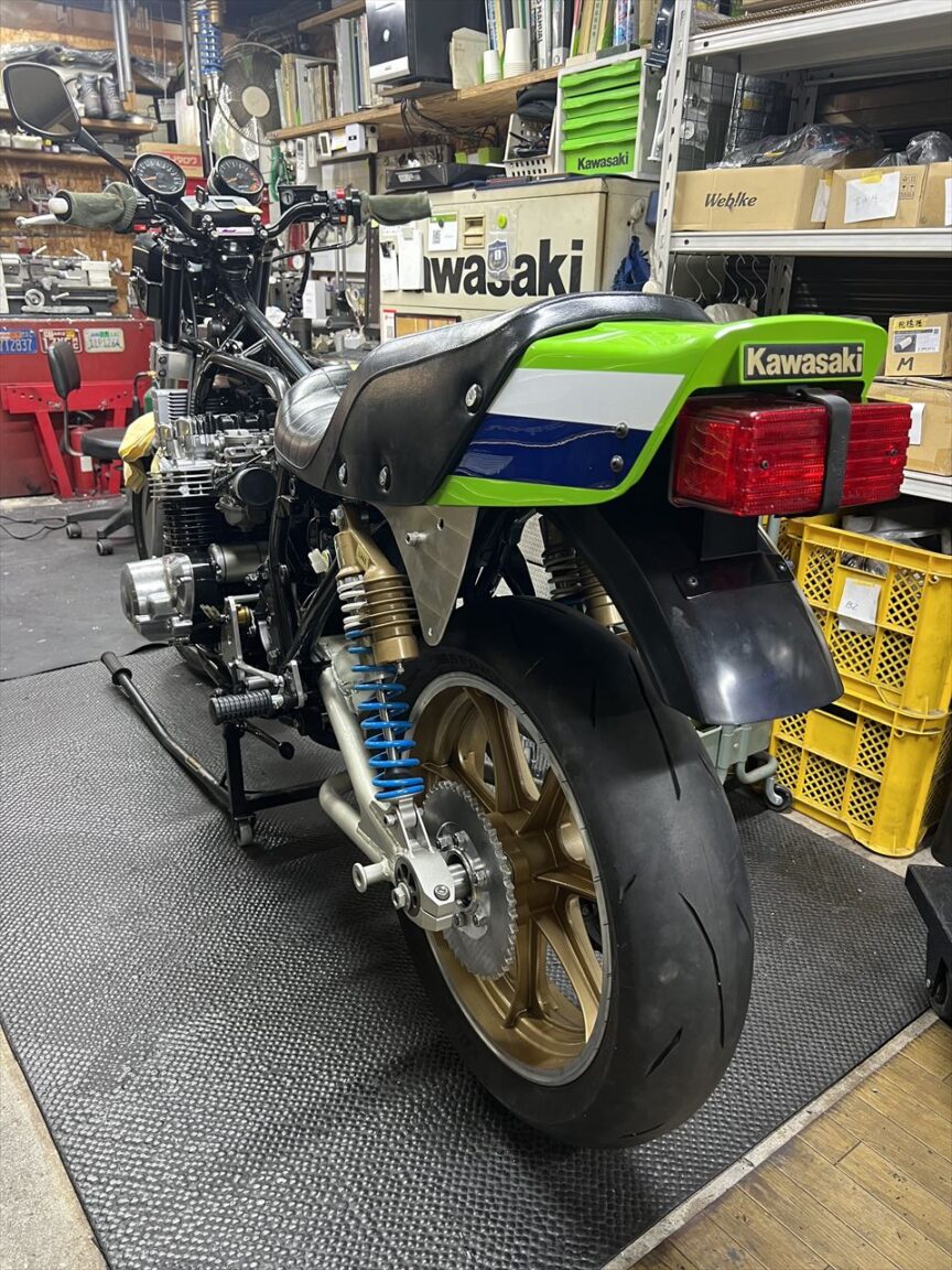 AMAではお約束のリヤフェンダーを取り付けます。こちらは以前購入いただいた弊社製のノーマル形状FRPリヤフェンダーです。テールと一体化する際は、前側を少しカットします。