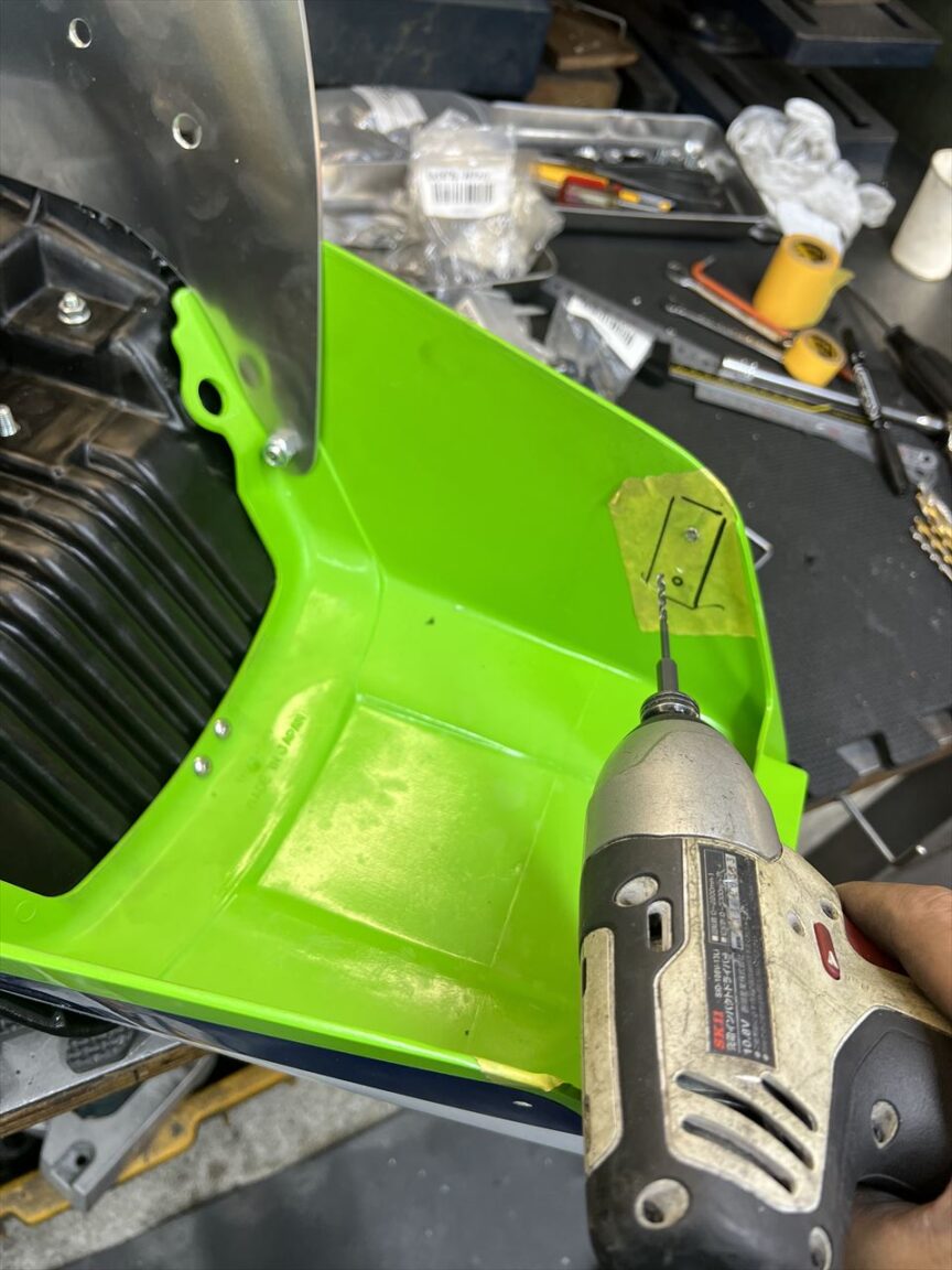 穴を開けてリヤフェンダーをテールランプステーに固定します。これでテール周りの一体化は完成です。