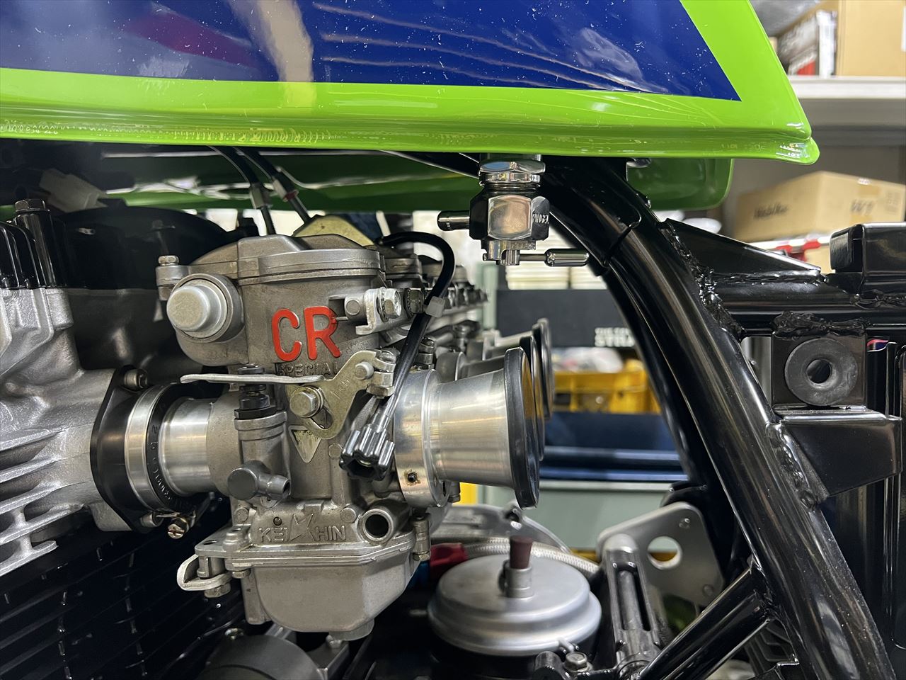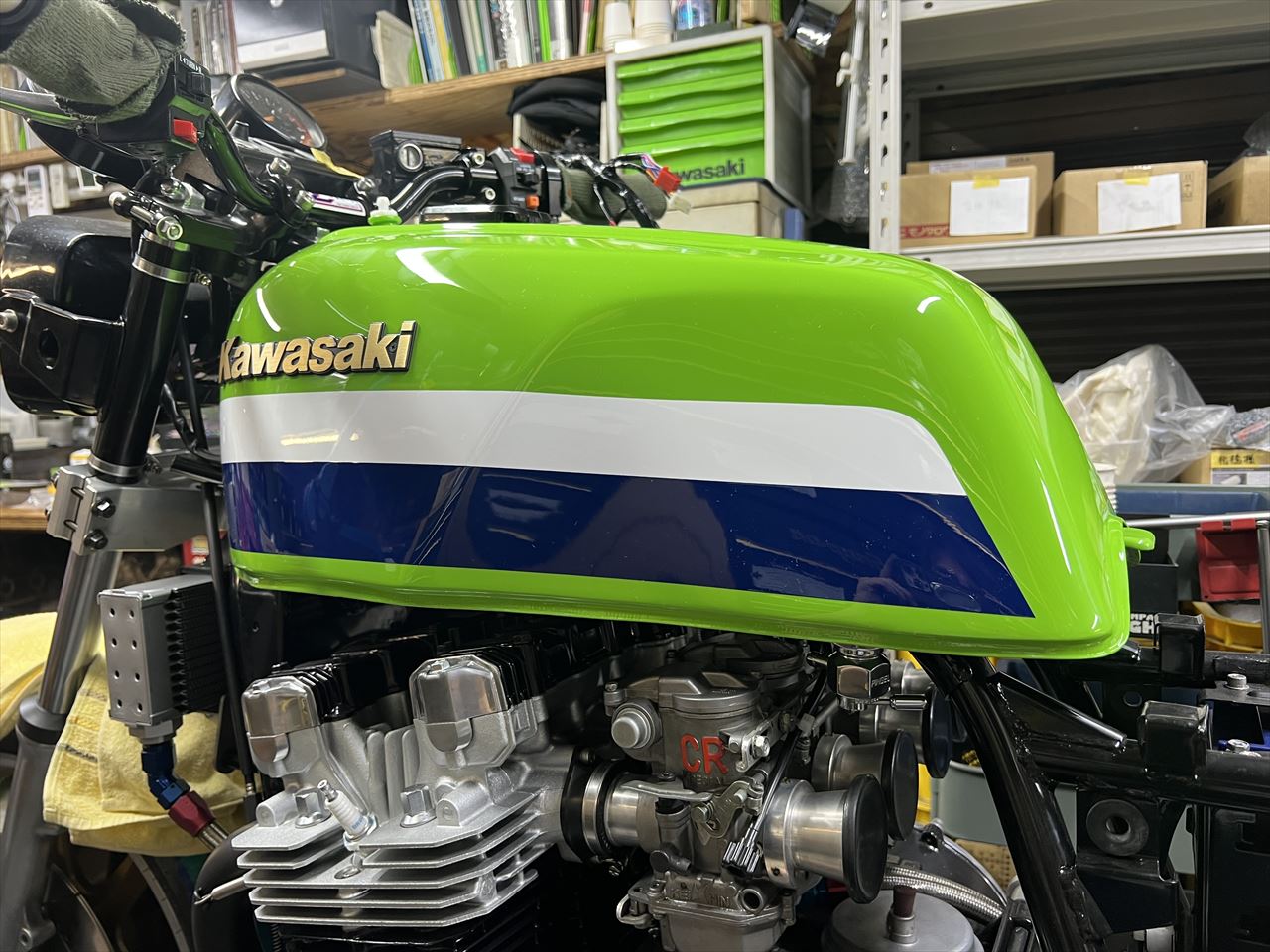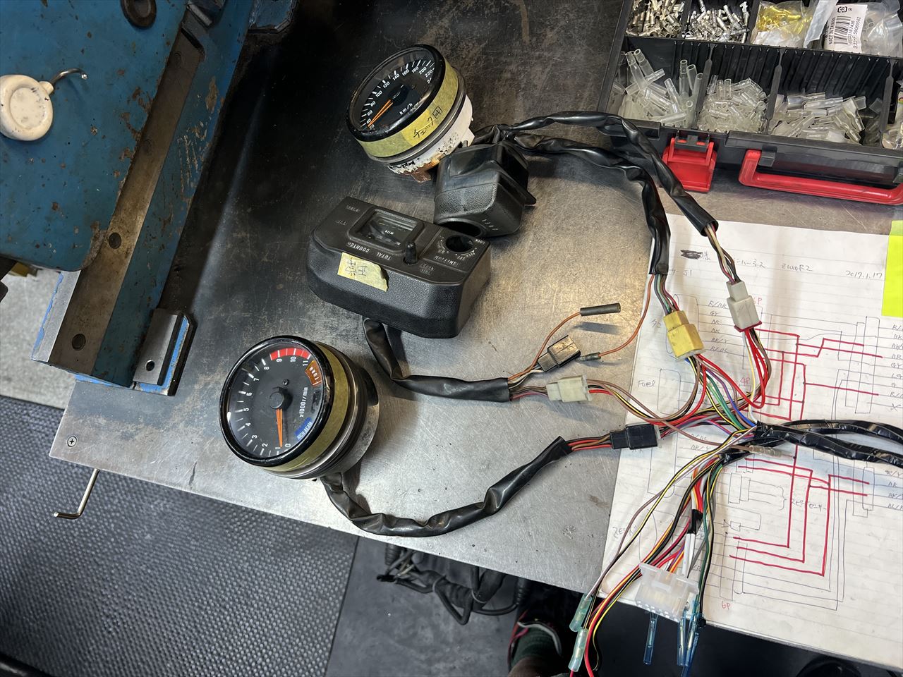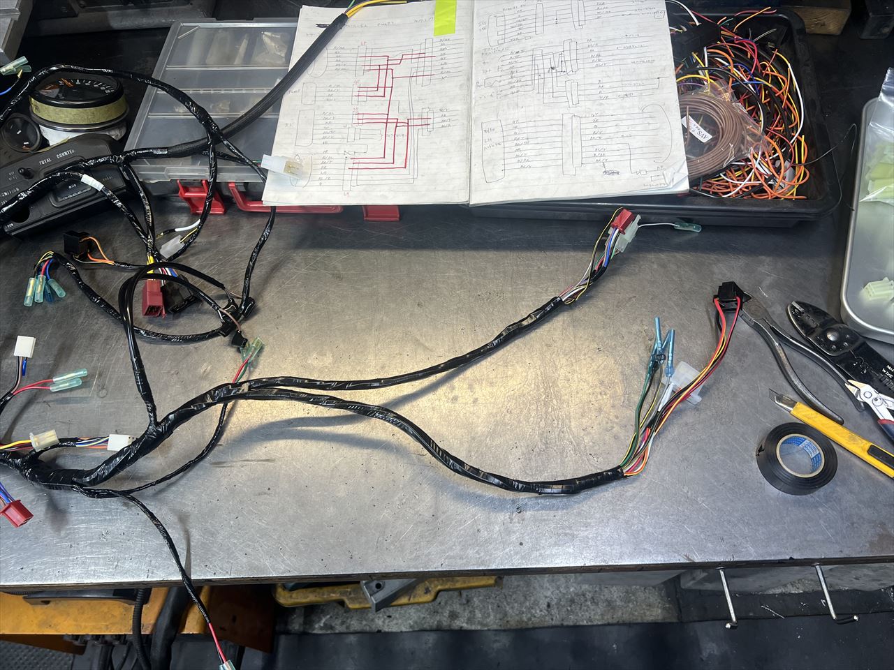 メインハーネスを交換します。素材はZ1000-R2純正新品で、角メーター用なので丸メーター用に改造します。合わせて前半はいつものようにスリム化し、その他にもちょっとした定番の変更を加えます。今回は同様の加工をまとめて3台分行います。