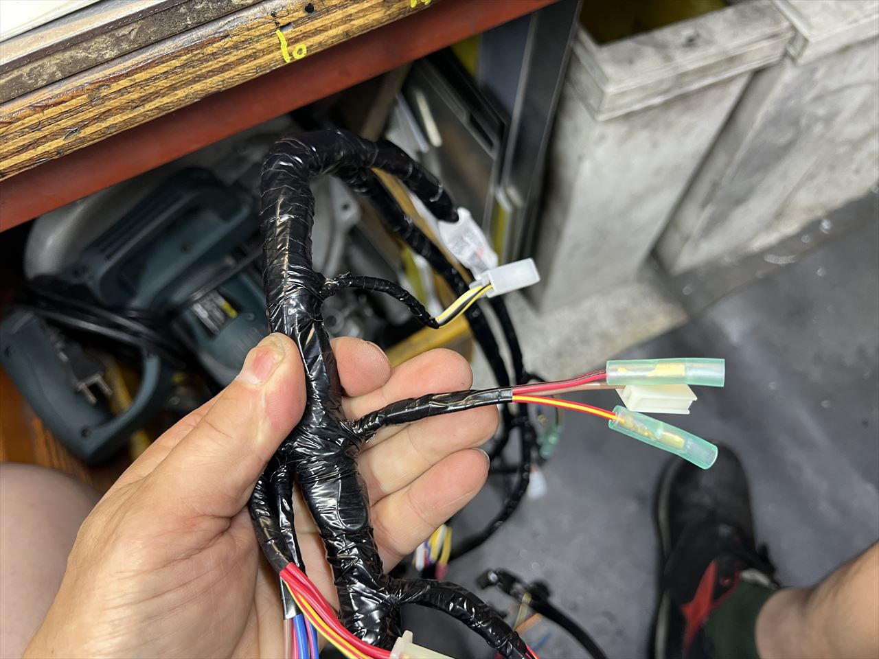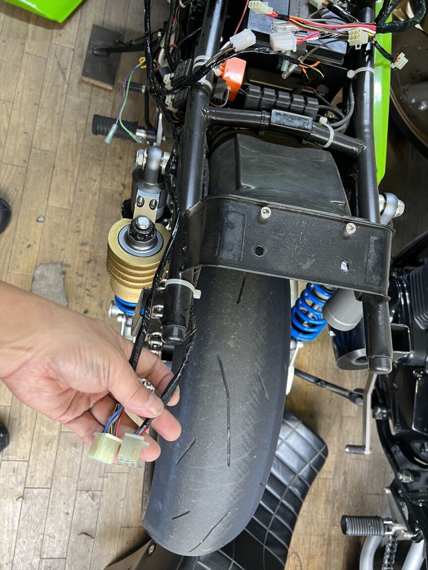 その他の改造はこちら。クラッチレバーを握らないとエンジンが掛からない、スターターロックアウトスイッチの回路をキャンセルします。場所はハーネス中央辺りの子の端子です。