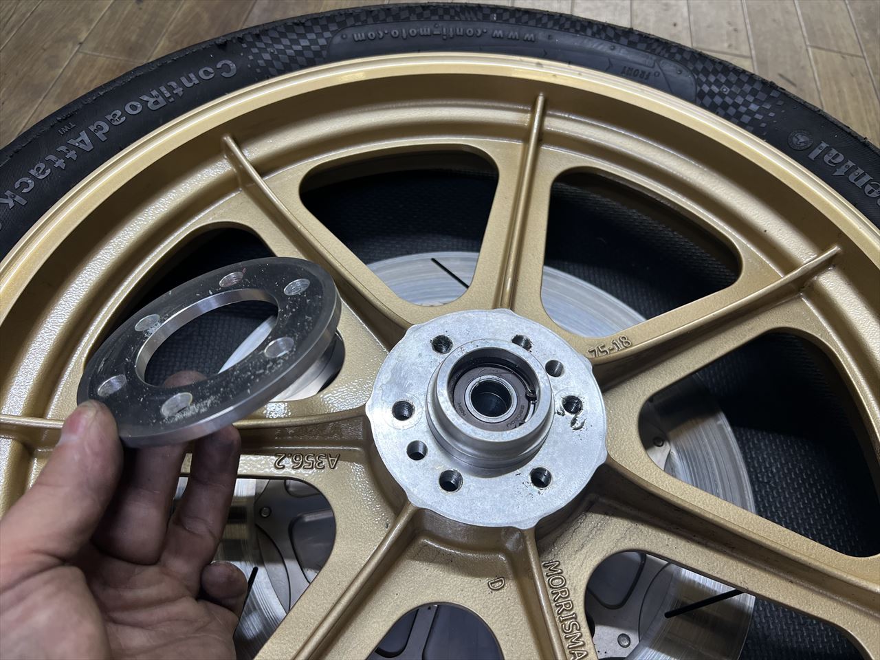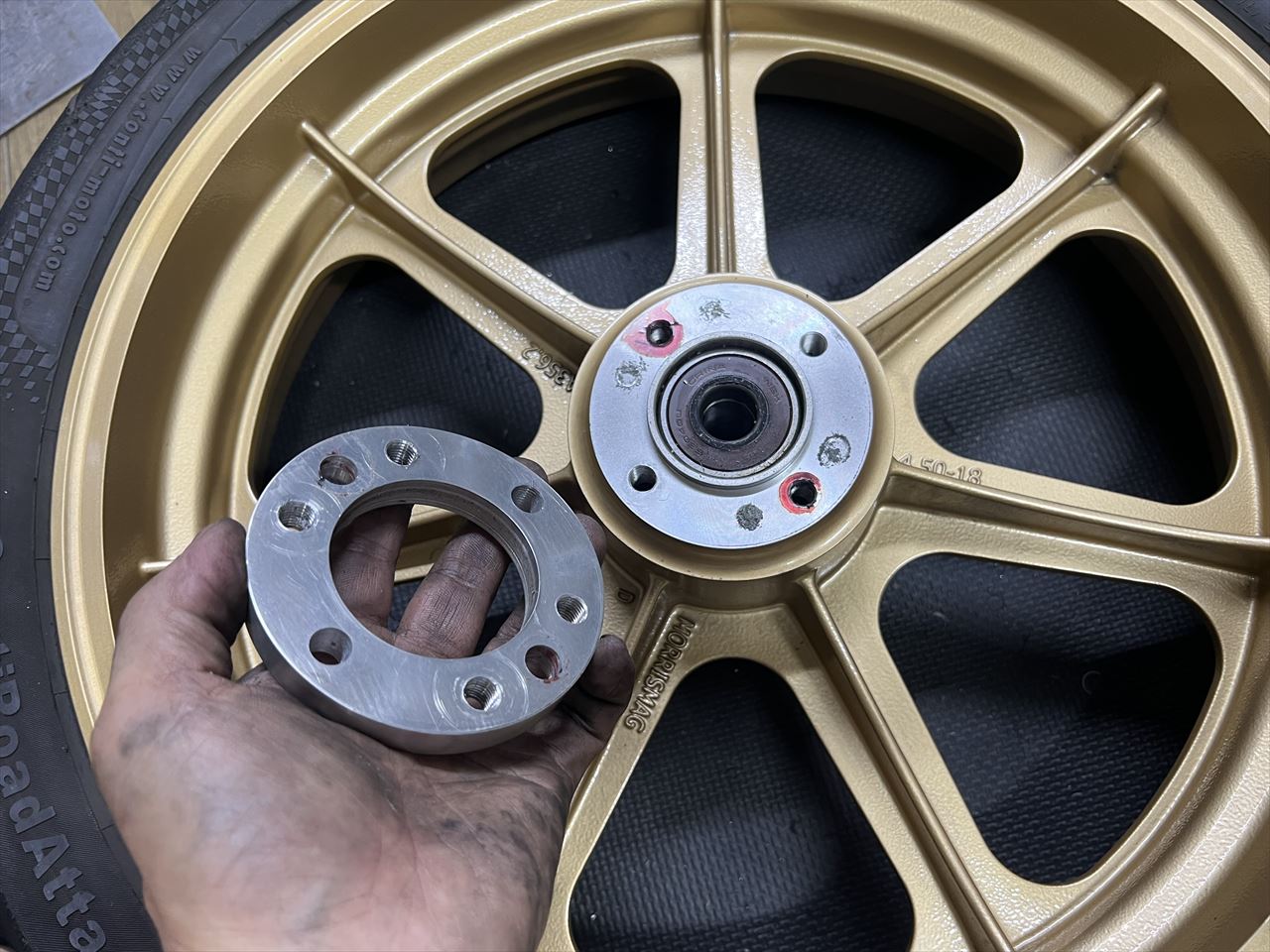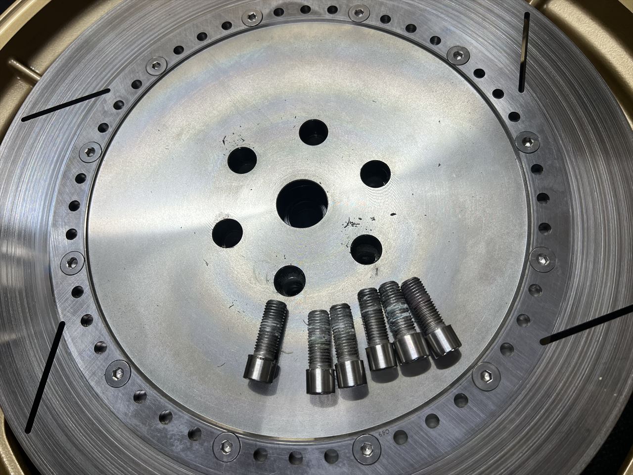 スペーサーを外すと、もとのM10 4穴からネジ穴を4個追加してM10 6穴仕様になっていました。M8 6穴仕様にしたいところですが、ネジ穴間にスペースが無いので弊社のS1ローターを付けるには再検討が必要ですね。