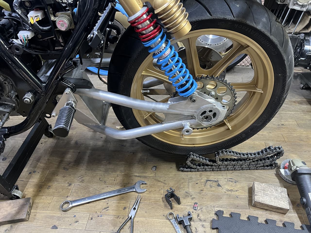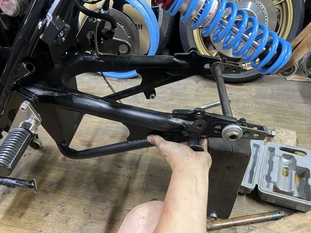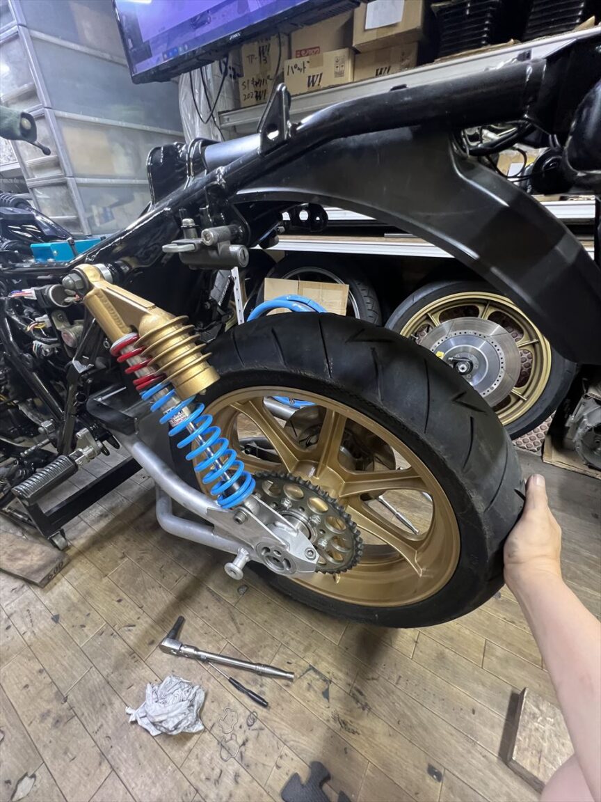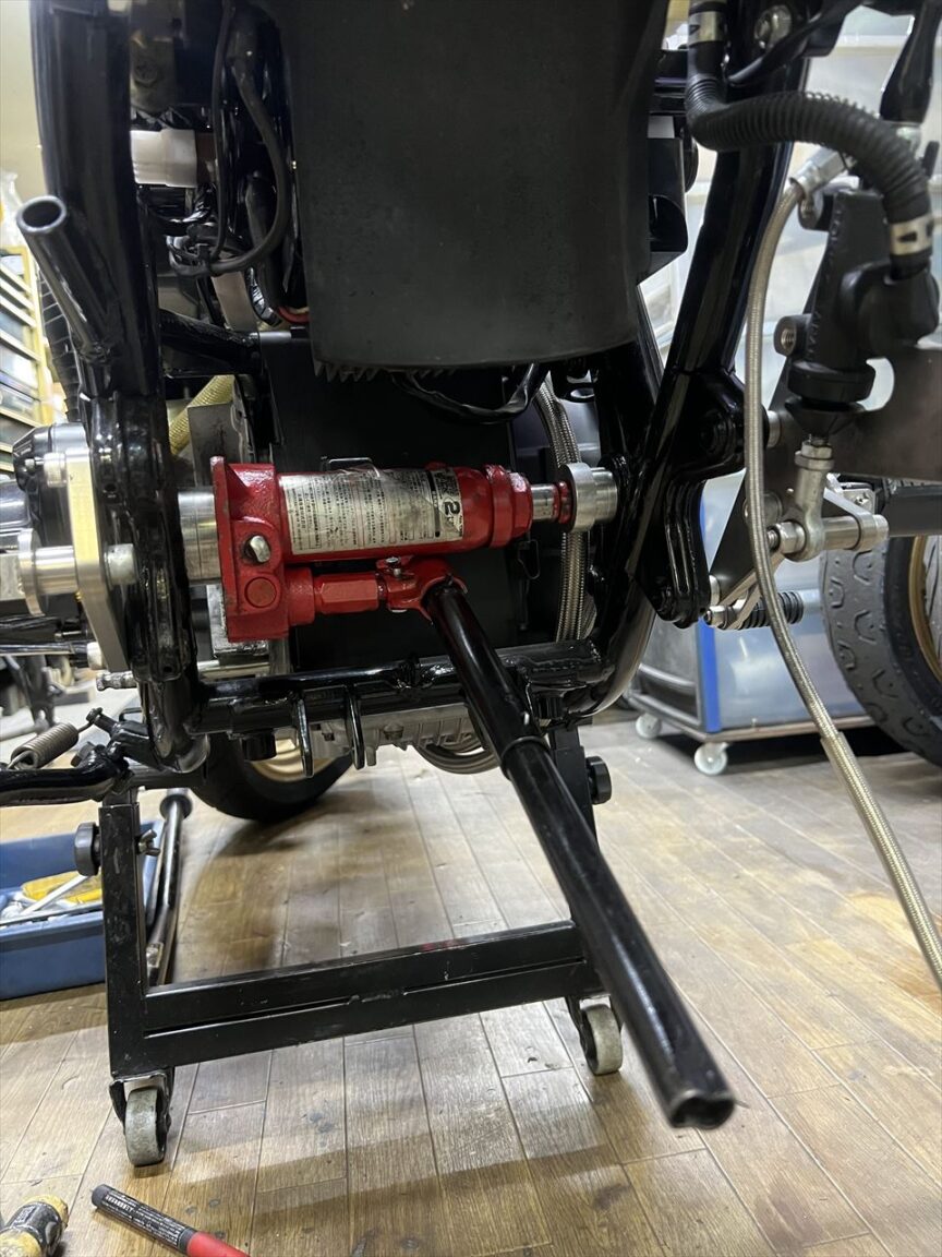 転がし用にこちらの純正加工のスイングアームを入れようとしましたが、フレーム側が狭くて全然入りません。