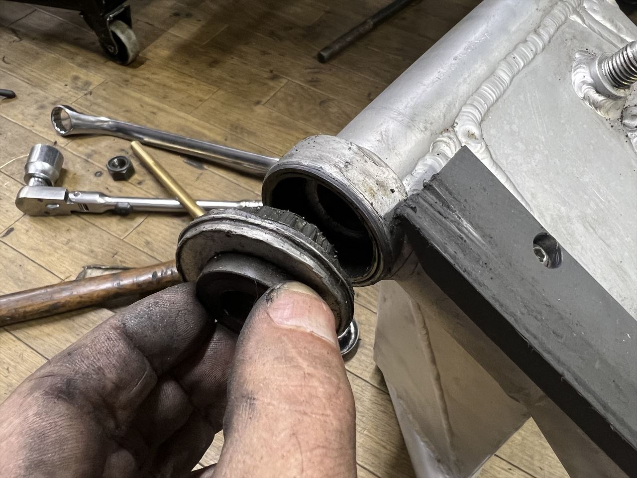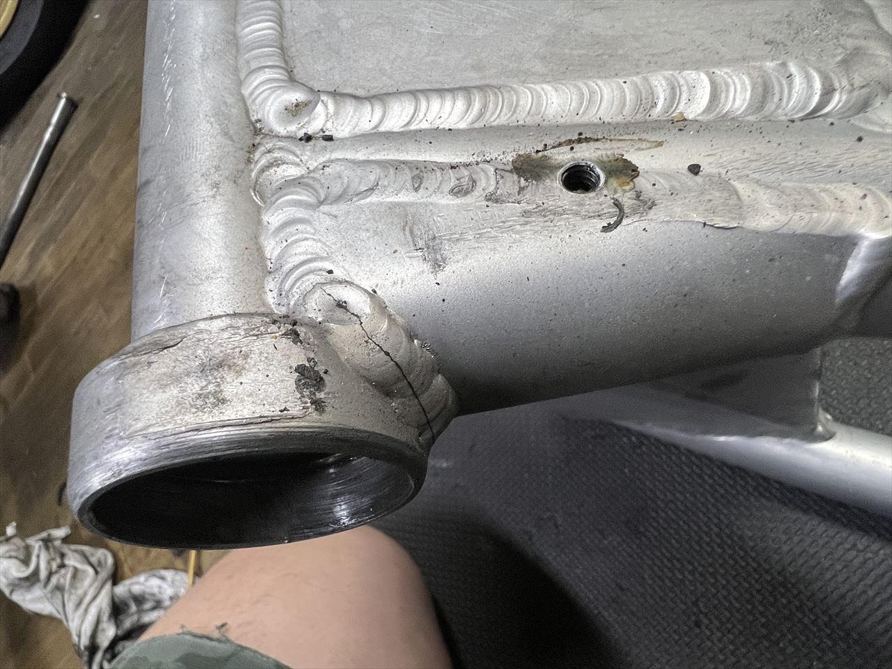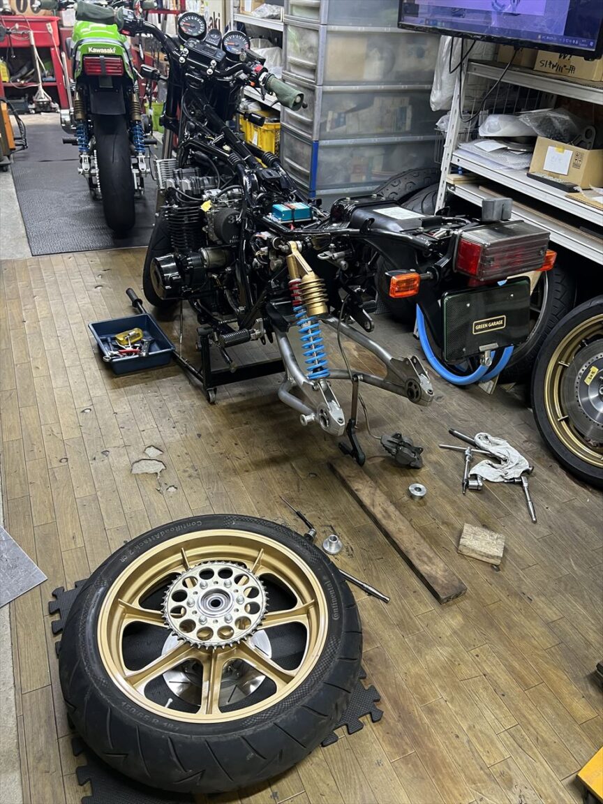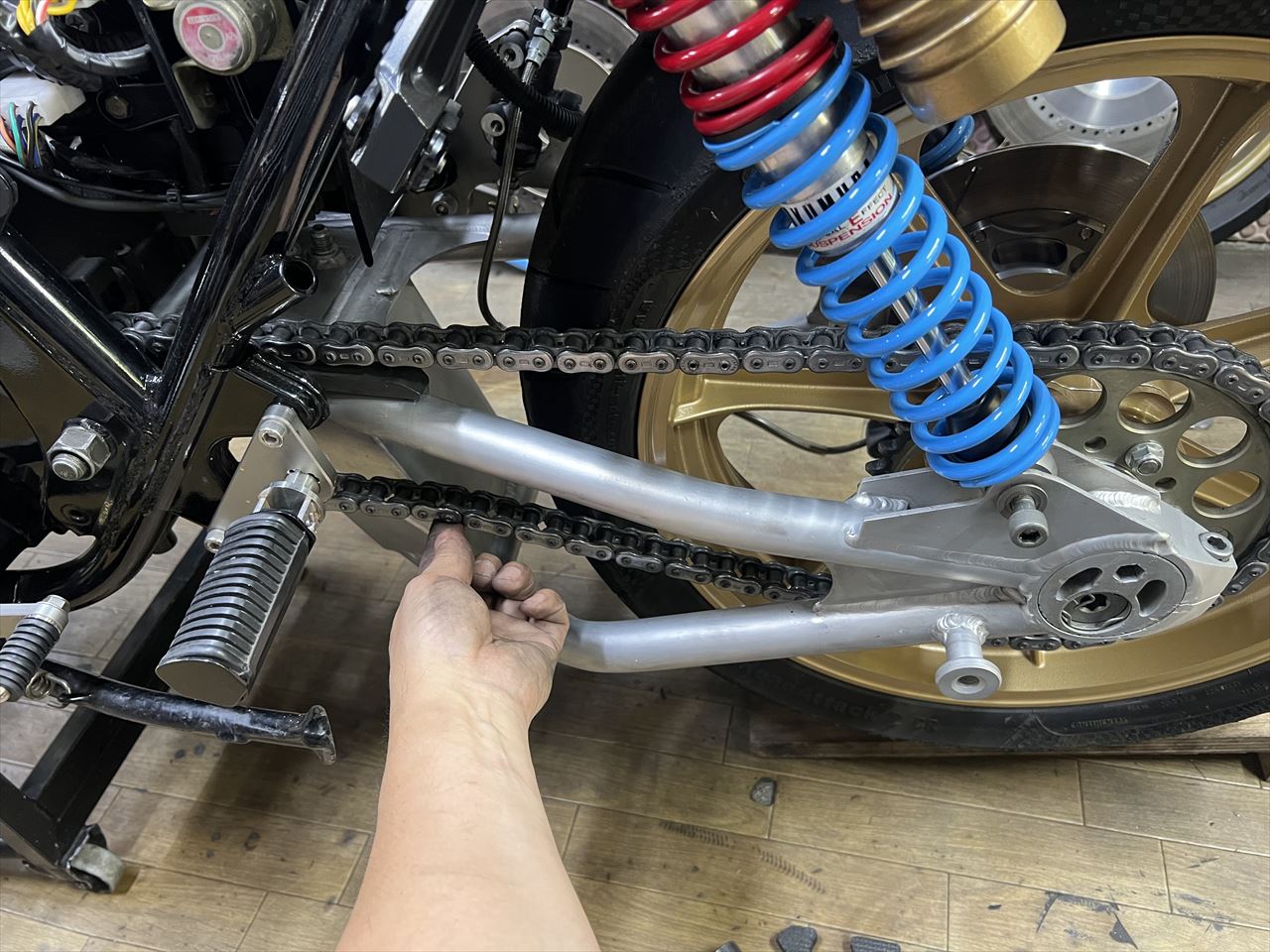 転がし用にこちらの純正加工のスイングアームを入れようとしましたが、フレーム側が狭くて全然入りません。