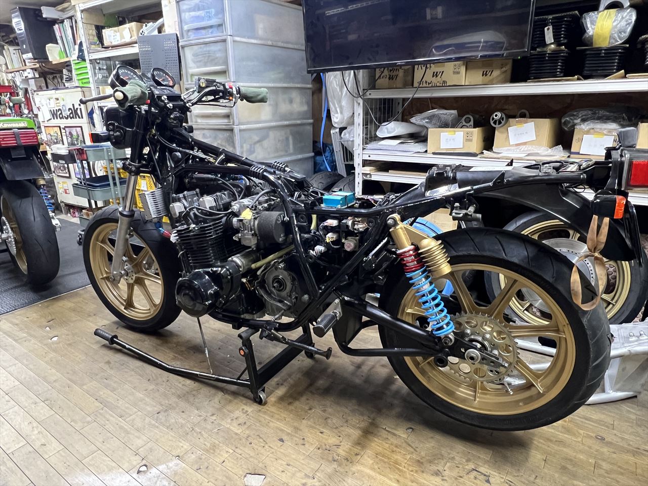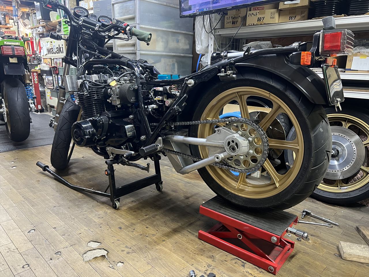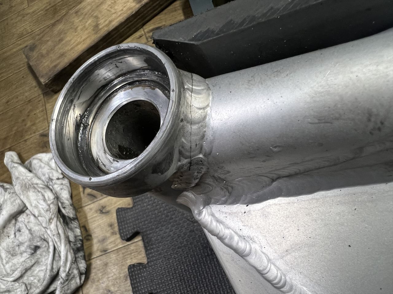 転がし用にこちらの純正加工のスイングアームを入れようとしましたが、フレーム側が狭くて全然入りません。