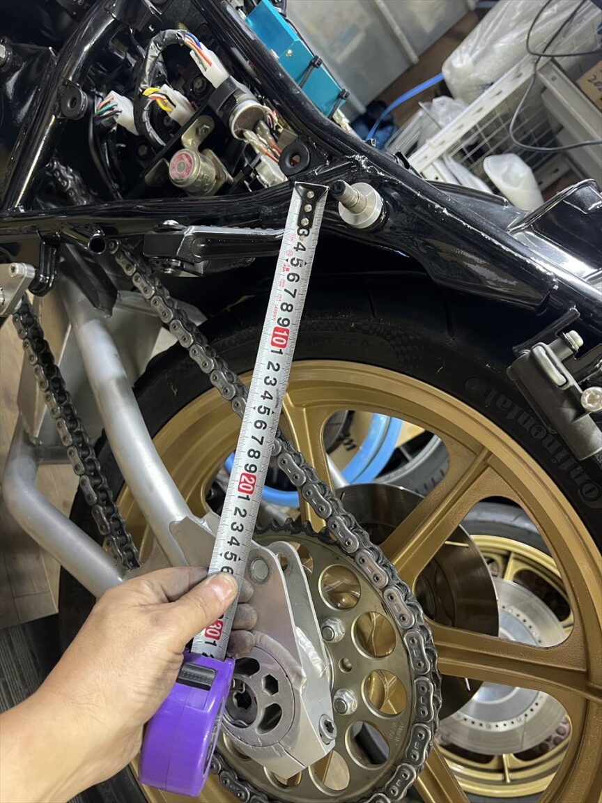 リヤショックを外してリヤホイールを持ち上げます。ミッションのアウトプットシャフト、スイングアームピボット、リヤアクスルの3軸を一直線上にします。これがチェーンが一番張る状態。現状は少し張り気味。この状態で張り過ぎていると、チェーンや3軸のベアリングやハウジングに過大な力が掛かり破損することがあるので要注意。チェーンは絶対張り過ぎてはいけません。
