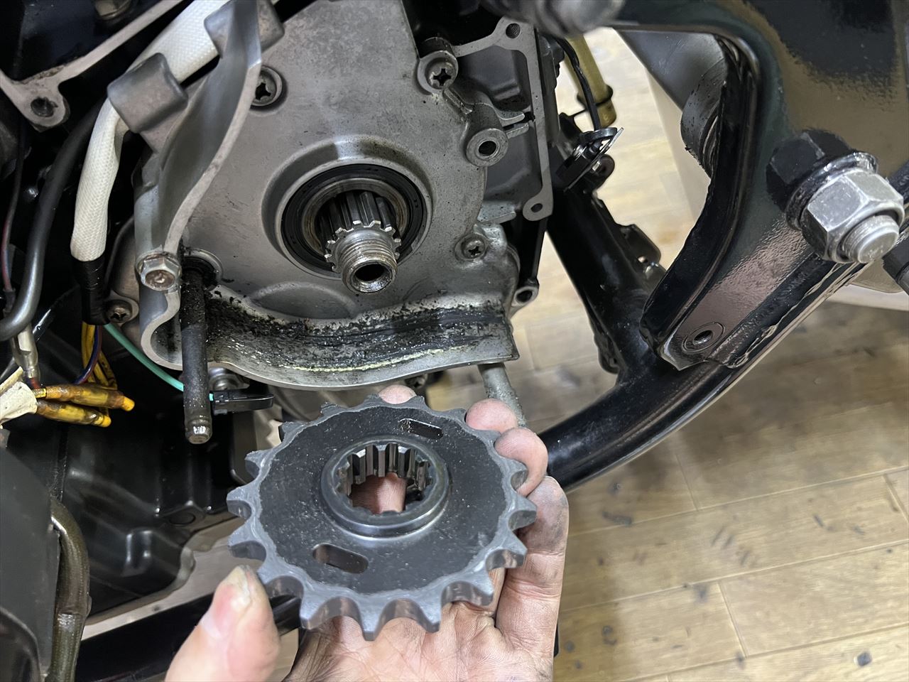 スプロケカバーを外します。スピードセンサーは弊社のものとよく似た構成ですね。