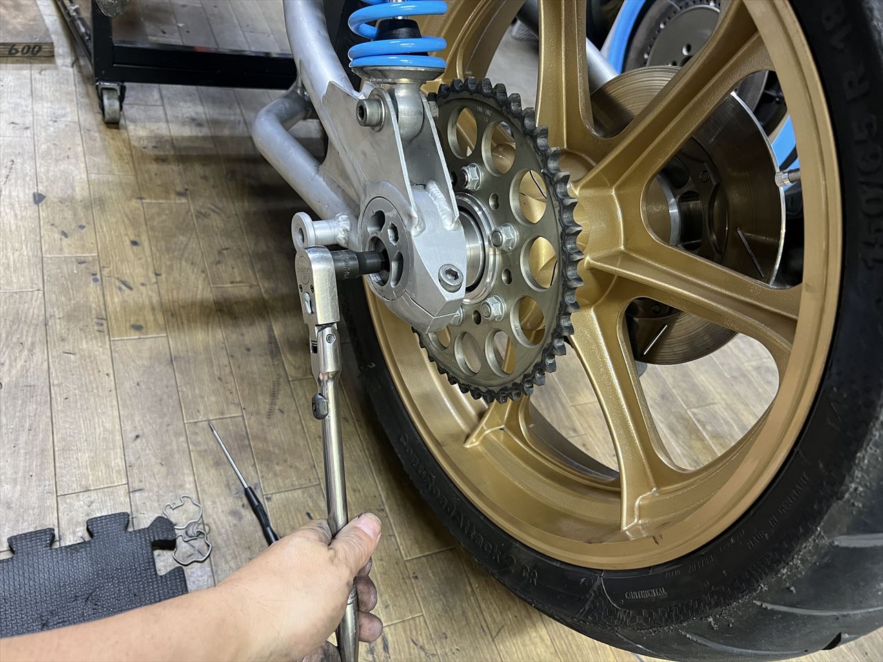 入庫時から気になっていたリヤ周りのガタ。ホイールを左右にゆするとスイングアームピボット辺りにガタがあるのがわかります。