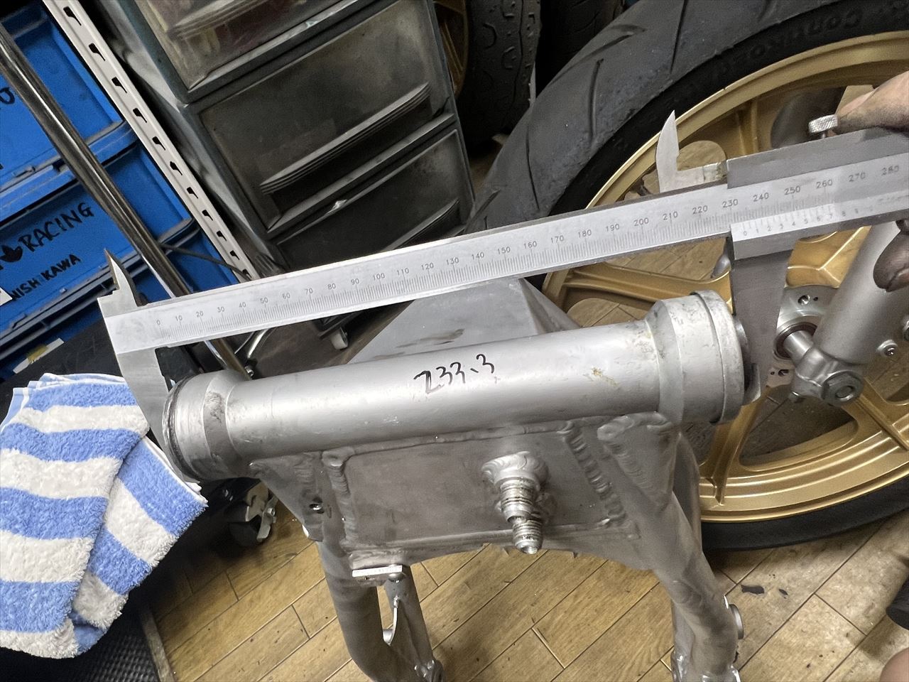 元のスイングアームピボット幅を測ると約233.3ミリです。ノーマルより2.5ミリほど狭いですね。これを取り付けたためにフレーム間隔が狭くなっているようです。