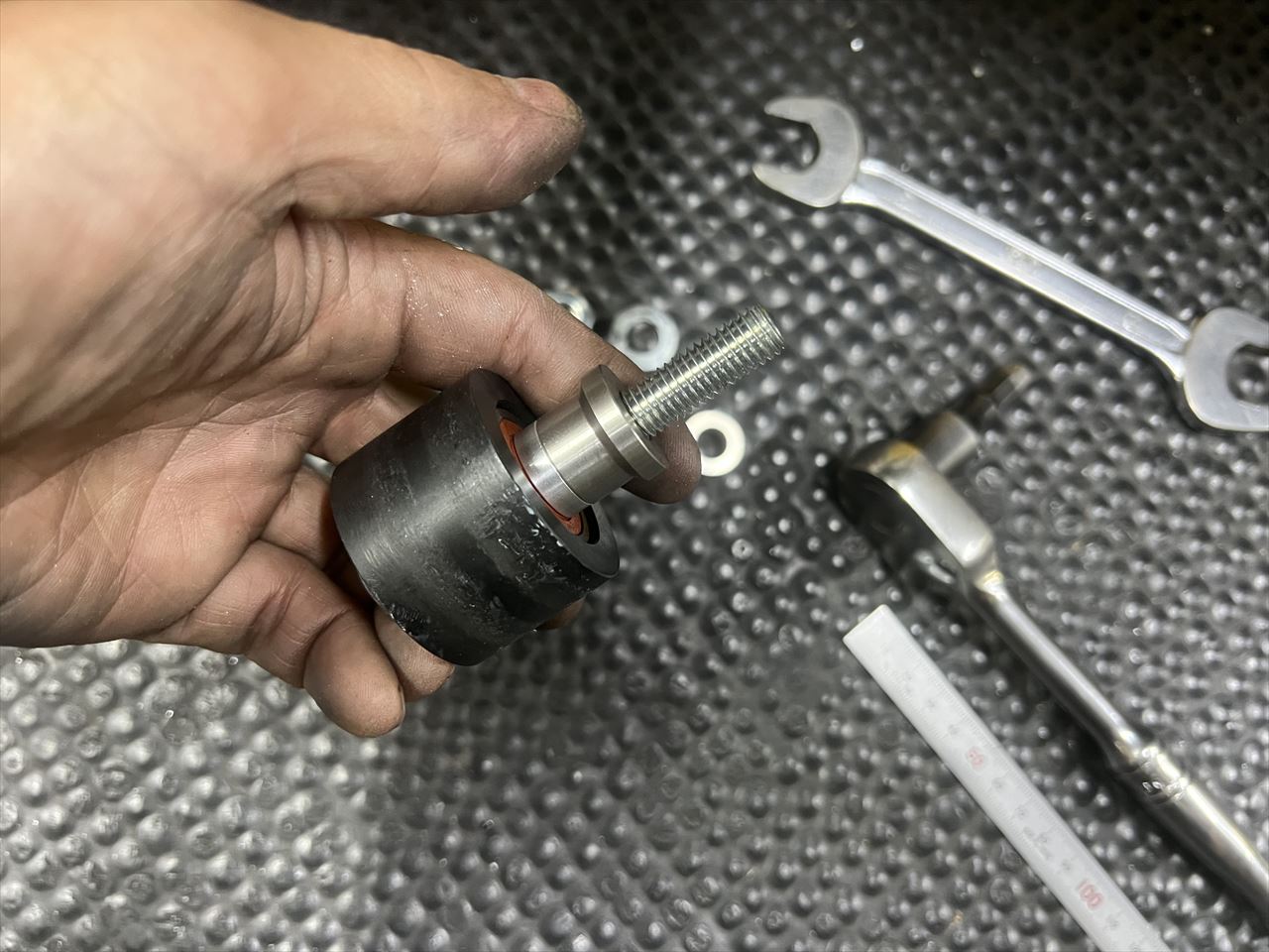 既存のチェーンガイドローラーとのアライメントを確認します。ローラーが少し外寄りなので修正します。