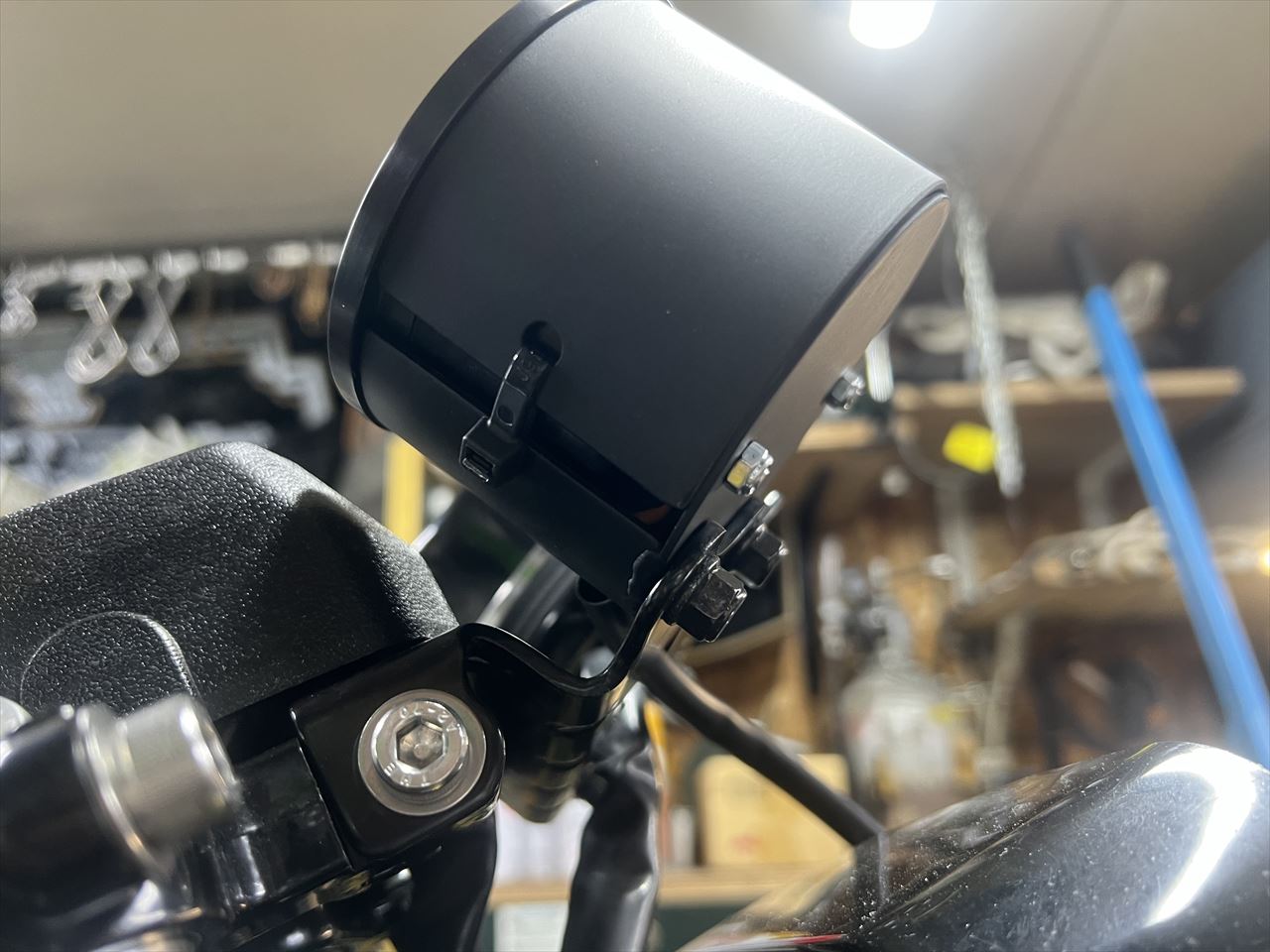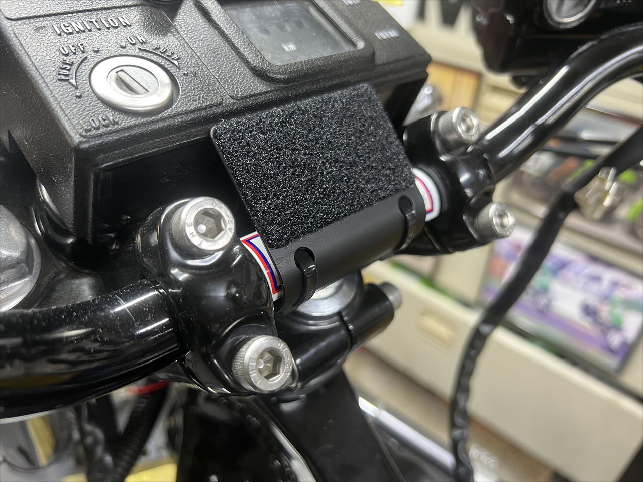 こちらはヨシムラテンプメーター用のステーです。キーシリンダーがオフセットしているのでここはいい位置です。