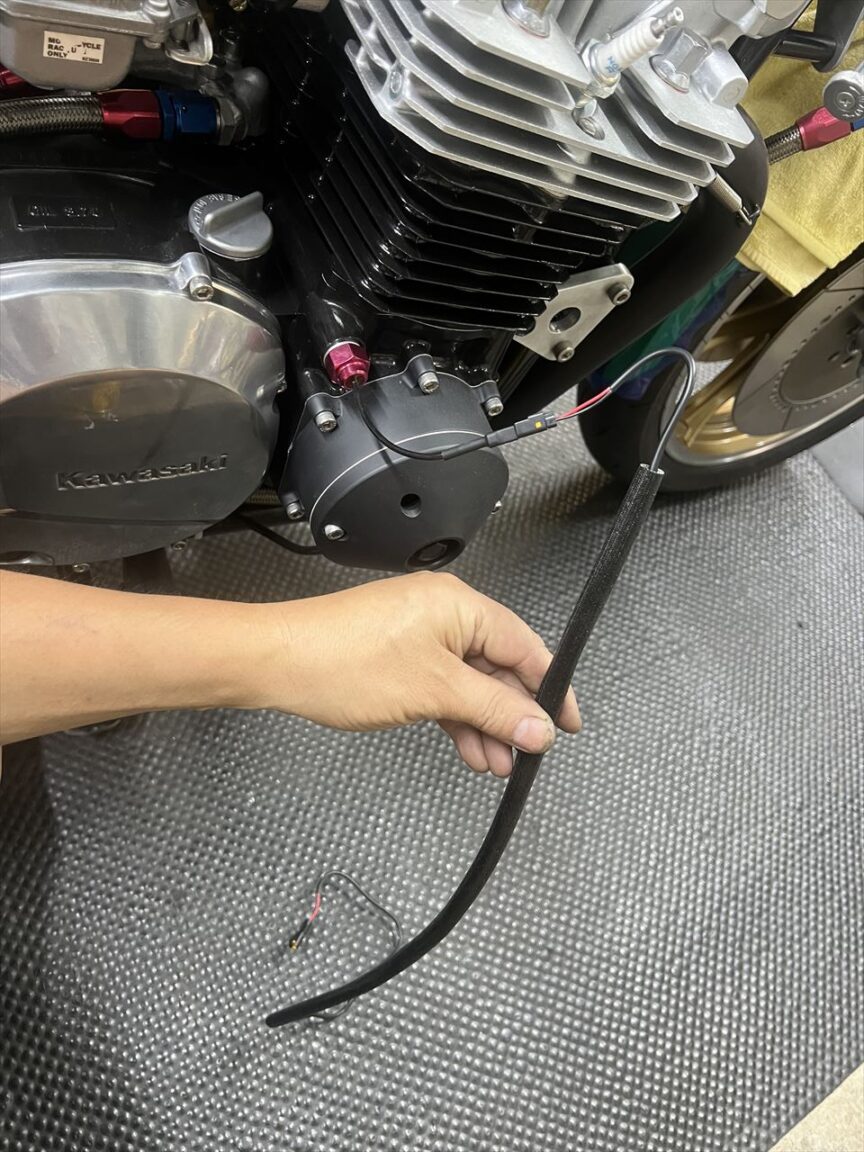 センサーの配線はエンジン付近を通るので、耐熱性の高いガラス編み組みシリコンチューブで保護します。
