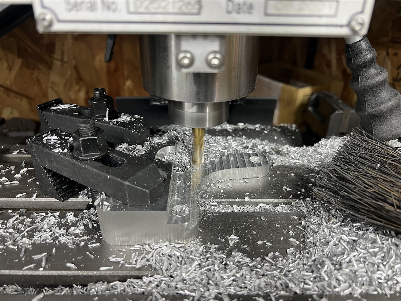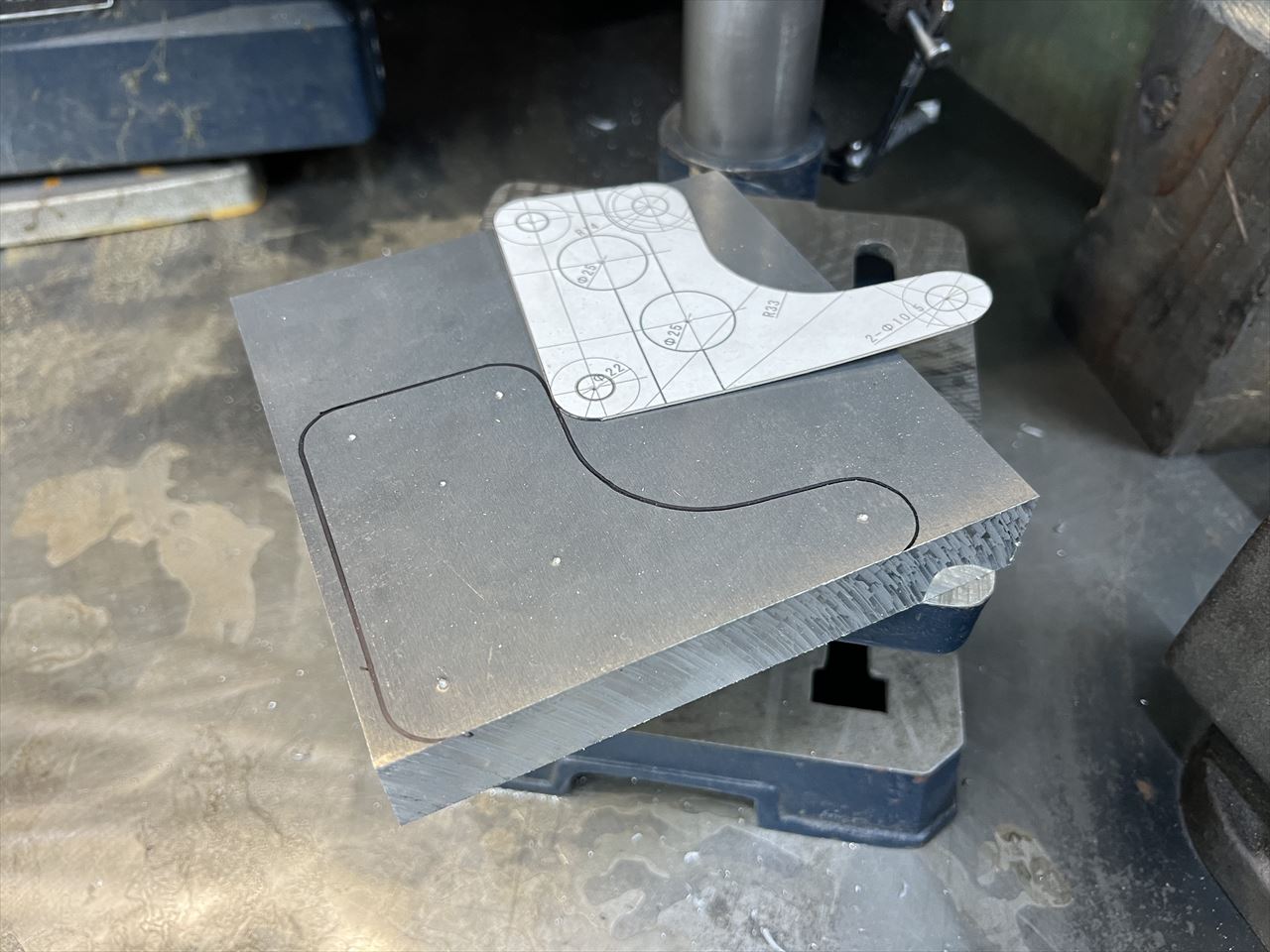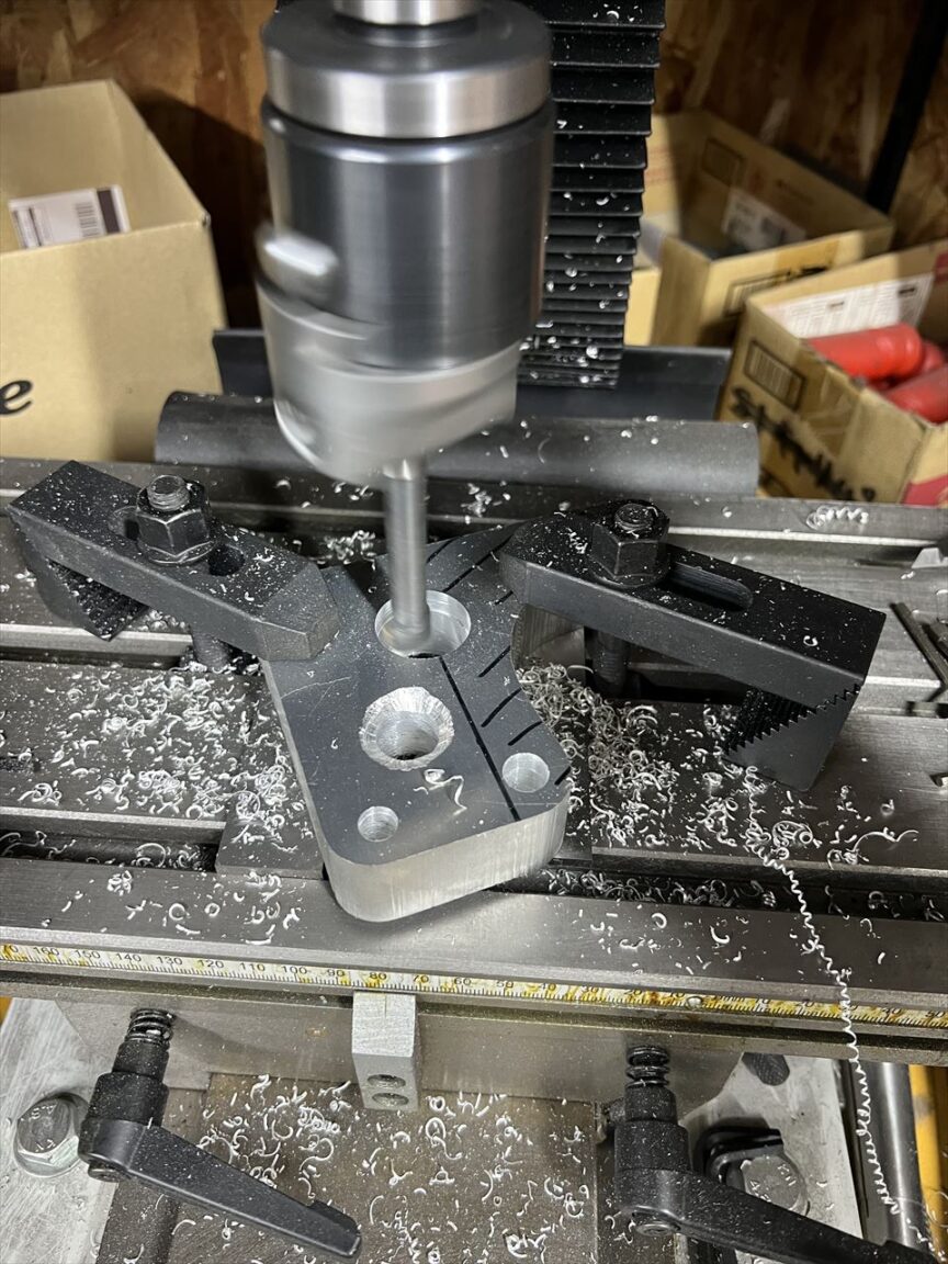 続いてフロントキャリパーサポートを製作します。今回はS1キャリパーに合わせてワークスタイプのデザインで製作します。素材は25ミリ厚のジュラルミン板です。