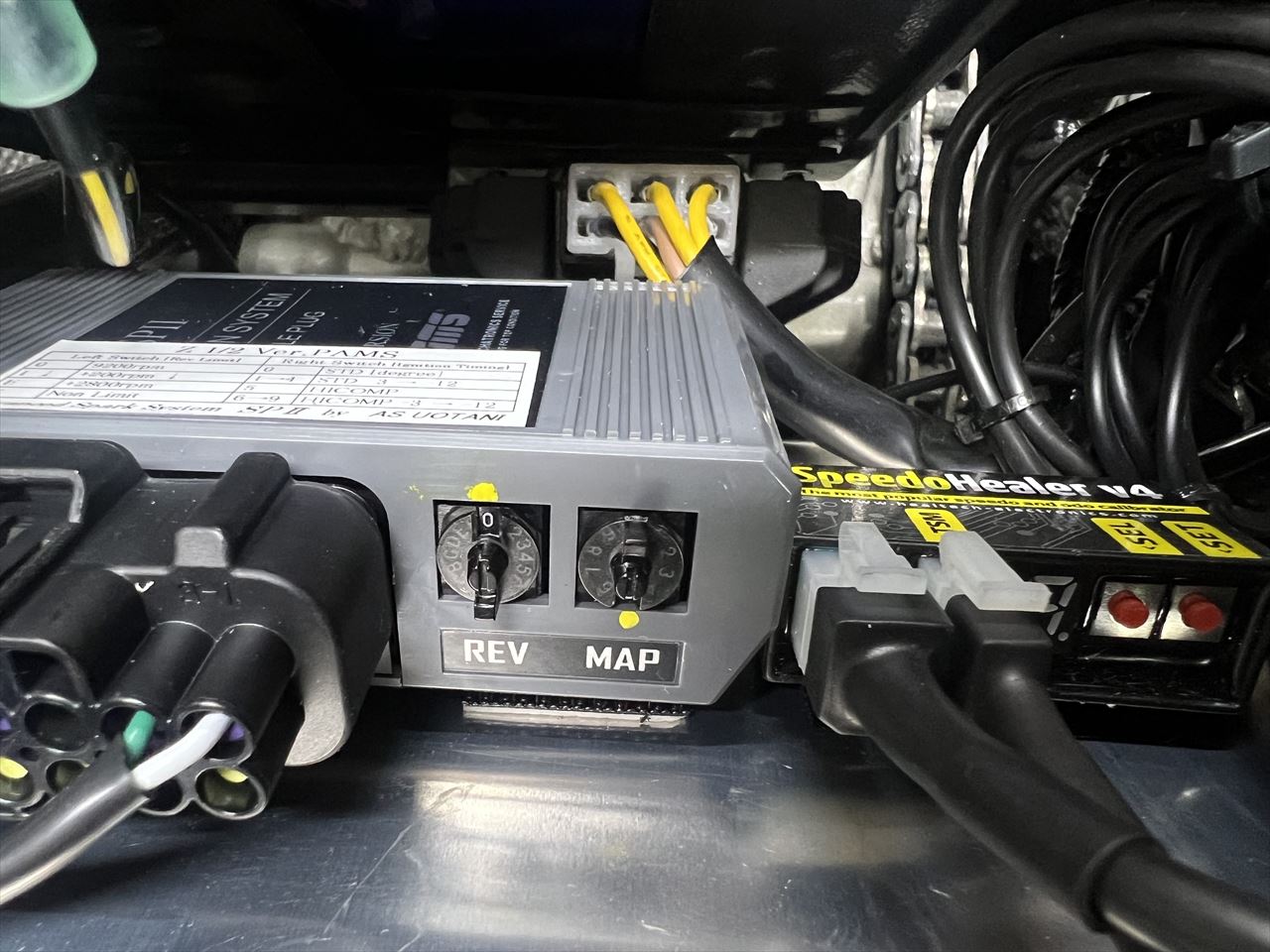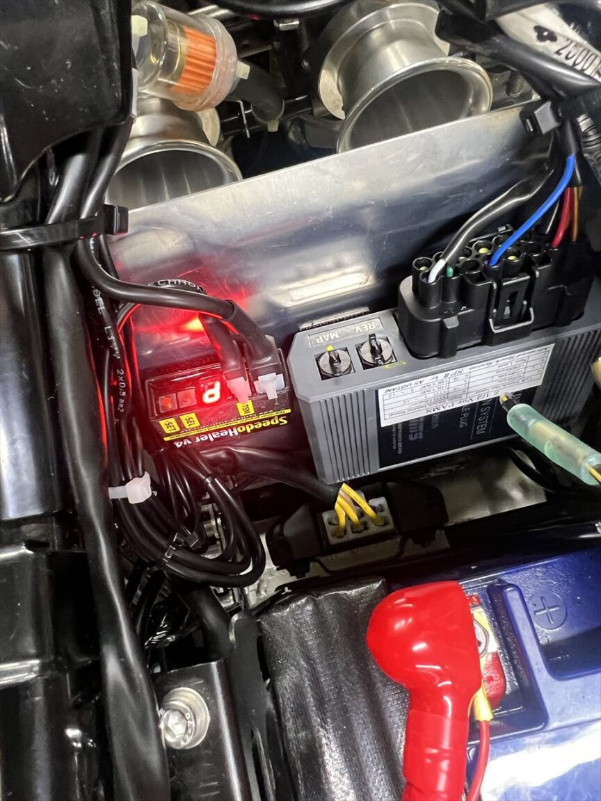 後輪からスピード信号を拾うことになるので、ギヤ比やタイヤ外径に左右されます。キットに使用しているスピードヒーラーは、センサーとメーターの間に設置する周波数変換装置です。任意の数値を入力できるので、スマホのスピードメーターアプリなどを使って実走し、メーターの誤差を補正することができるようになります。