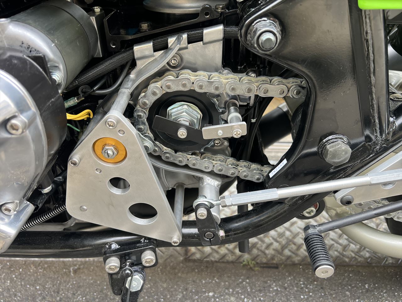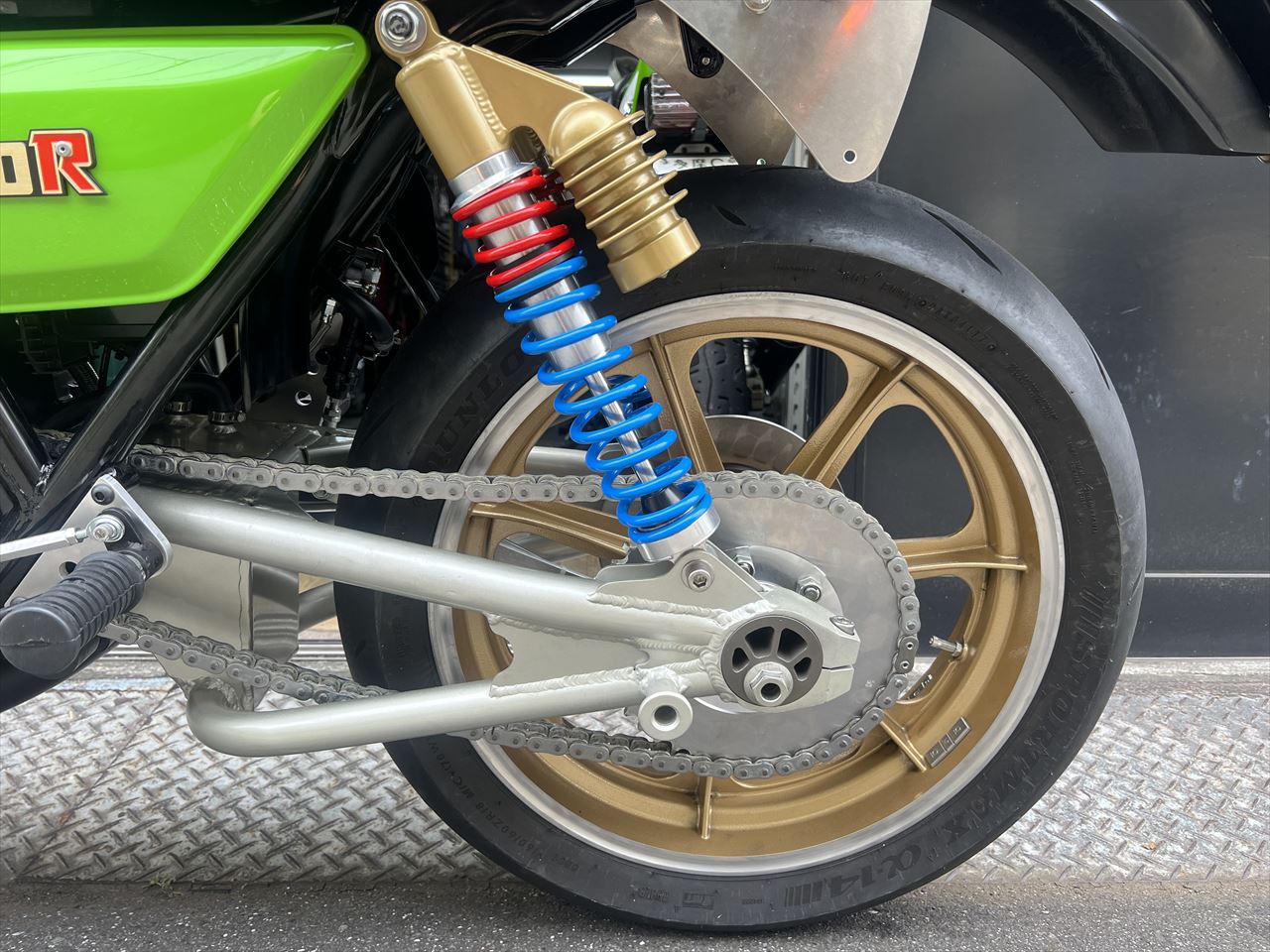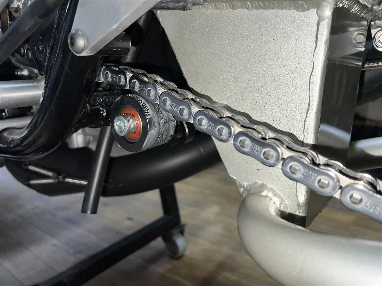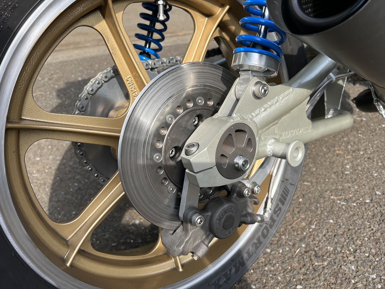 スイングアームはZRX400純正品を改造したもの。剛性と耐久性は必要十分です。