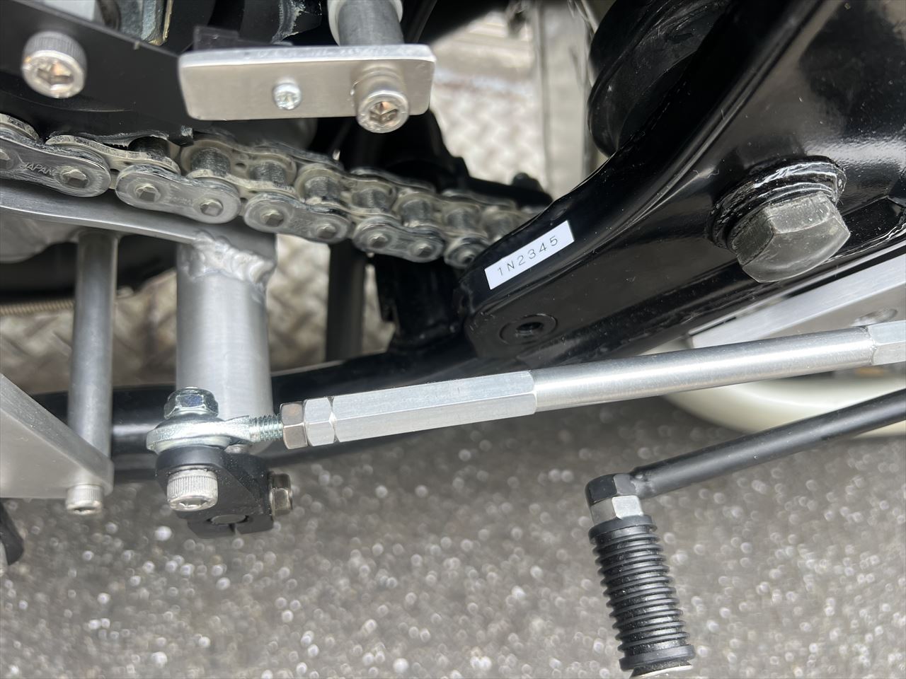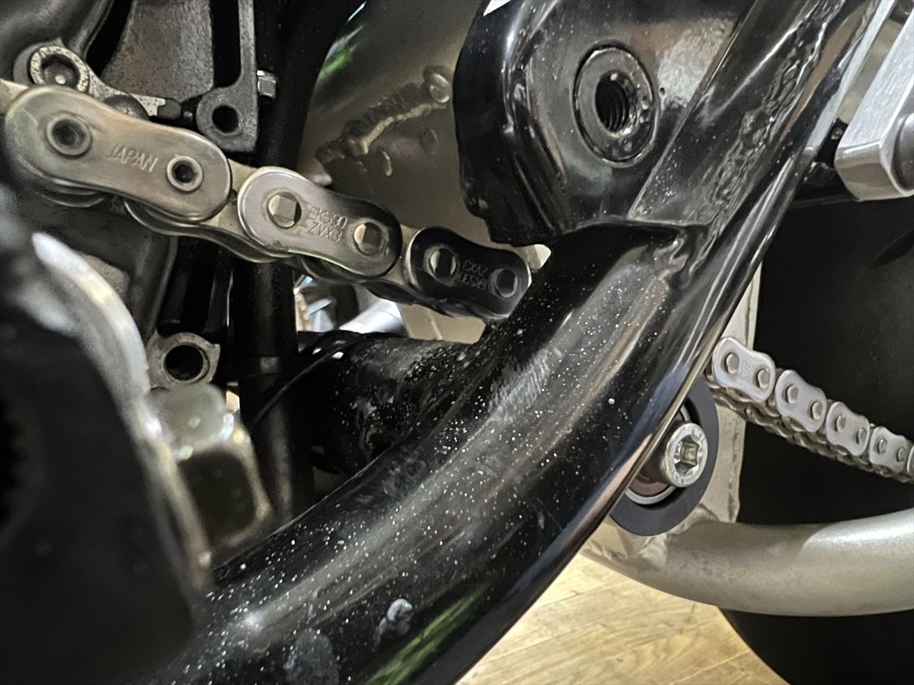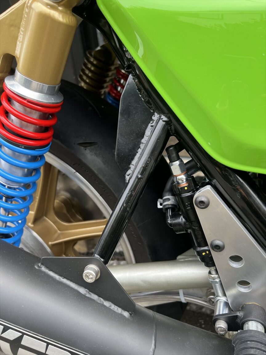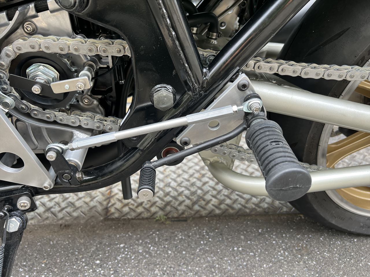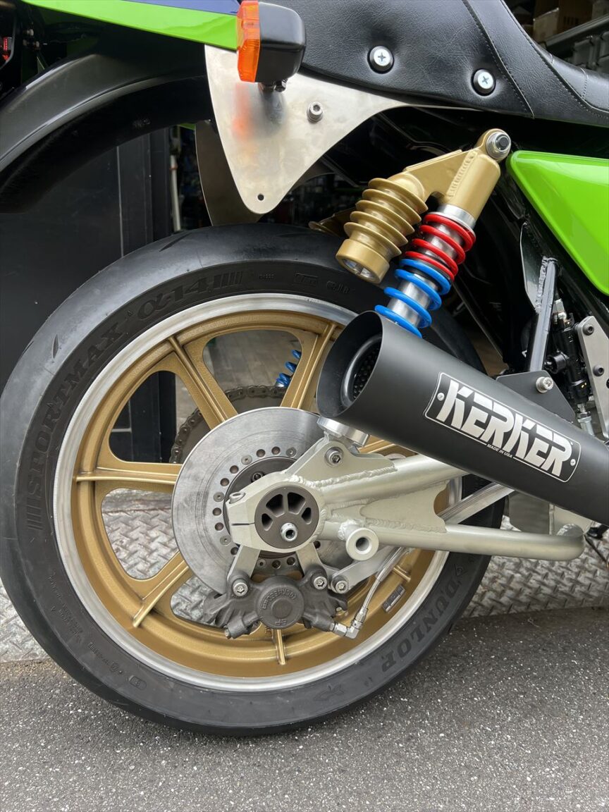 スイングアームはZRX400純正品を改造したもの。剛性と耐久性は必要十分です。