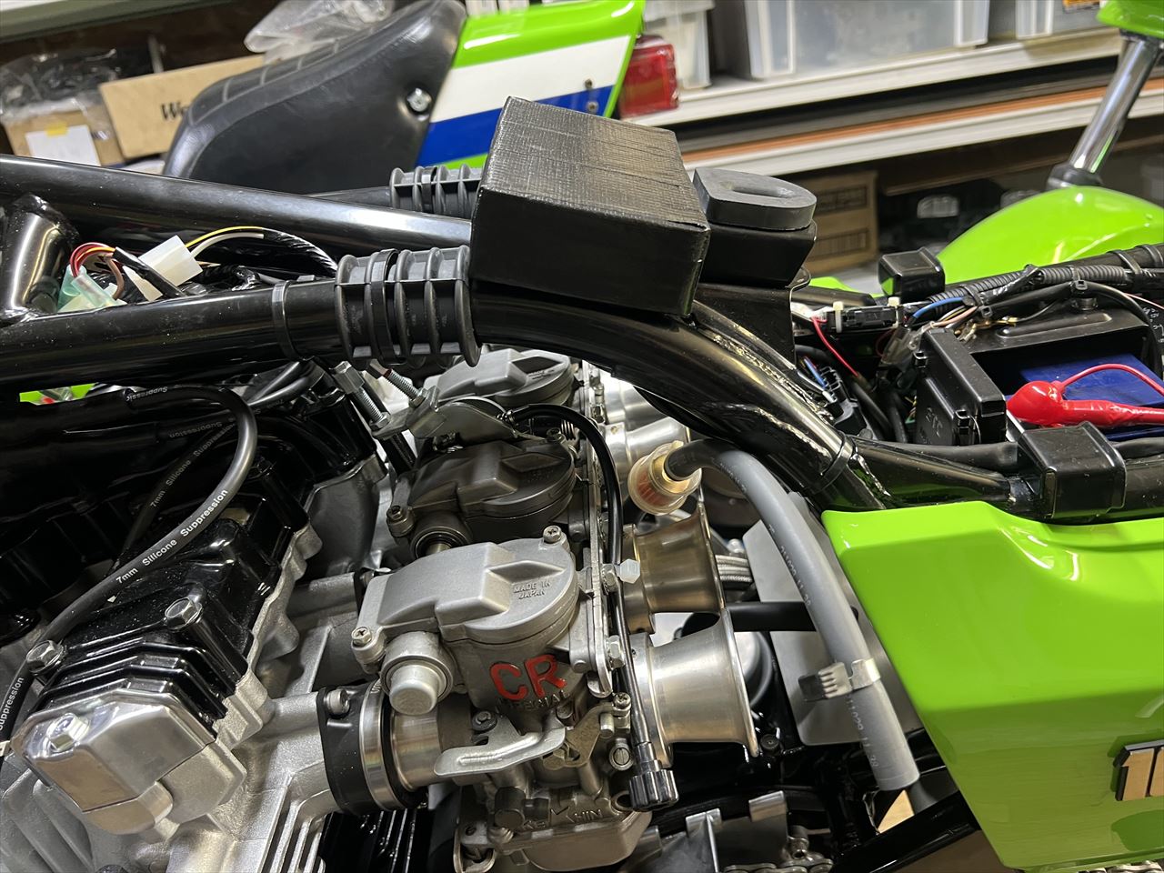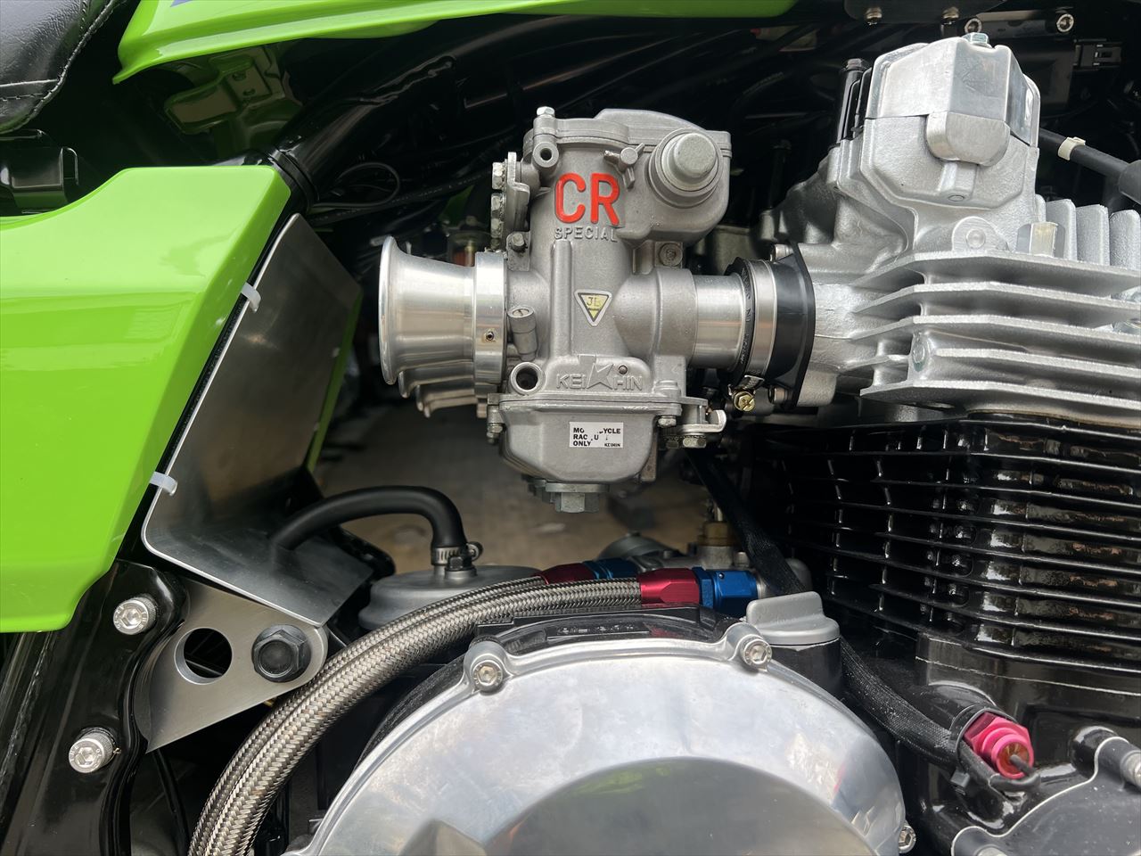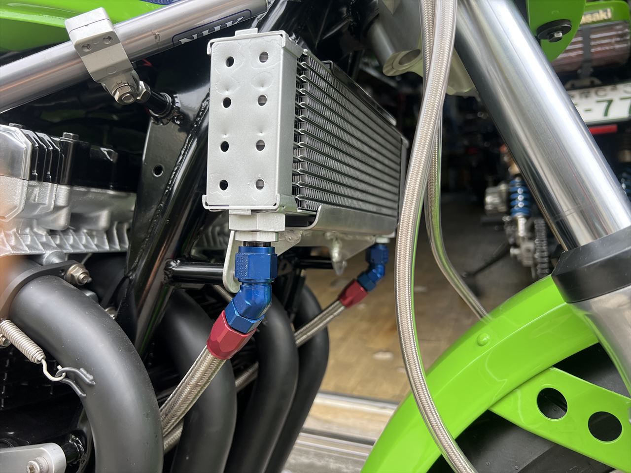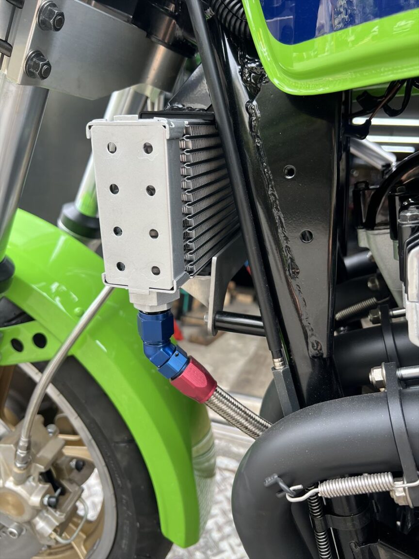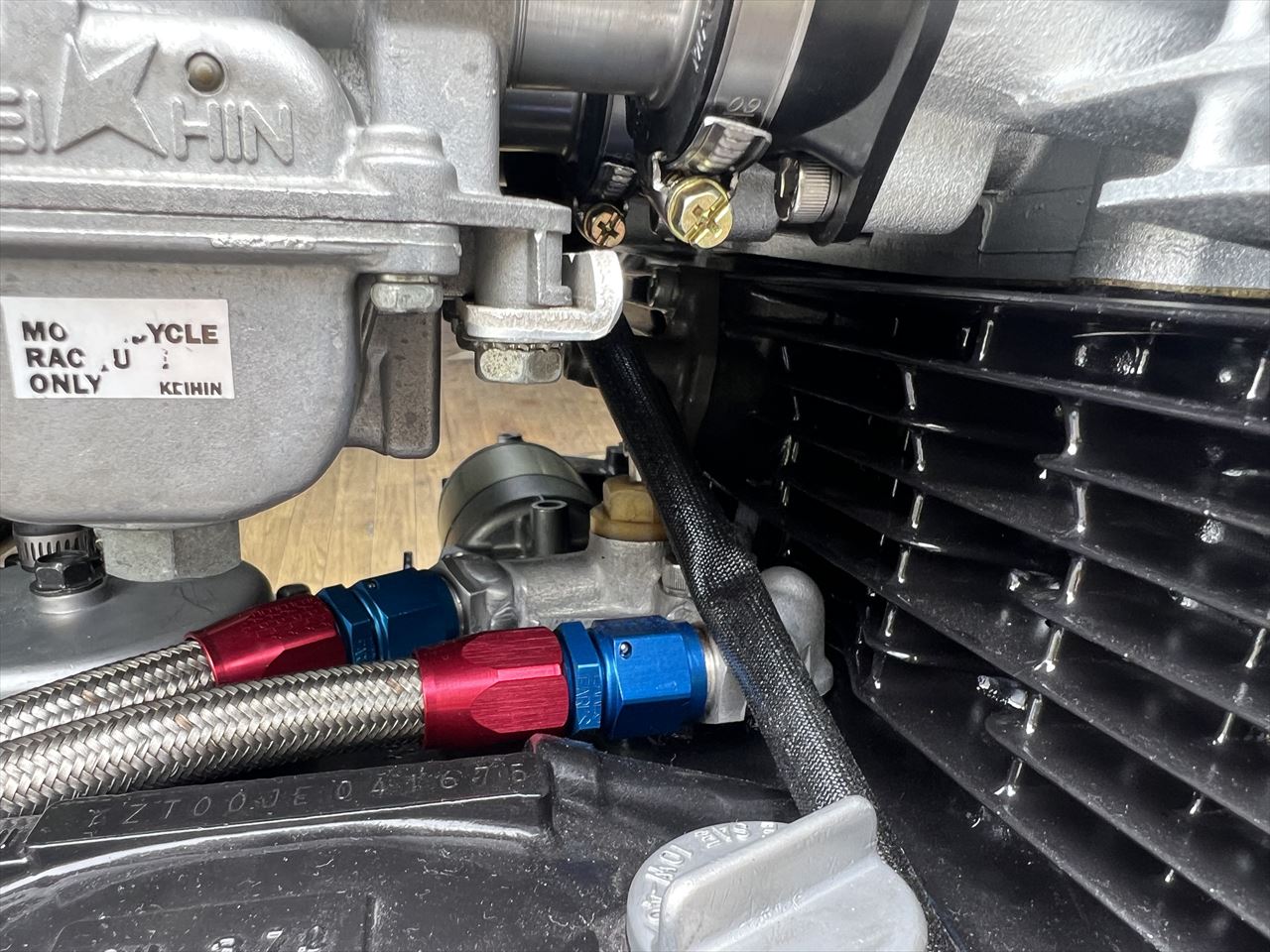 オイルクーラー取出しは弊社独自のノーマル部品改造ロープロファイル仕様。キャブ下の空間が広いので、キャブセッティングにストレスがありません。