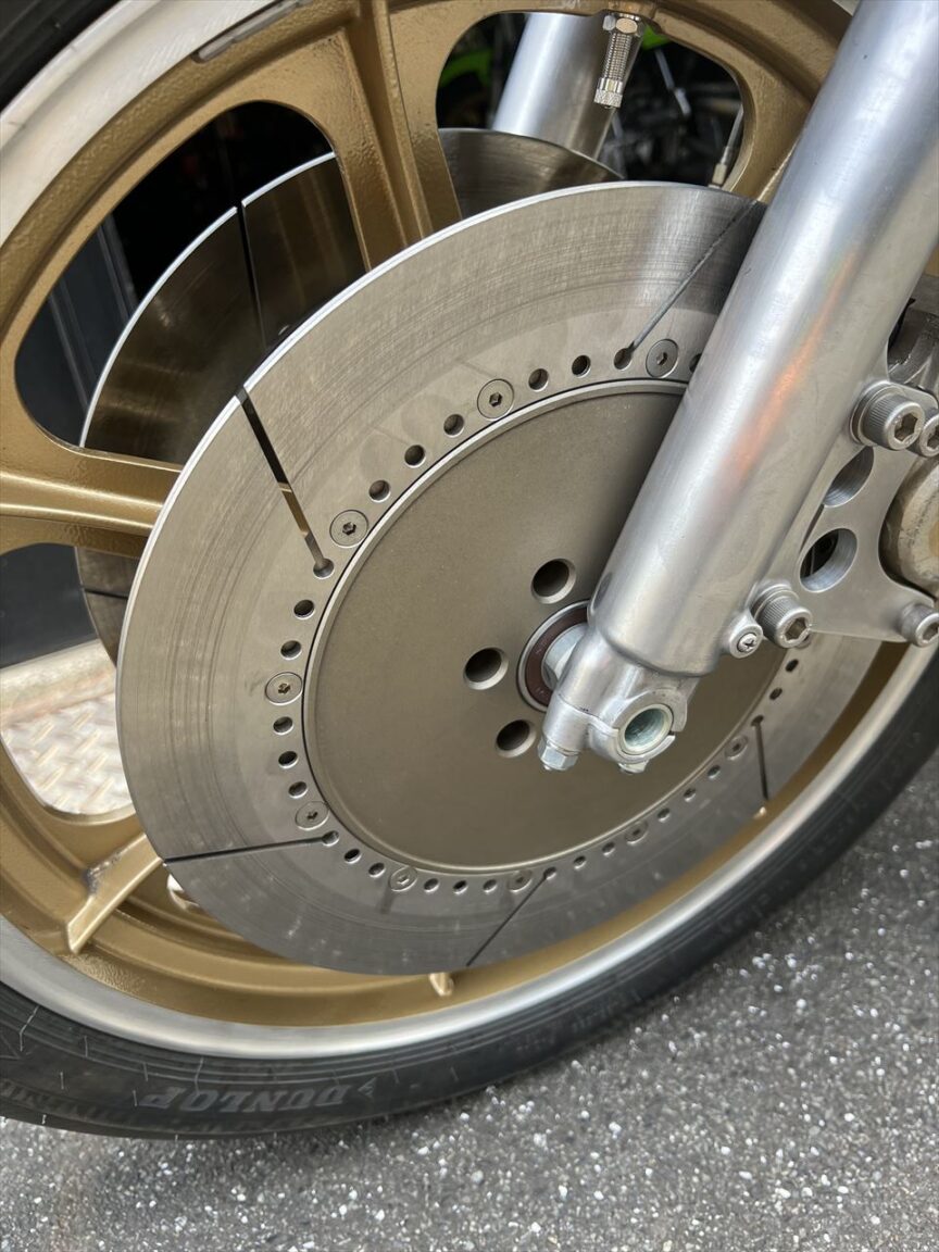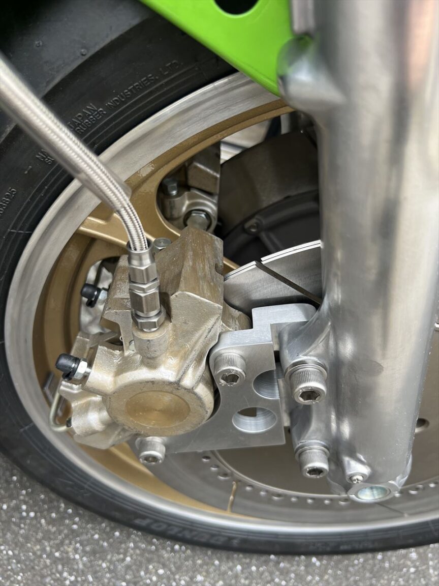 S1キャリパーとサポートの詳細。奥にはインナーローターのリブが見えます。