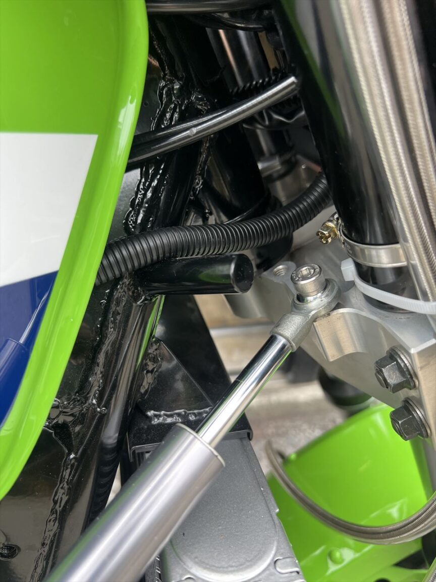 ハンドするストッパーはフレームから突き出したこのバーが受け持ちます。切れ角はやや少な目なので、2車線道路でのUターンはちょっと苦手です。3車線あれば大丈夫。S1ステムとステアリングダンパーはオーナーさんお持ち込み品です。
