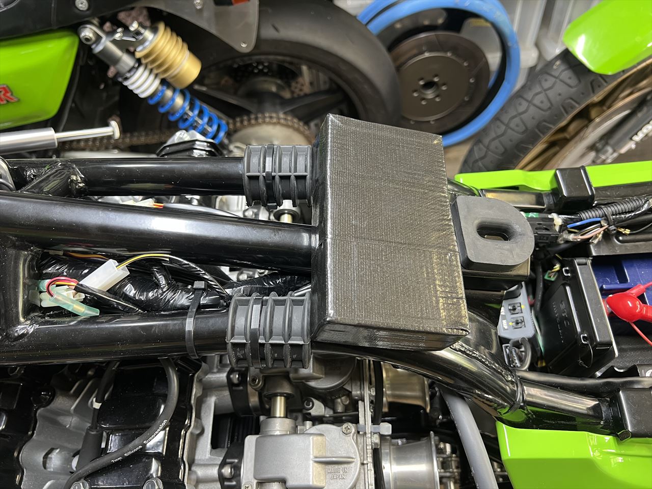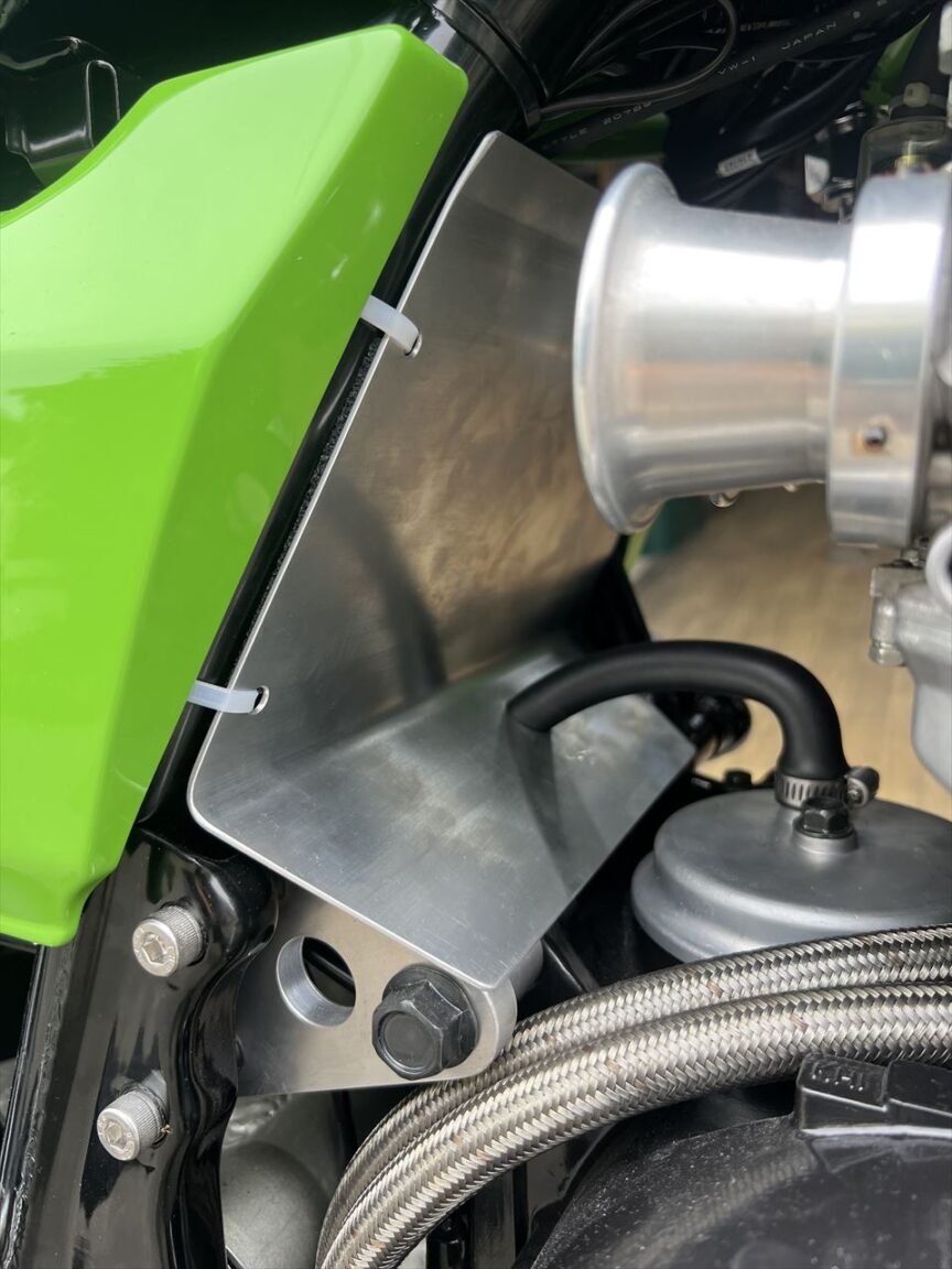 オイルクーラーステーはフレーム直付けとアルミ溶接組み立て品のハイブリッドが特徴のワークスタイプ。新品交換したコアは、サイドの「耳」をカットして8個の穴開け処理を実施。当時風の外観を演出します。