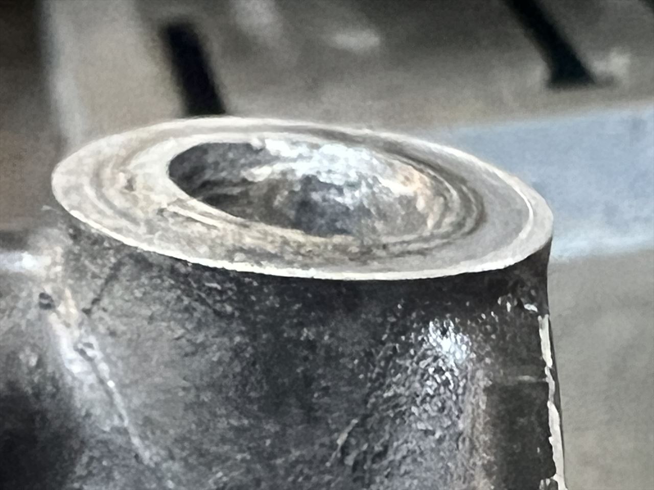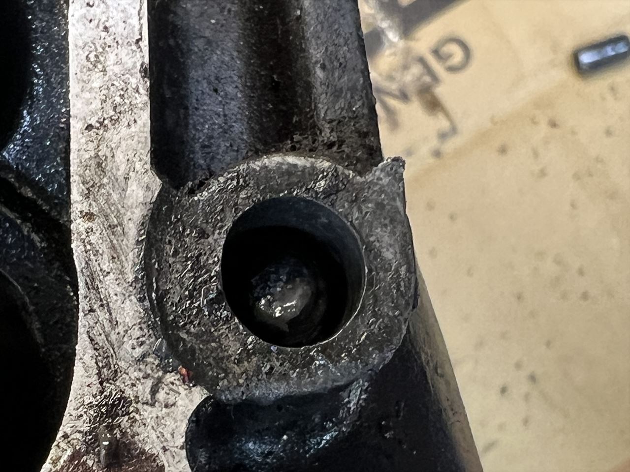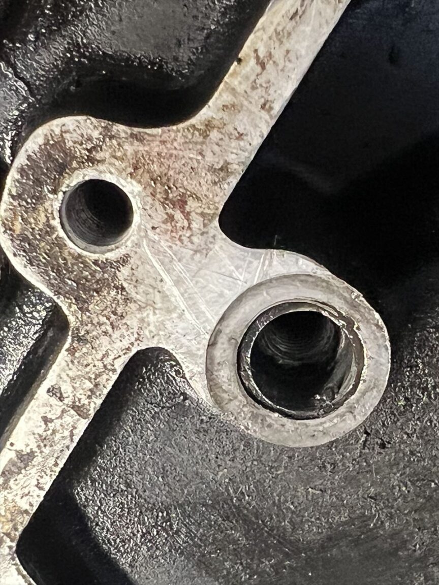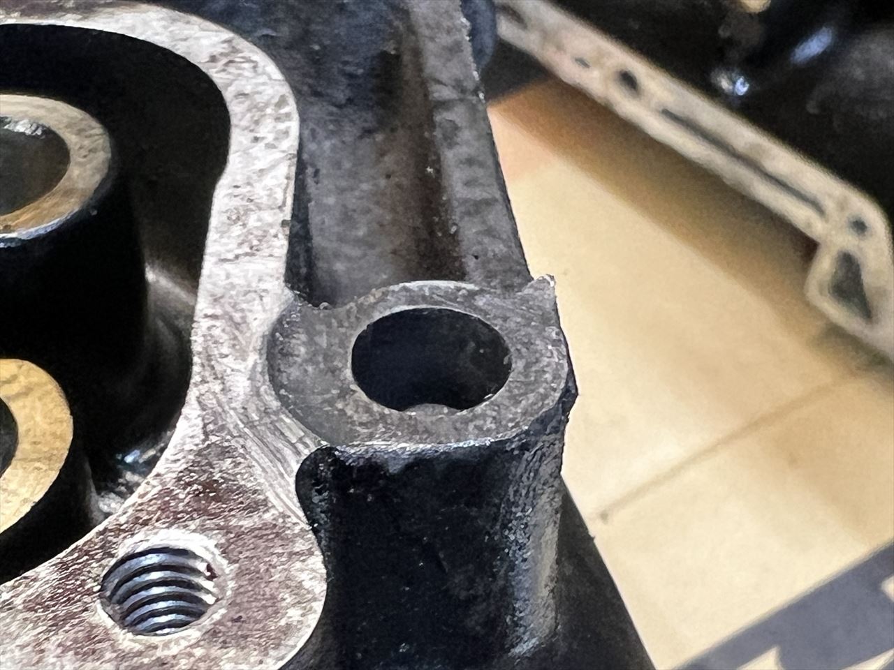 同じスプロケカバーの止め点ですが、前の下側も座面が摩耗しています。ここもノックピンが入るところ。おそらくボルトが折れたまま長年走行を続け、シフト操作の前後力でスプロケカバーが前後に移動し、摩耗が進んだものと思われます。