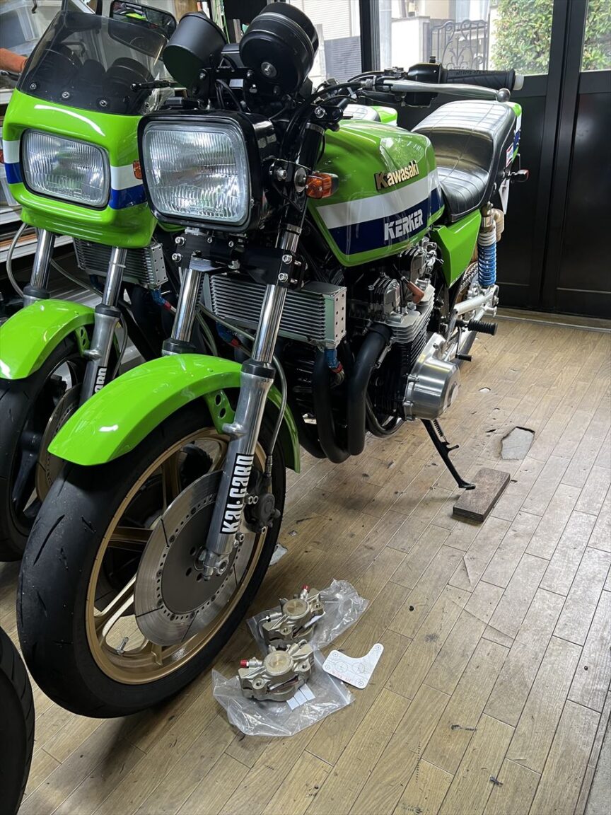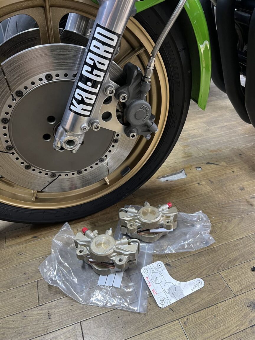 車両をお預かりしてガレージに戻ります。前回納車後に販売したS1キャリパーも一緒にあります。